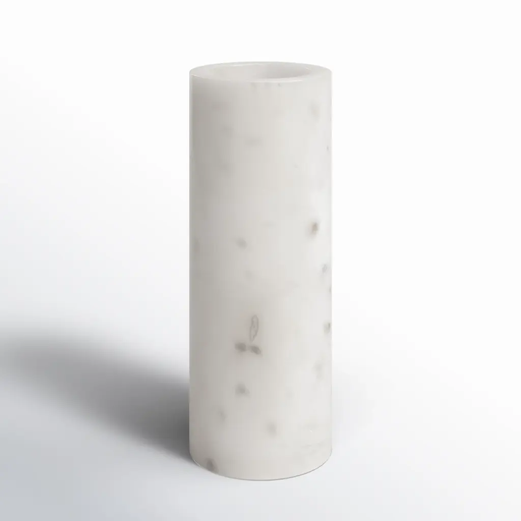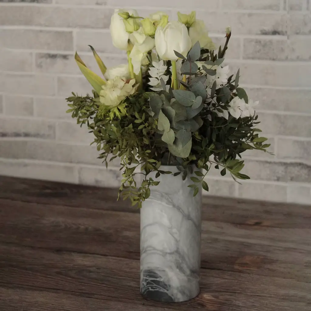 This cylindrical vase is part of a refined series characterized by simple yet iconic designs. The clean geometry of its cylindrical silhouette and the organic purity of gray Bardiglio marble merge in this sculptural piece to create a singular object that will make a statement in any modern home.