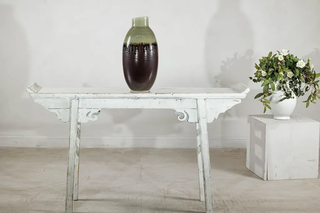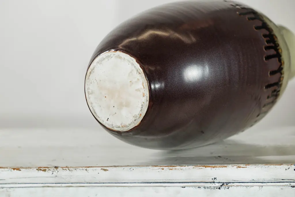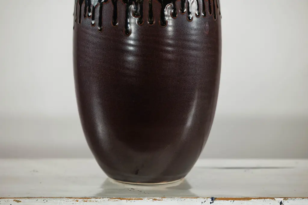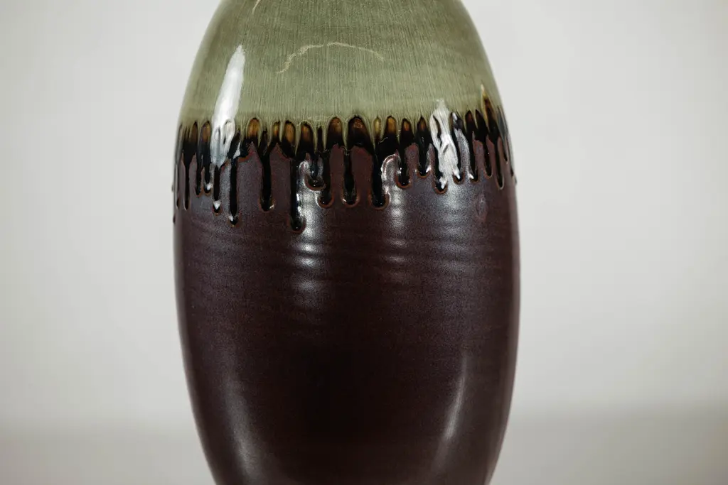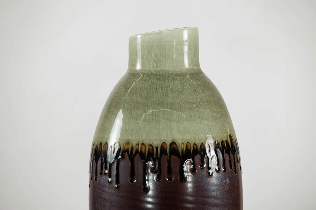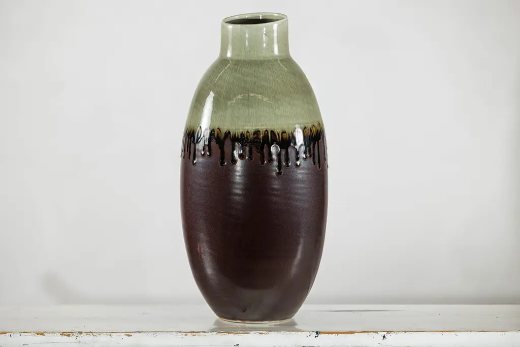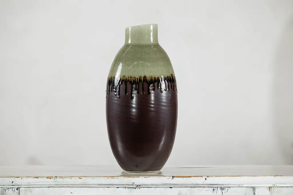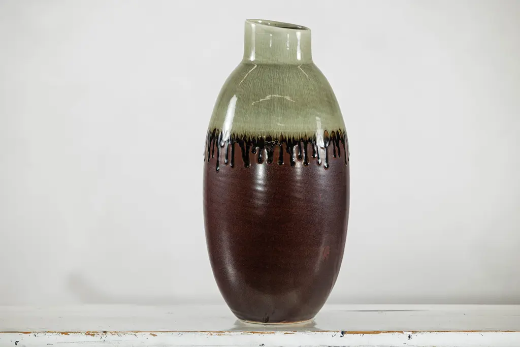 Striking in both palette and silhouette, this tall ceramic vase presents a distinctive two-tone glaze that merges a soft celadon-toned upper half with a deep, chocolate brown lower body. The two fields are separated by a bold drip-glaze transition, where dark streaks cascade downward in an organic pattern, creating a sense of movement and depth. The rounded form tapers gently toward the base, while the rim is subtly slanted—an off-kilter gesture that adds sculptural interest without disrupting the vase’s clean lines. The opening is 4 inches in diameter. The surface of the lower body bears faint horizontal lines from the throwing process, visible beneath the glossy glaze and contributing to the object’s tactile quality. The glaze on the upper portion is slightly translucent, revealing vertical striations that catch the light differently depending on the angle. Displayed alone or in a group, this piece offers both decorative presence and understated elegance. Perfect for a console table, open shelf, or entryway vignette, it brings a sense of balance between earthiness and refinement.