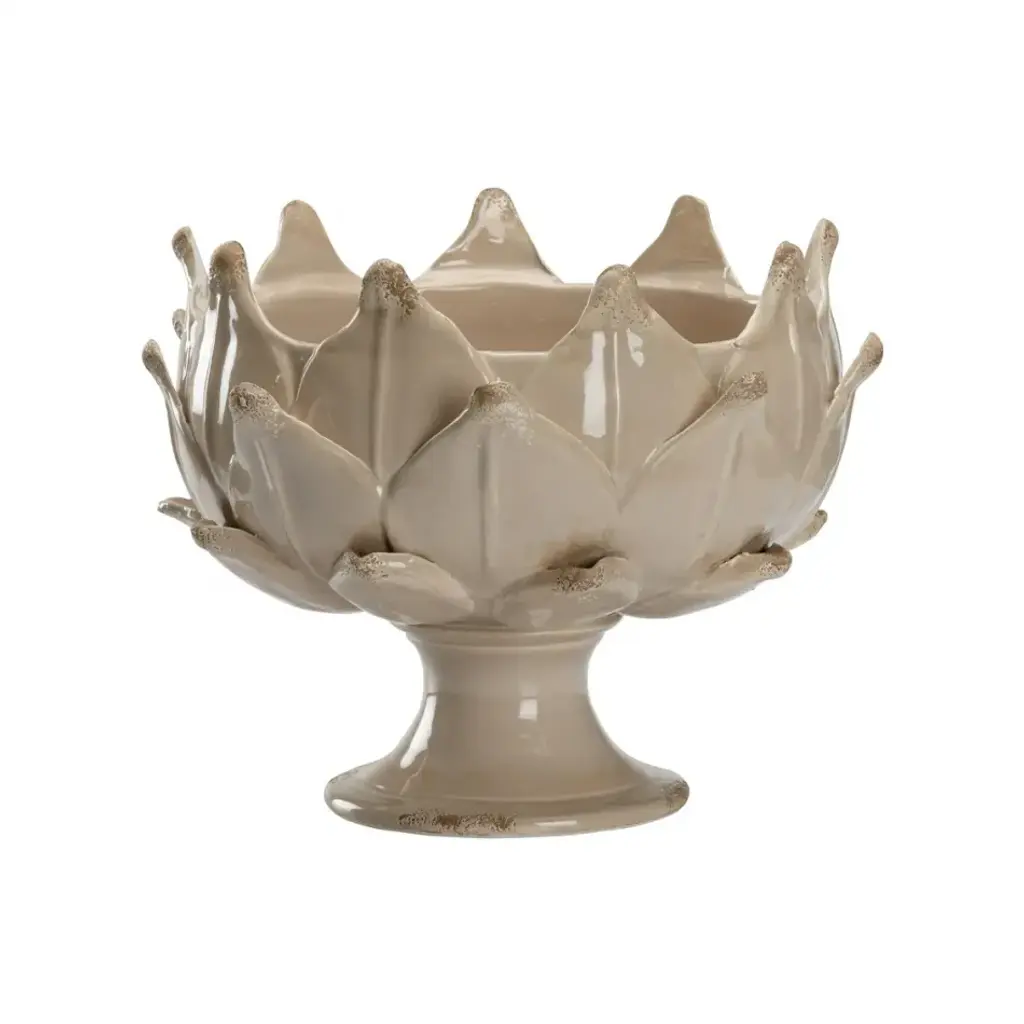 Porcelain. Glossy Green. Worn Dark Green Glazed Porcelain Artichoke Leaf Bowl With Base. 14.5W X 14.5D X 11.5H