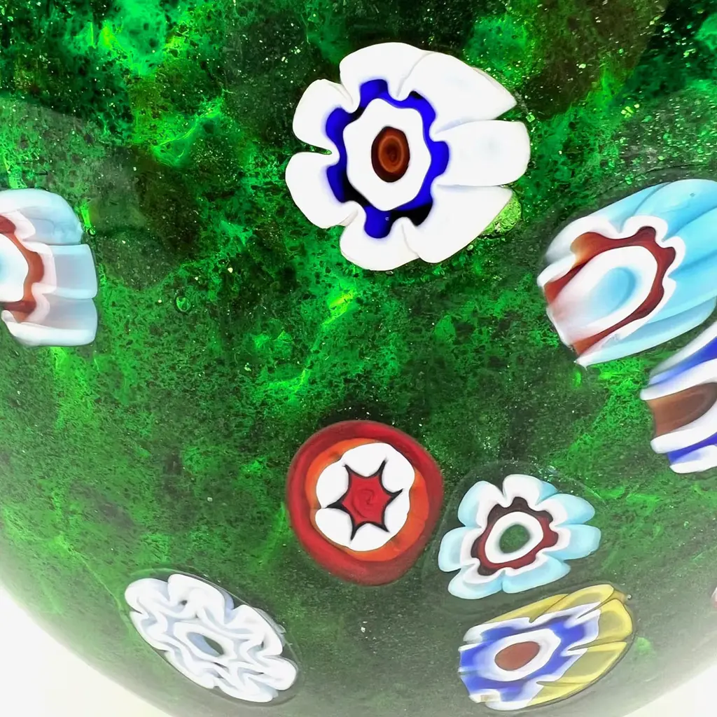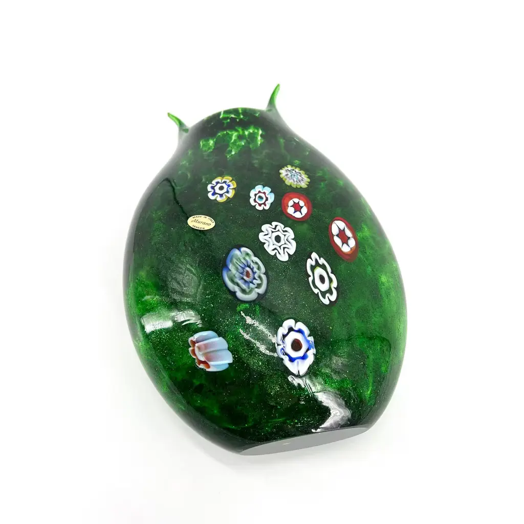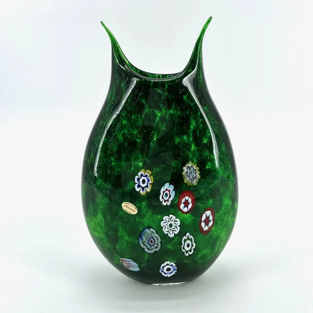 Boasting a captivating, somewhat hypnotizing shade of forest green, this stupendous vase is deftly handmade of Murano glass, enriched with precious Murrine decorating its sleek and singular surface. Its sinuous shape enhances the uniqueness of this piece. It comes with an authenticity certificate. Please consult the Concierge for further information.