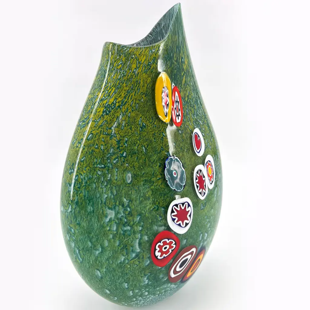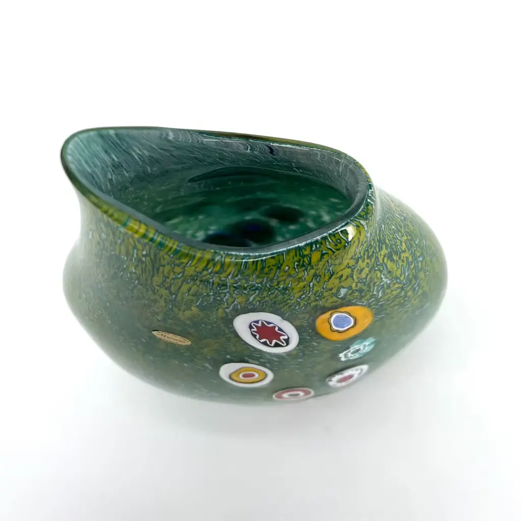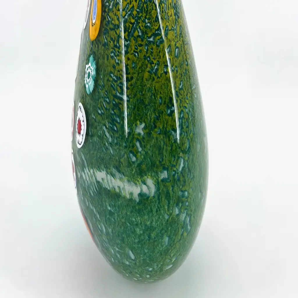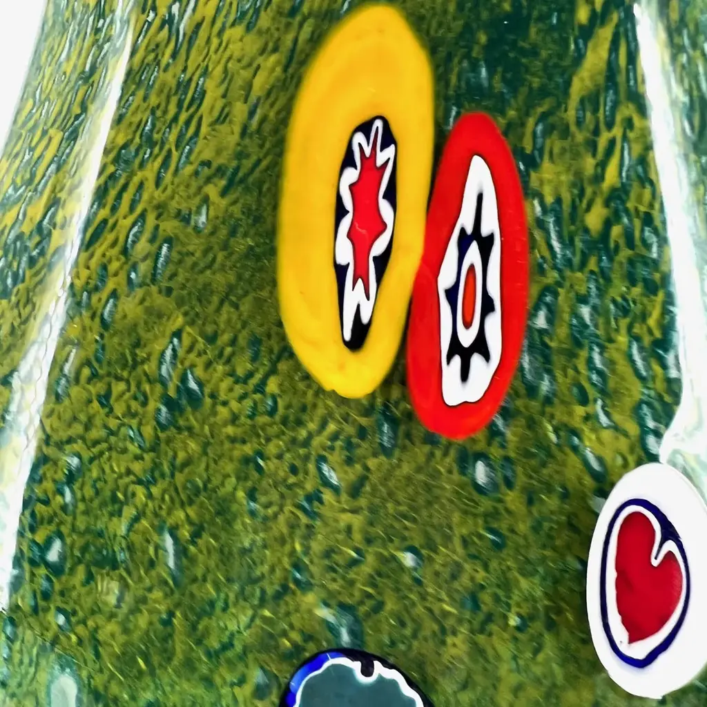 A marvelous display of traditional craftsmanship combined with contemporary allure, this gorgeous vase is distinguished by a hypnotizing shade of forest green, enhancing its Murano glass sinuous shape, finally enriched with precious Murrine. This unique vase comes with an authenticity certificate. Please consult the Concierge for further information.