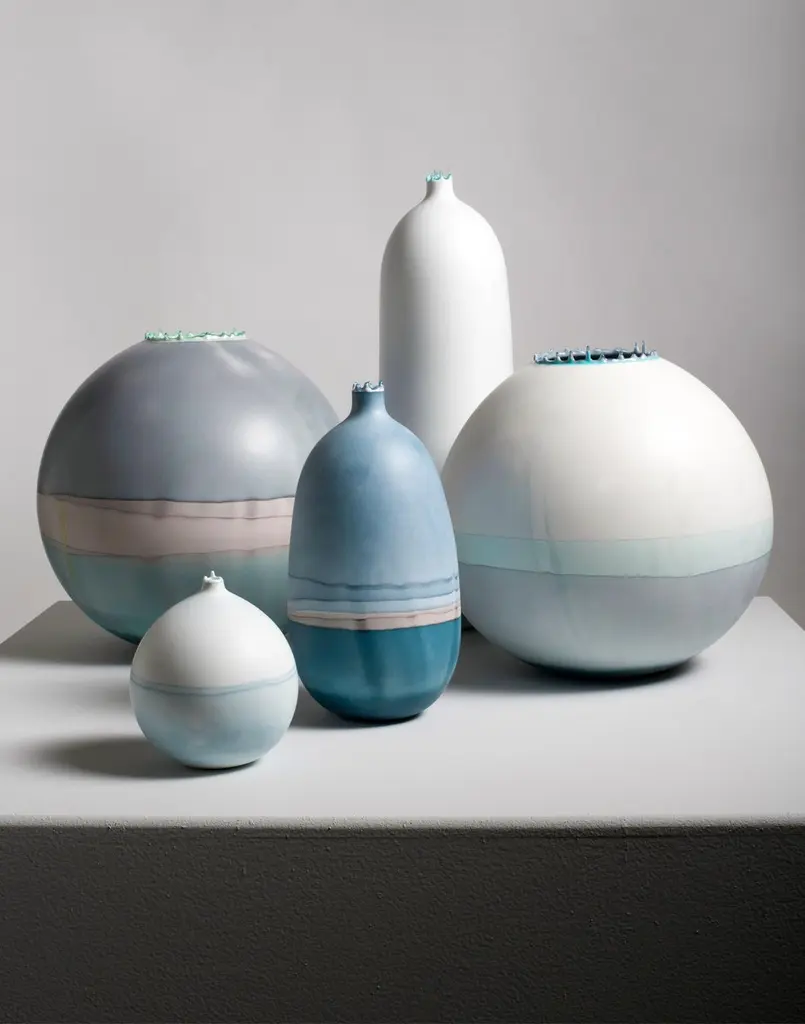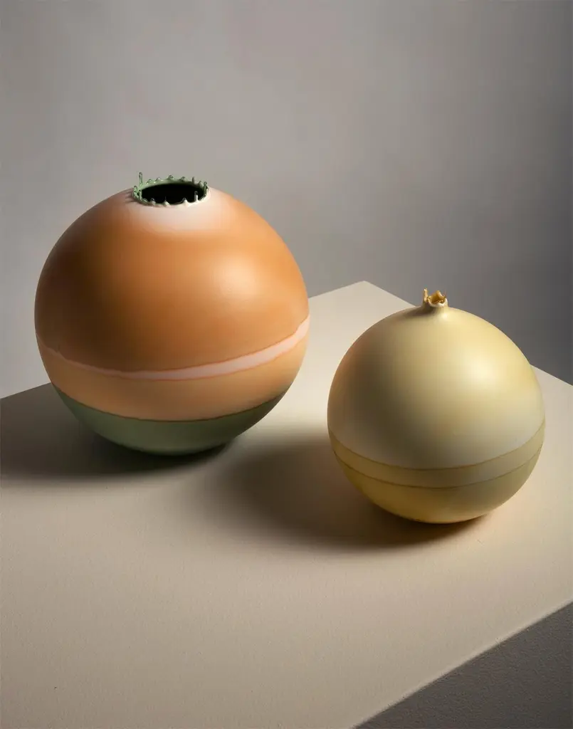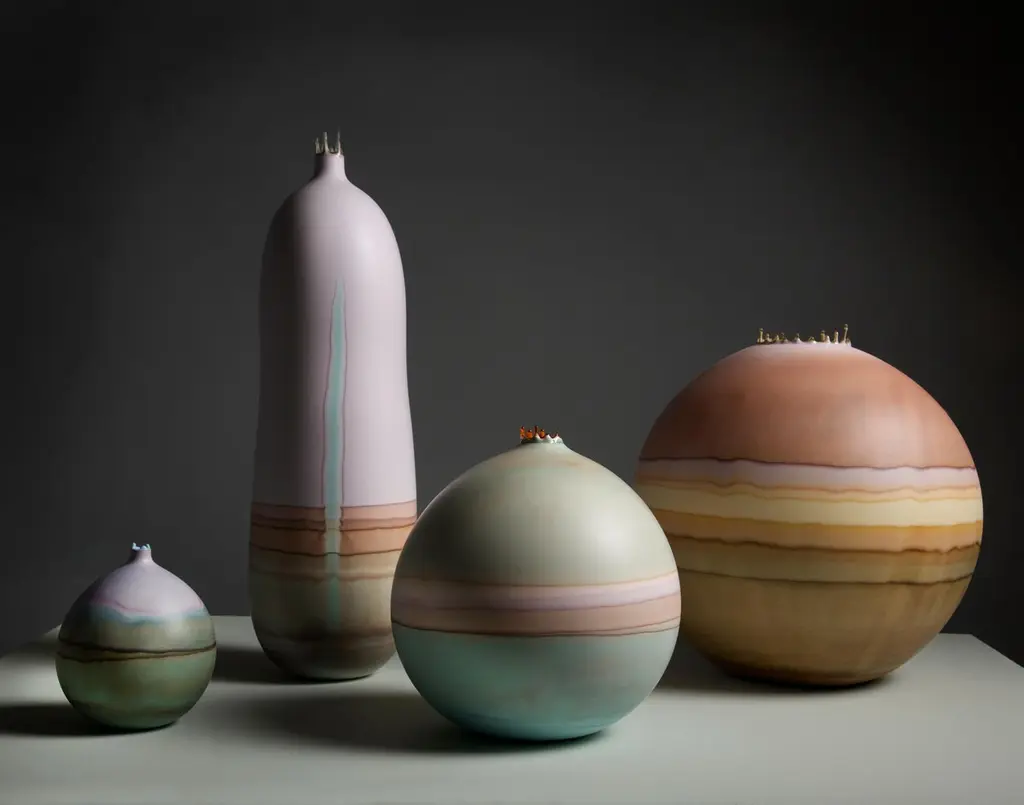 Green patina saturn vase by Elyse Graham,Dimensions: W 20 x D 20 x H 23 cm,Materials: Plaster, ResinMolded, dyed, and finished by hand in la. Customizationavailable.All pieces are made to order.This collection of vessels is inspired by striated landscapes caused by glacial erosion as well as the beautiful colors found in foliated metamorphic rock.Though often thought to be either ceramic or glass, these pieces are neither. Graham has designed a unique process for creating these pieces. Each drip vase is hand-cast with hydrocal plaster inside of a unique balloon shape. The interior of each piece is poured with layers of resin, making it waterproof. Finally, each drip vase is hand-dyed by the artist with layer after layer of custom mixed pigments and then sealed with a UV resistant acrylic coating. These vases are all handmade and will vary slightly in shape, size, color and pattern.MEET OUR TEAMElyse Graham is the founder and creative director of the studio. Driven by Elyse’s unique vision of building a studio that fosters and emphasizes connection, play, and experimentation (of people, processes, and in turn the objects created and shared) our small team works closely and collaboratively on each project. Elyse received a BA in sculpture and semiotics at Brown University. After years of making sculpture and running a business in jewelry design, Elyse decided to merge her separate practices and redirect her attention toward collectible design in 2013. The creative trajectory of the studio is heavily influenced by Graham’s background in fine art, specifically her interest in process-driven and material-based artwork. The studio’s vocabulary of shapes, patterns, and forms comes from a lineage of unconventional processes Graham has developed and built for working with plaster and resin. Graham shares her studio as well as her home with her husband, Lewis Mauk and their daughter, Eero. Miller Robinson is head of our production department. From pigmenting and casting materials for all of our products in plaster and resin to graphic and production design, they wear many hats in our studio. Miller joined our team in 2014 and has been an integral part of designing many of our experimental processes that have lead to the creation of our unique MetaMATERIAL. Like Elyse, Miller has a background in material and process-oriented making, which led to an instant connection and collaborative understanding between the two. Miller received their BFA from Otis College of Art and Design with a focus on painting, installation, performance, and writing. Their individual art practice focuses on the preservation and potentialities of underrepresented histories and encompasses objects, garments, actions, tattooing, and books. Their personal work has been exhibited in Los Angeles at the Southwest Museum, Los Angeles Municipal Art Gallery, Heritage Square Museum, and with Los Angeles Contemporary Exhibitions (LACE), as well as HORESEANDPONY Fine Arts in Berlin.Lewis Mauk is our studio and operations engineer. Working on facilities and production design as well as engineering and leading all of our large-scale constructions and installations, Lewis’ unique set of technical skills gives form and structure to our studio’s unconventional ideas and processes. Lewis has been working behind-the-scenes since the creation of the studio but joined our team full-time in 2020. Consistent with the rest of our team, Lewis has a background in process-driven fine art and has extensive training in woodworking, printmaking, and photography. He received a MFA from CalArts and has worked across the fields of education and fabrication. Lewis’ combined interest in the creation of personal archives mixed with his commitment to sustainable life practices, has brought a focus and important emphasis on designing studio projects and processes that imagine ways to reduce and reuse studio material fragments.