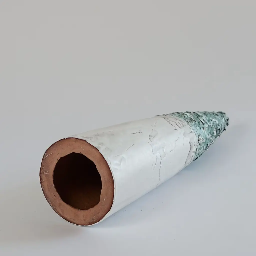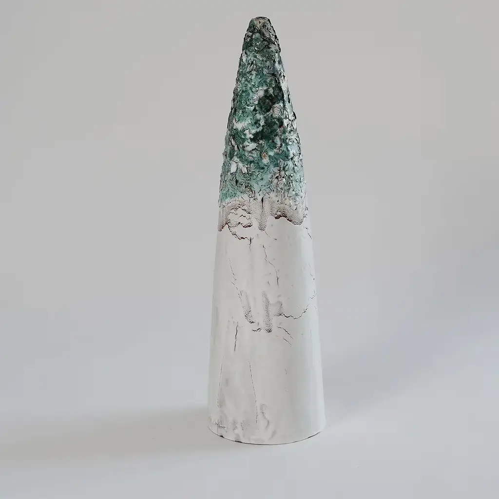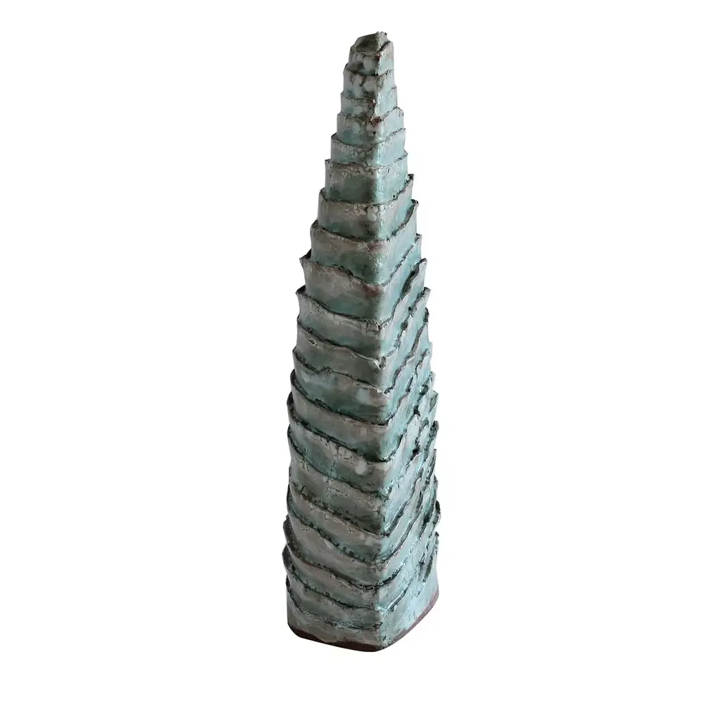 This unique sculpture was hand made in terracotta using the coiling technique and covered with rich glazes and oxides in white and green. Due to its hand-crafted nature, reproductions of this piece will be similar but not identical.