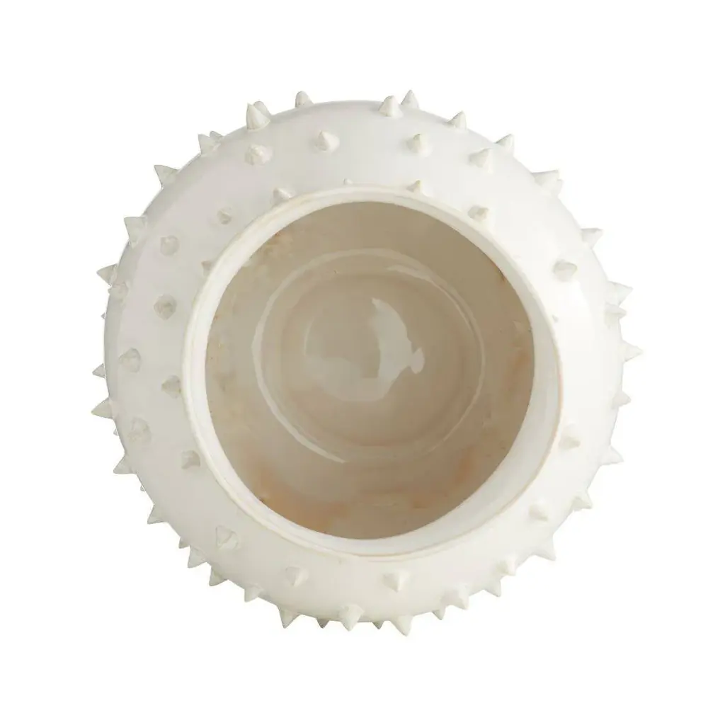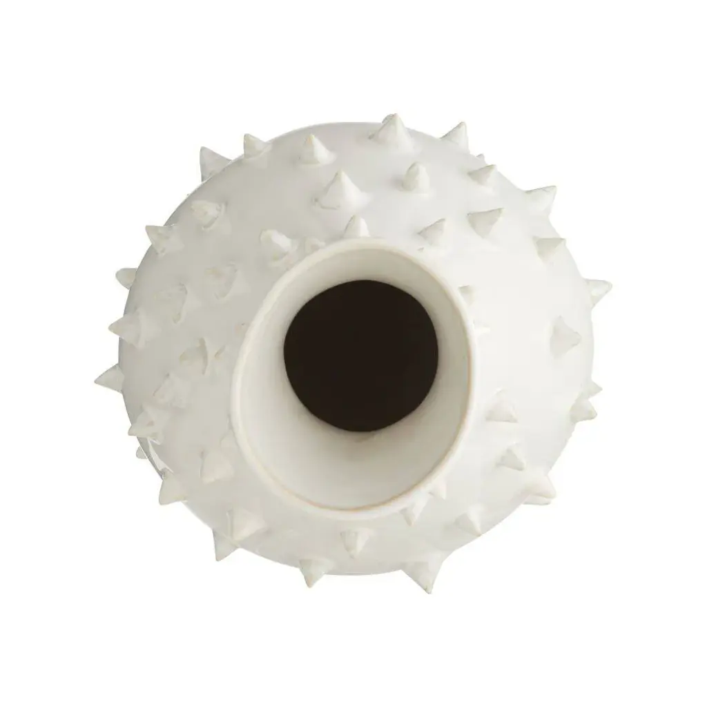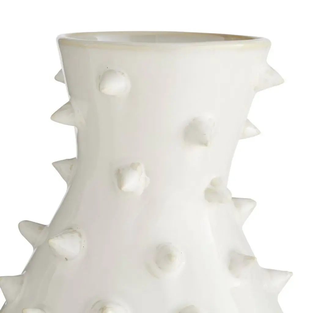 This ceramic vase's irregular shape and spiked surface recall a cactus. Glazed with an ivory crackle finish. Features