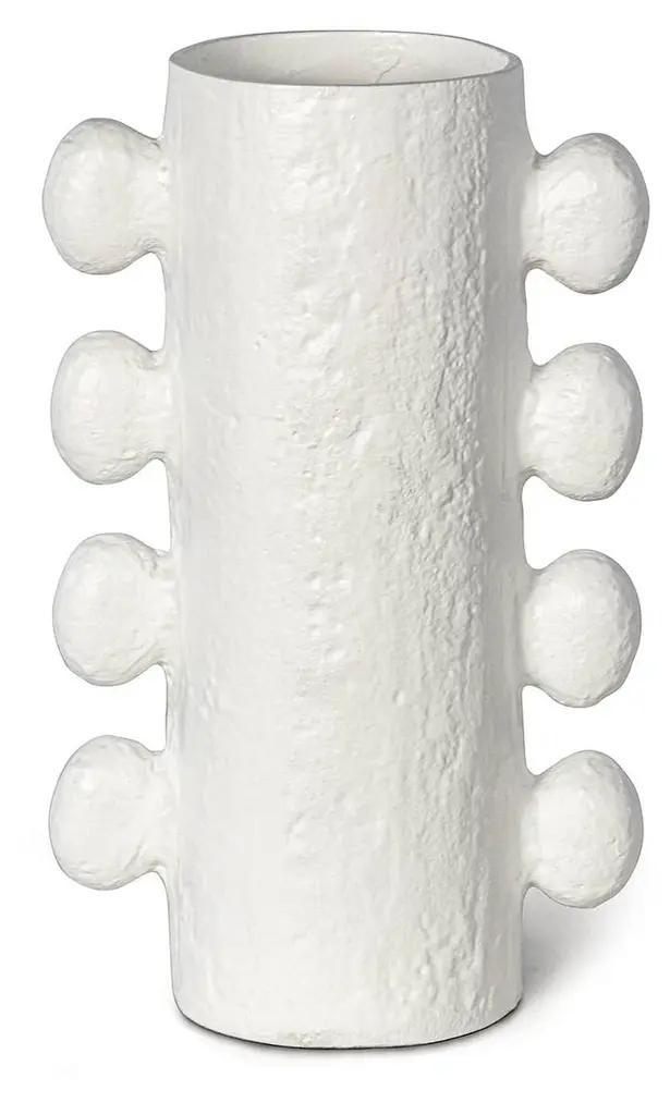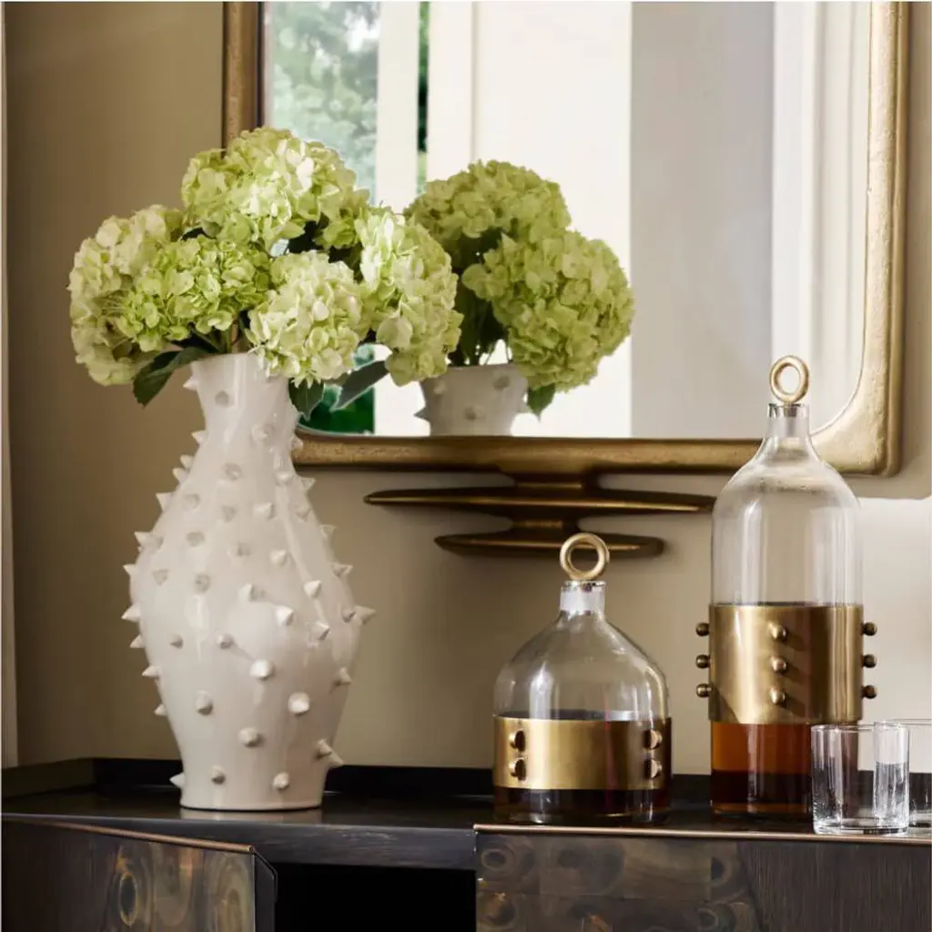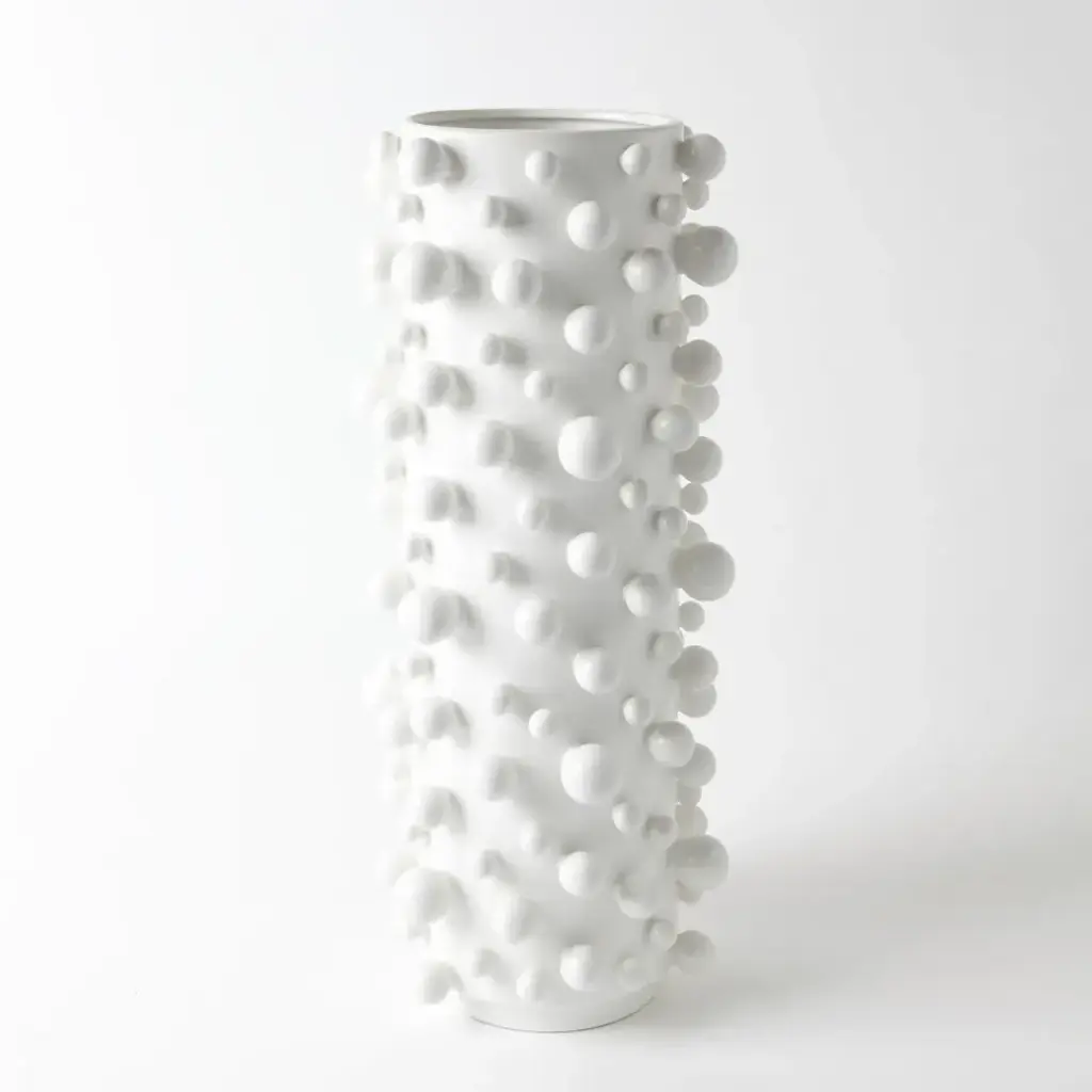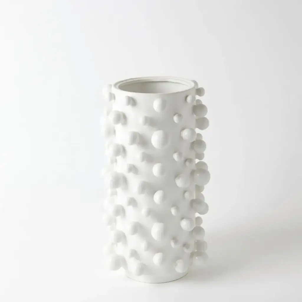 This ceramic vase's irregular shape and spiked surface recall a cactus. Glazed with an ivory crackle finish. Features