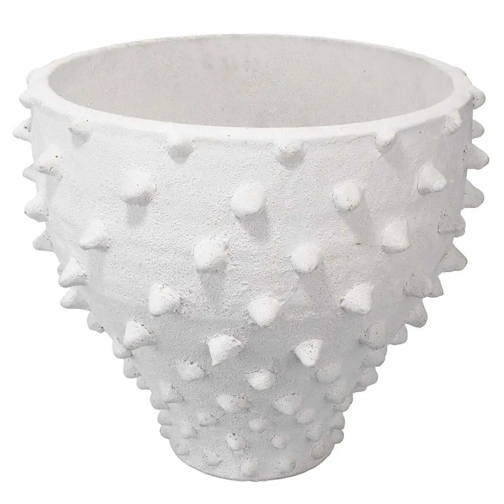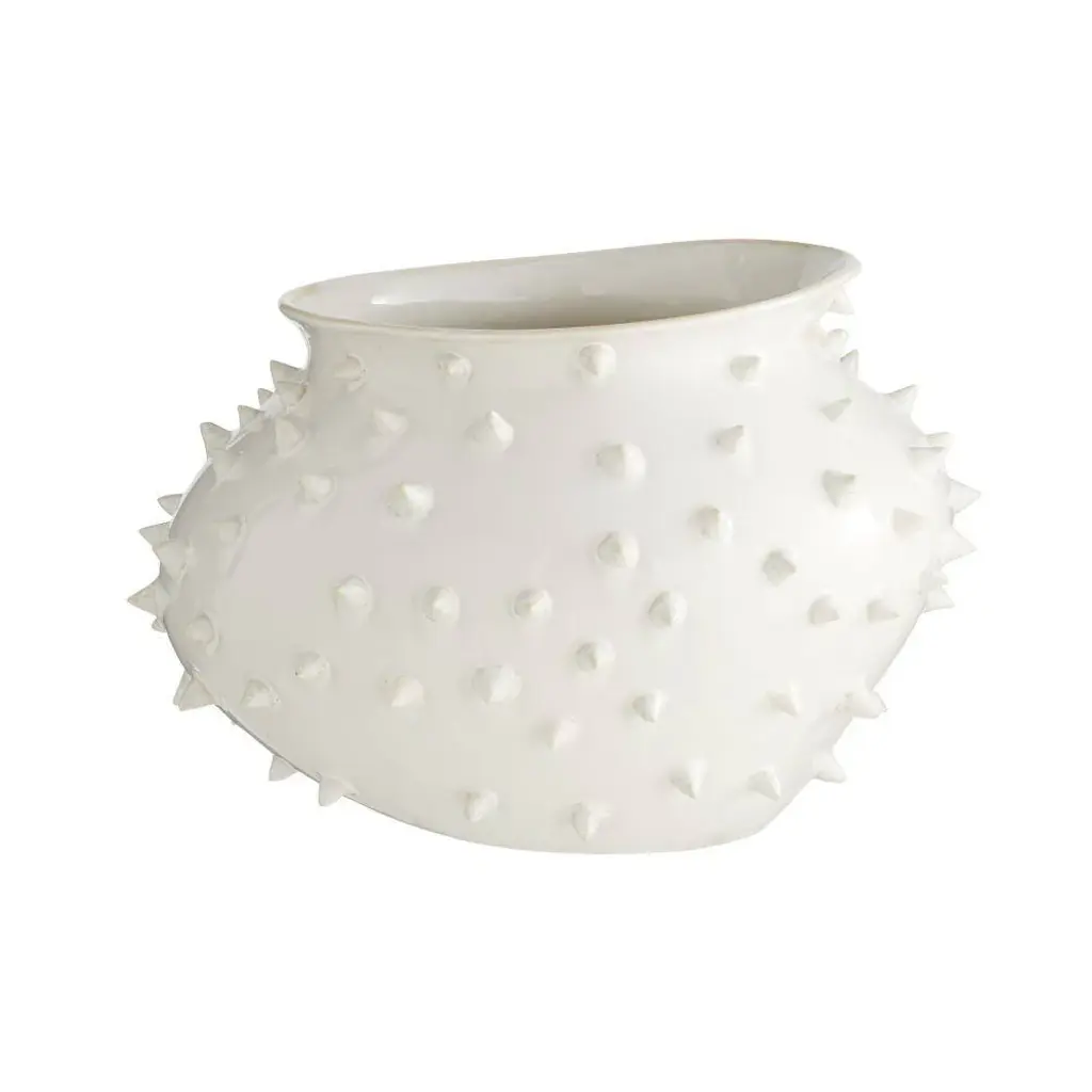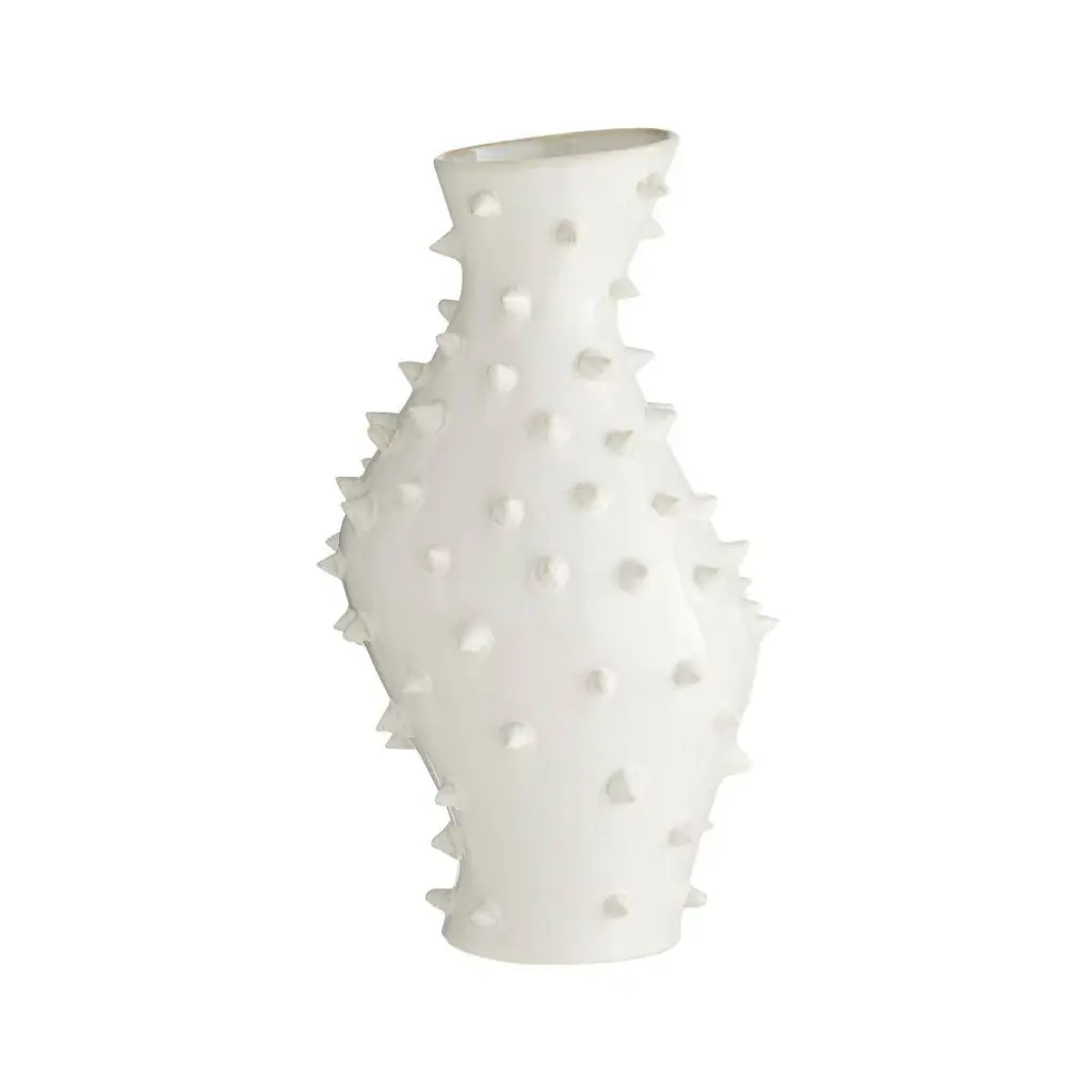 This ceramic vase's irregular shape and spiked surface recall a cactus. Glazed with an ivory crackle finish. Features