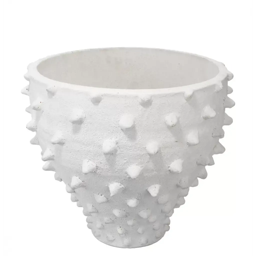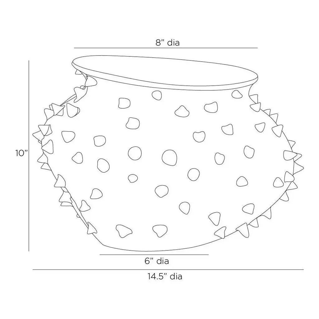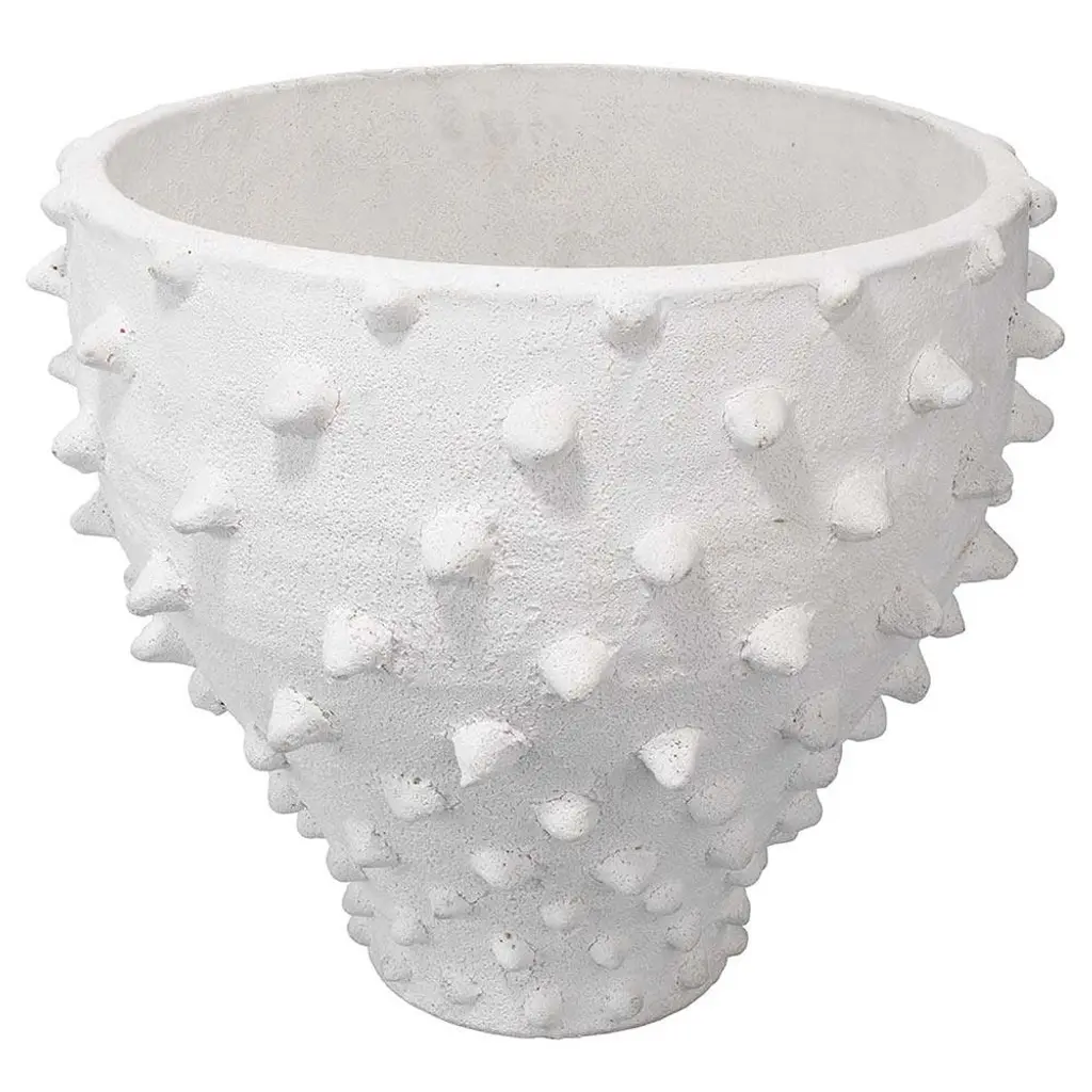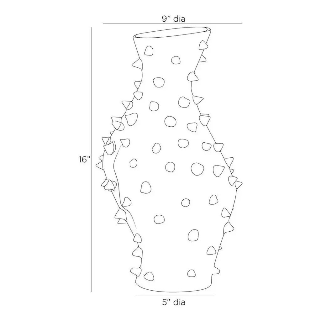 This ceramic vase's irregular shape and spiked surface recall a cactus. Glazed with an ivory crackle finish. Features