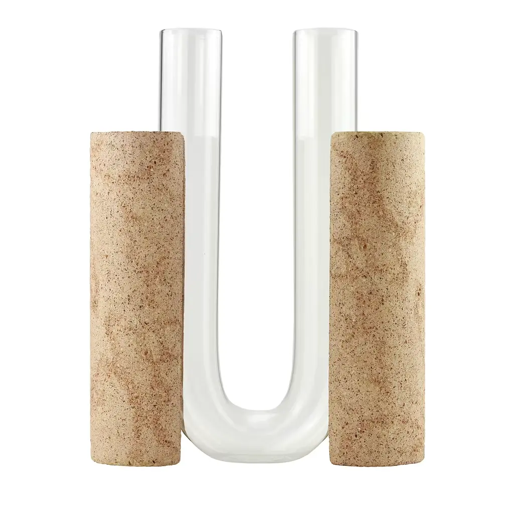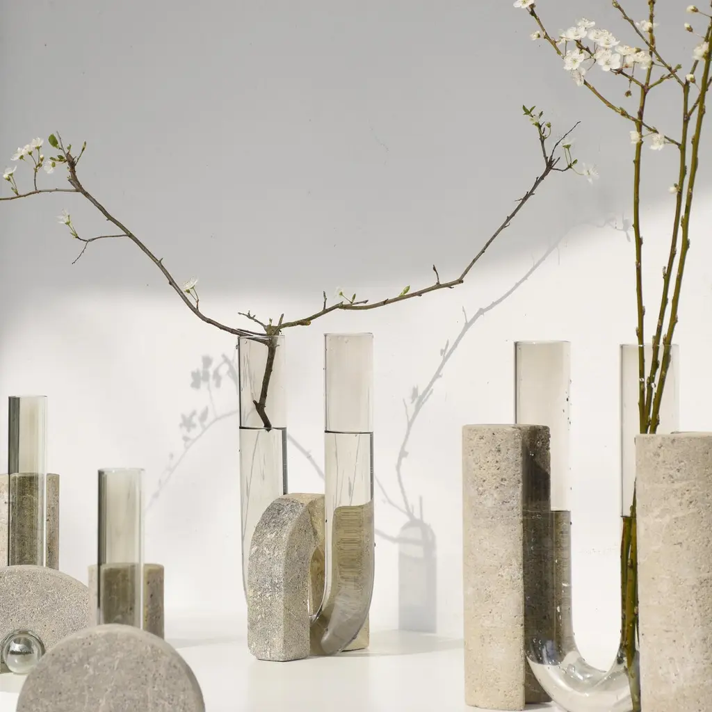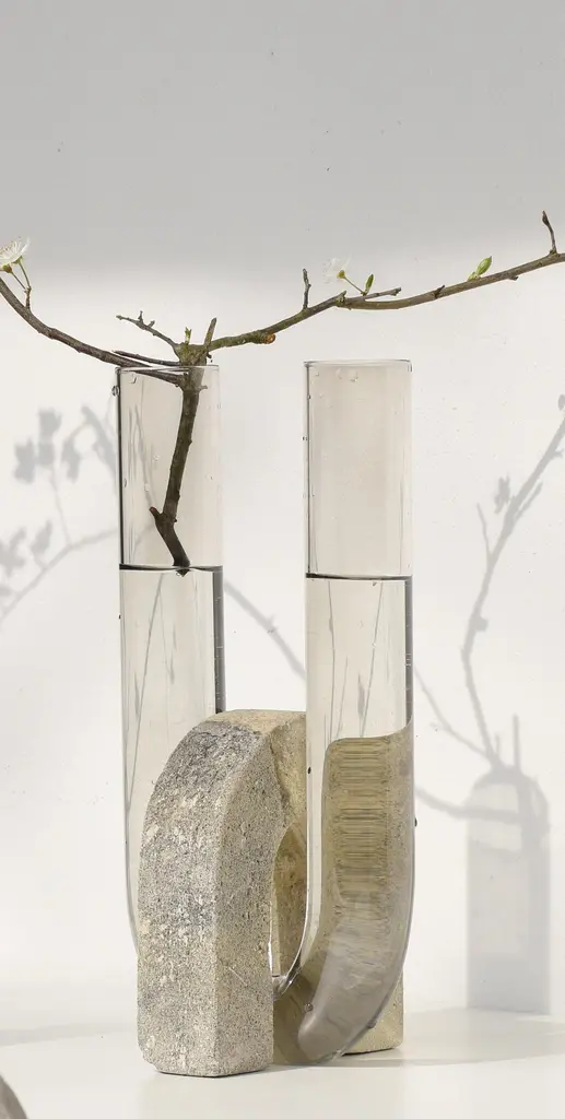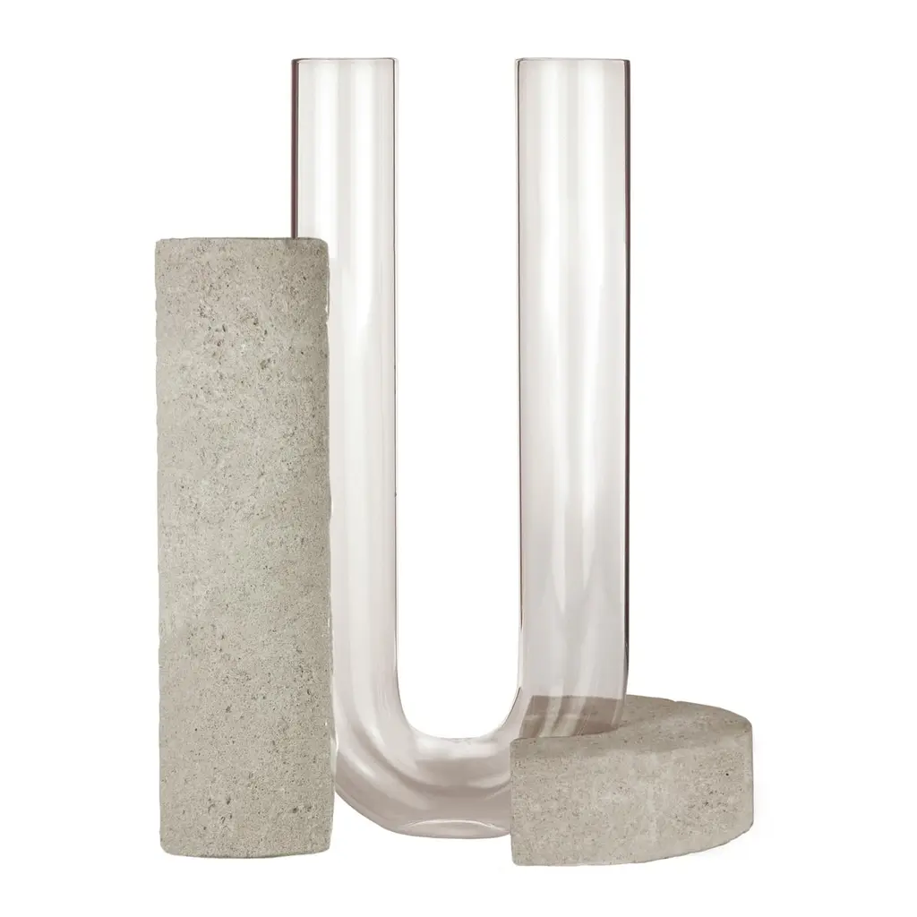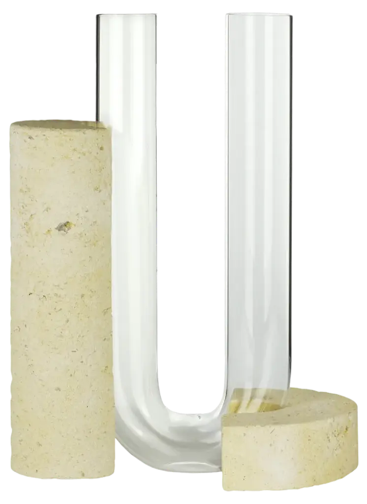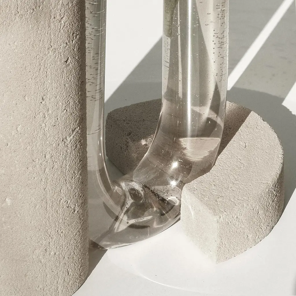 Grey-smoked Cochlea della Consapevolezza soils edition vase by Coki BarbieriDimensions: W 24 x D 14 x H 30 cm.Materials: Handcrafted stone made with Matera stone fragments, sedimentary rocks of the Italian Apennines and pure water, black mineral pigments from Italian soils, smoked painted borosilicate glass.Cochlea della Consapevolezza - SOILS EDITION - Grey-SmokedCochleae vases collection is inspired by the life cycle of the snails and captures their growth when the invertebrate's body (represented by the curved glass) develops upwards from the embracing shell symbolized by semicircular shells handcrafted from fragments of historical stones only found in Matera (Città dei Sassi, UNESCO World Heritage, European Capital of Culture), recovered and reprocessed following a sustainable production cycle. The surface of the handcrafted stone piece is treated with an ecological substance developed by COKI. The glass and stone components are notglued and can be separated, disassembled, and ready for new uses.Soils edition is made with colored pigments of Italian soil.A precious objects collection made in Italy with natural and vegan origin materials, conceived by architectural and product designer Coki Barbieri and created by the local craftsmen to expand a new slow living awareness and surround oneself with a few objects, capable of staying alongside us over time.The climate emergency and increased future anxiety push our work to imagine alternative ways of living, producing, and consuming. For that Coki Barbieri uses notions of geology, chemistry, and design culture to create new products (and materials) from fragments and waste from natural products (such as stone and minerals).Coki Barbieri established her eponymous studio-workshop in Rimini in 2017, bringing to life a sustainable way of conceiving the product design for home. Nature inspires her environmentally conscious creations, which are imbued with emotional energy while maintaining their aesthetic impact and practical functionality. Coki collaborates with talented Italian craftsmen to produce one-of-a-kind homeware objects capable of unlocking new synergies between concepts, materials, and use.