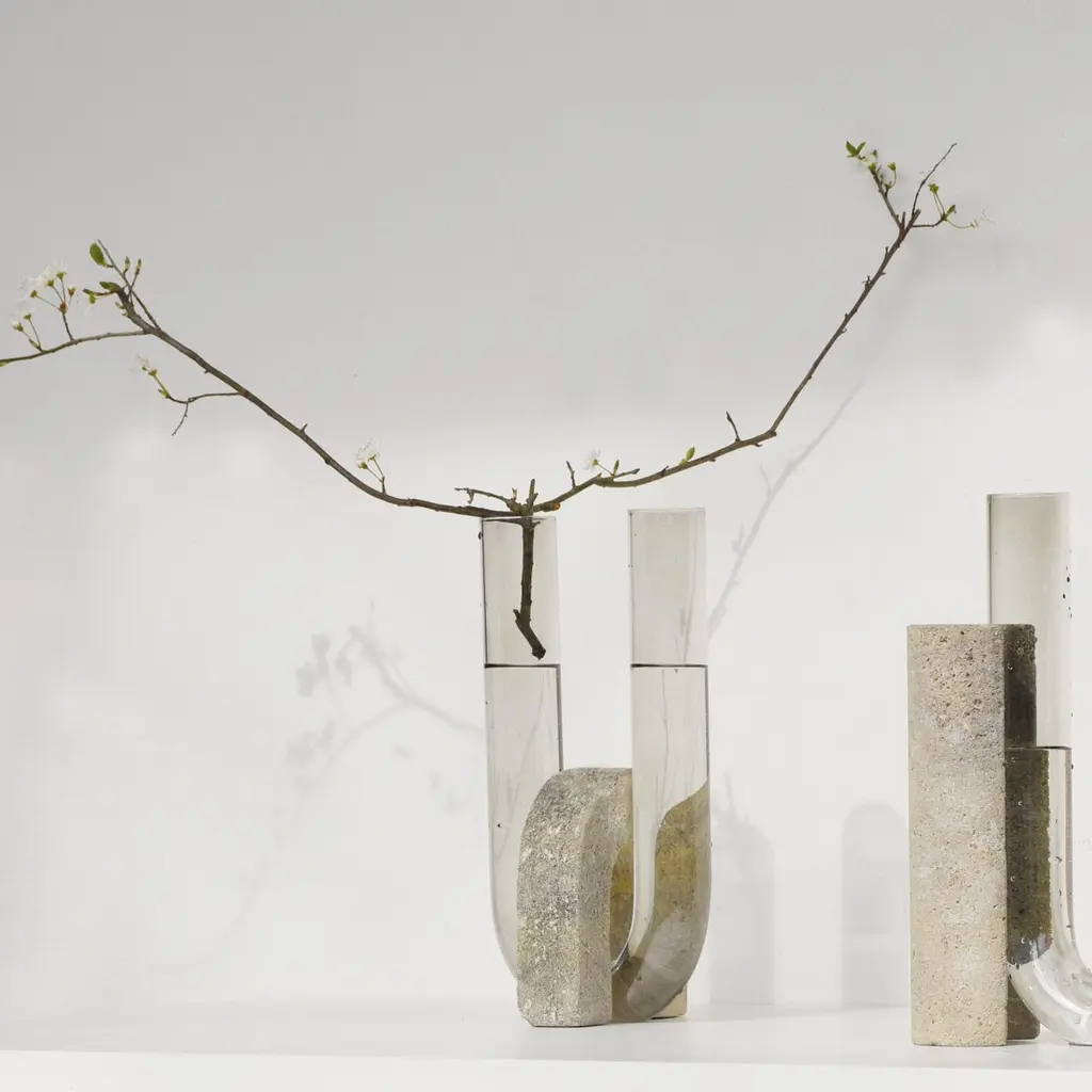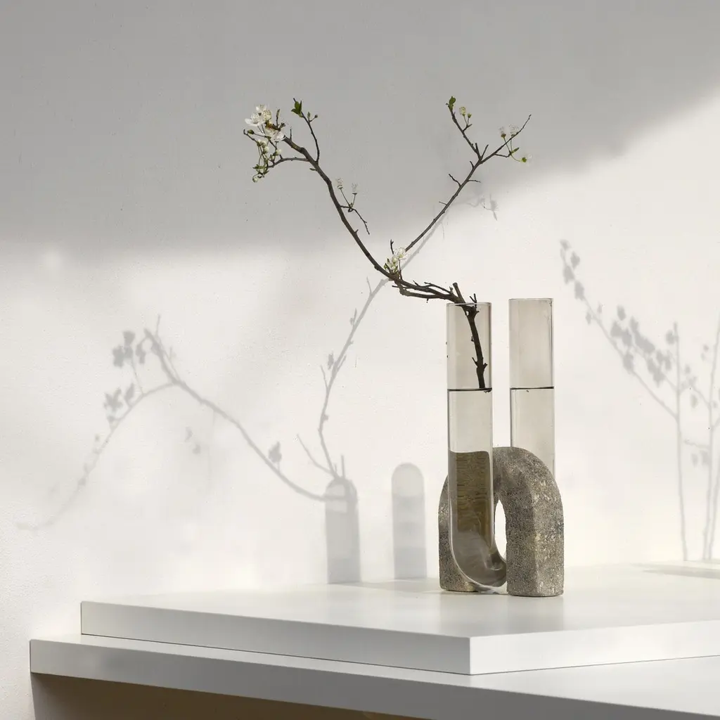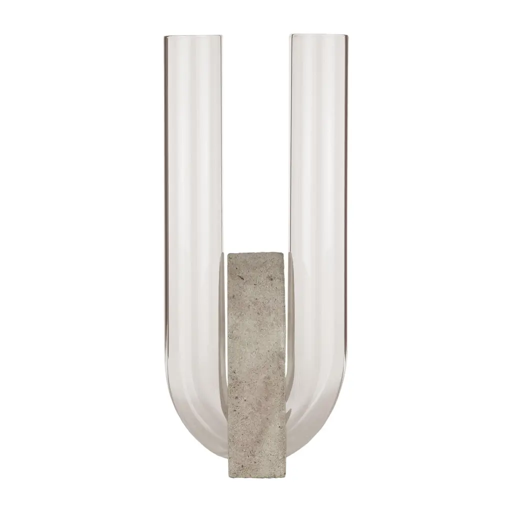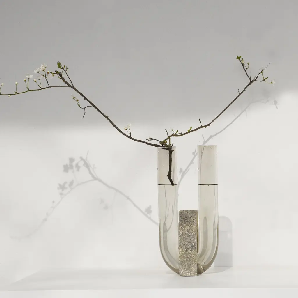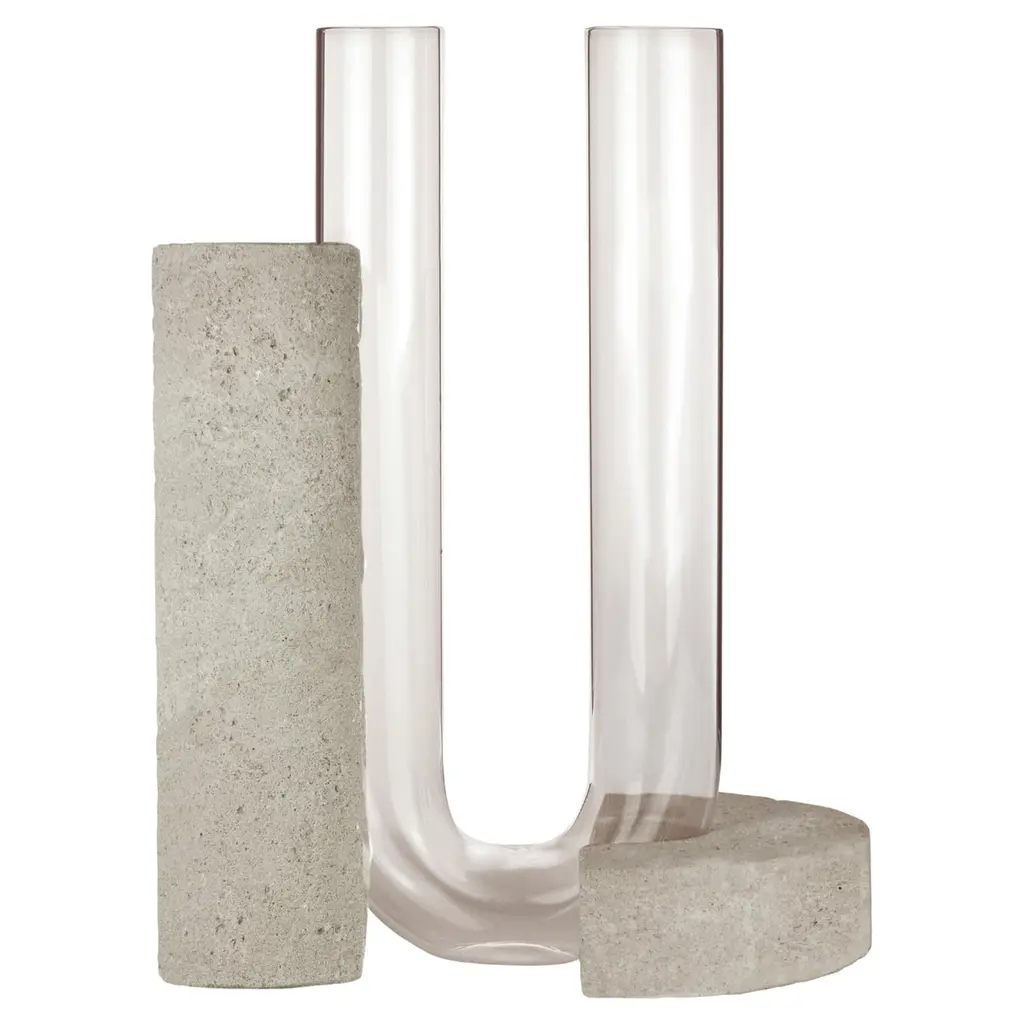 Grey-Smoked Cochlea Della Liberazione Soils Edition vase by Coki BarbieriDimensions: W 14 x D 14 x H 30 cm.Materials: Handcrafted stone made with Matera stone fragments, sedimentary rocks of the Italian Apennines and pure water, black mineral pigments from Italian soils, smoked painted borosilicate glass.Cochlea della Liberazione - SOILS EDITION - Grey-SmokedCochleae vases collection is inspired by the life cycle of the snails and captures their growth when the invertebrate's body (represented by the curved glass) develops upwards from the embracing shell symbolized by semicircular shells handcrafted from fragments of historical stones only found in Matera (Città dei Sassi, UNESCO World Heritage, European Capital of Culture), recovered and reprocessed following a sustainable production cycle. The surface of the handcrafted stone piece is treated with an ecological substance developed by COKI. The glass and stone components are notglued and can be separated, disassembled, and ready for new uses.Soils edition is made with colored pigments of Italian soil.A precious objects collection made in Italy with natural and vegan origin materials, conceived by architectural and product designer Coki Barbieri and created by the local craftsmen to expand a new slow living awareness and surround oneself with a few objects, capable of staying alongside us over time.The climate emergency and increased future anxiety push our work to imagine alternative ways of living, producing, and consuming. For that Coki Barbieri uses notions of geology, chemistry, and design culture to create new products (and materials) from fragments and waste from natural products (such as stone and minerals).Coki Barbieri established her eponymous studio-workshop in Rimini in 2017, bringing to life a sustainable way of conceiving the product design for home. Nature inspires her environmentally conscious creations, which are imbued with emotional energy while maintaining their aesthetic impact and practical functionality. Coki collaborates with talented Italian craftsmen to produce one-of-a-kind homeware objects capable of unlocking new synergies between concepts, materials, and use.