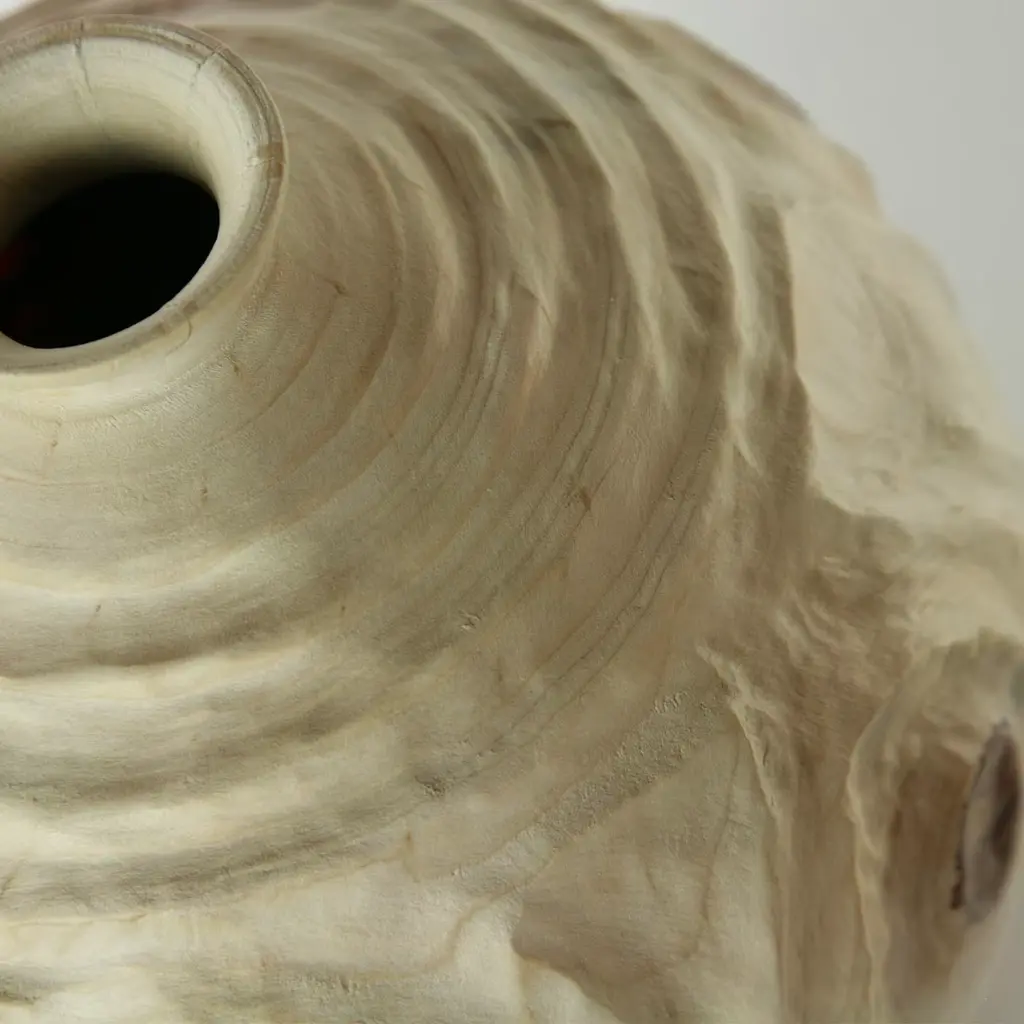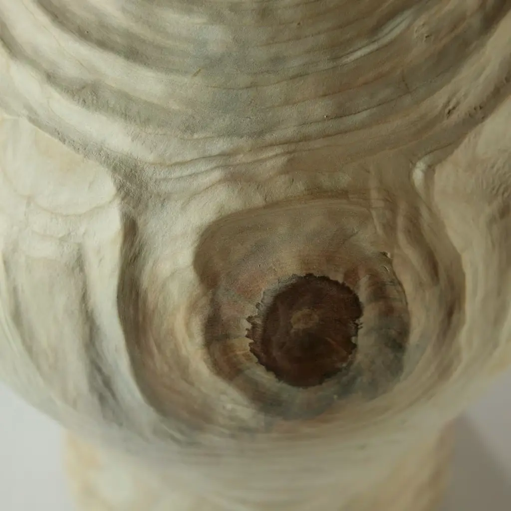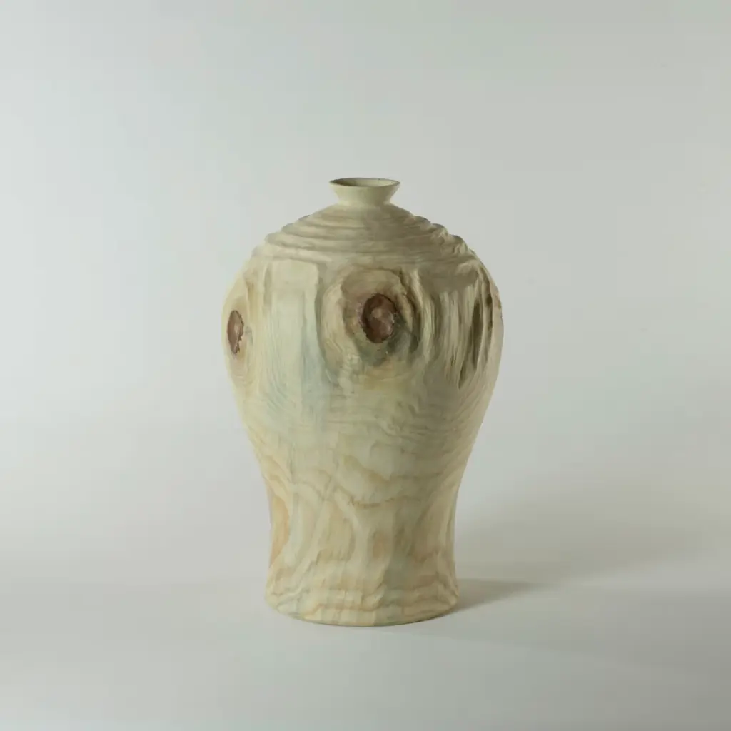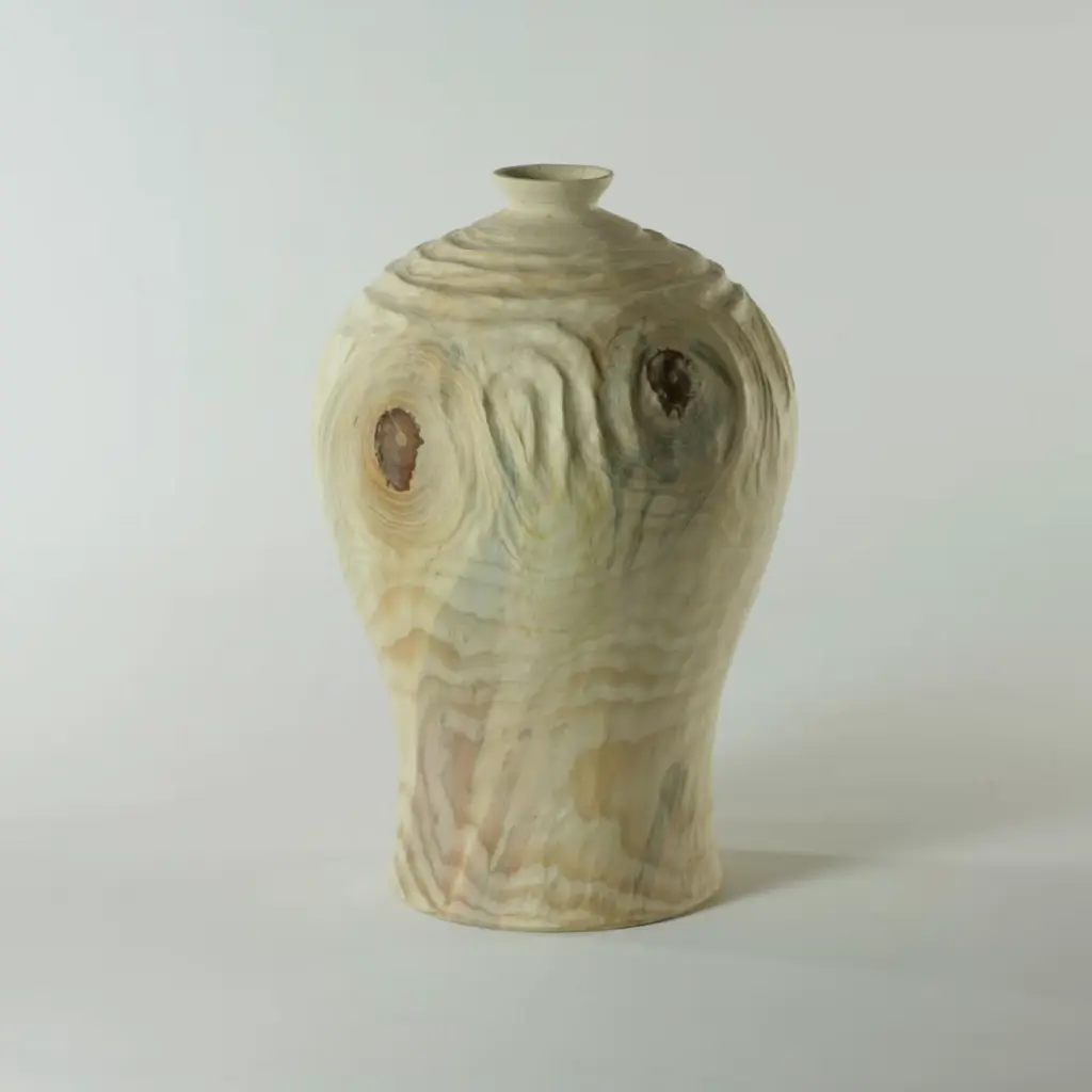 This singular vase painstakingly carved by hand from a single block of araucaria wood evokes the elegant atmospheres of ancient Korea with its traditional shape. Its unique swirls and grain are emphasized by means of the Groove FTG (which stands for Follow The Grain) technique, where the grooves follow the natural grain, completing the design.
