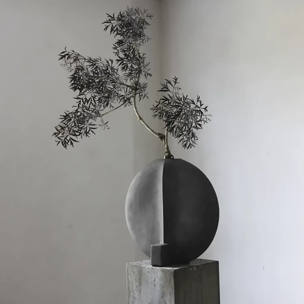 The Guggenheim Vase from 101 Copenhagen brings your space a striking blend of geometry and elegance. Designed by Kristian Sofus Hansen and Tommy Hyldahl, this ceramic piece features clean, angular lines that form a slender silhouette set atop a crossbar base, creating a captivating visual effect from every angle. Each vase is handcrafted with a unique, textured finish that beautifully interacts with light, making it a unique art piece that enhances any modern interior.