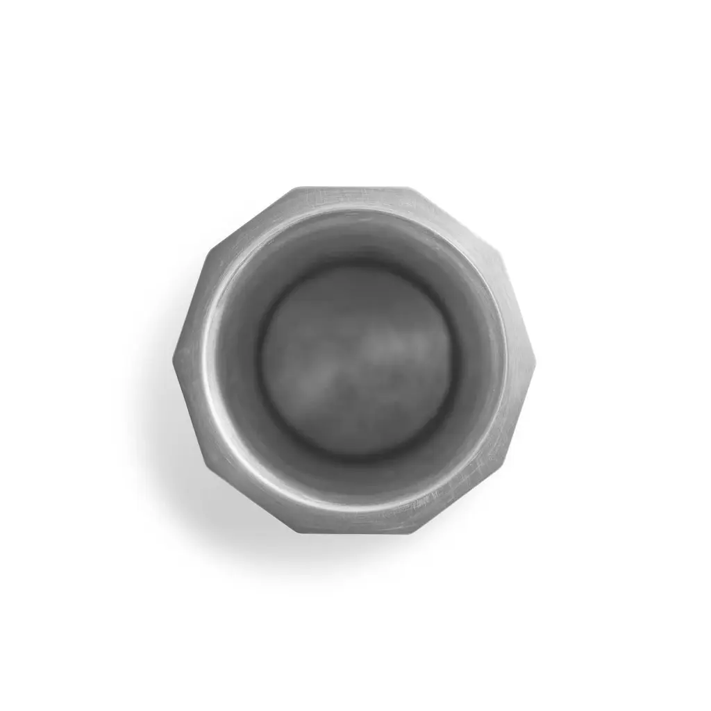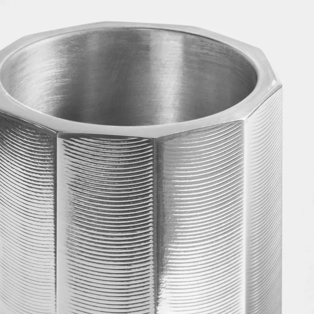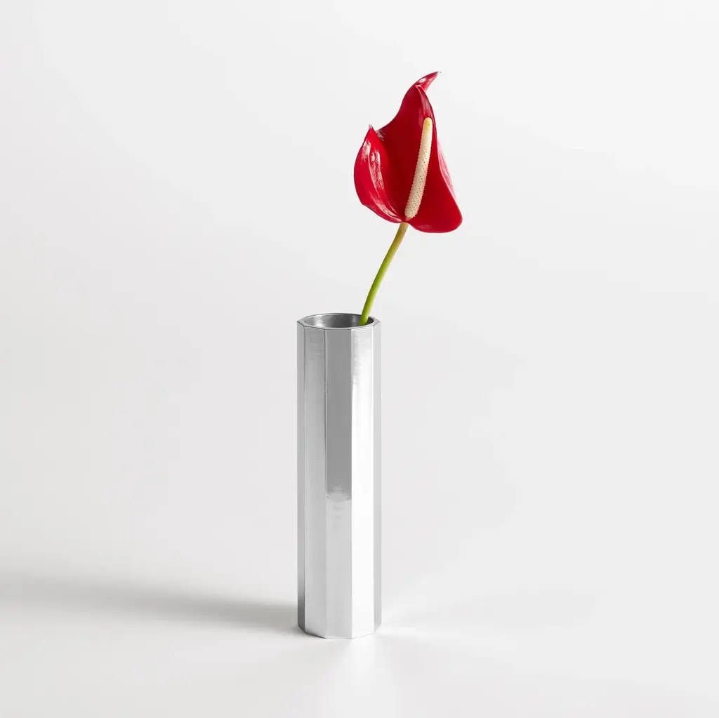 Bring in the bling. Milled aluminum creates a faceted and shiny form that makes flowers a very beautiful afterthought. Group large and small sizes to heighten the drama.