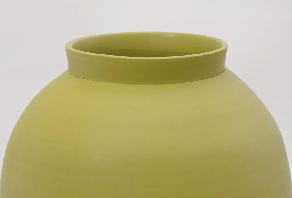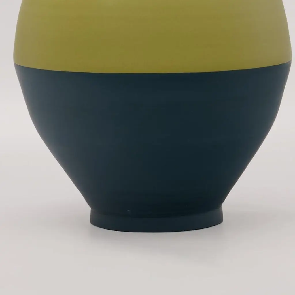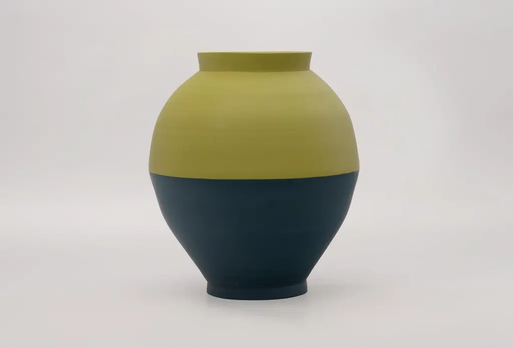 Half Half Vase by Jung HongUnique PieceDimensions: W 24.5 x D 24.5 x H 29.5 cmMaterials: PorcelainI use the technique of 'sang-gam' (=inlay work) with my special tool, which I made myself, and create delicate and exact lines, which are all handmade, although they are often mistakenly considered manufactured. In the notched hollow lines, I delicately place the subtle different colors one by one, just as hyperrealist painters do. It took me about a year to get a detailed "moon" pattern on the porcelain "moon jar". I am a Berlin-based ceramic artist from Korea and these are very early works made in Berlin, Moon jar is a type of traditional Korean white porcelain which consists of two hemispherical halves that have been joined in the middle. With the skills that I have accumulated for 15 years in Korea and the new inspiration I gained from different environments and cultures in Berlin for a year, I was able to create new works passionately while challenging myself. My specialty is the use of porcelain with colors. I have tested the different combinations of color stains so that I could make special and unique color porcelain. These works are all made on the wheel in the traditional way and the porcelain fired at high temperature is vitrified and has a very solid and good coloration, which is enhanced by grinding and polishing the surface, and also the surface becomes silky smooth - like a marble stone - by this treatment.
