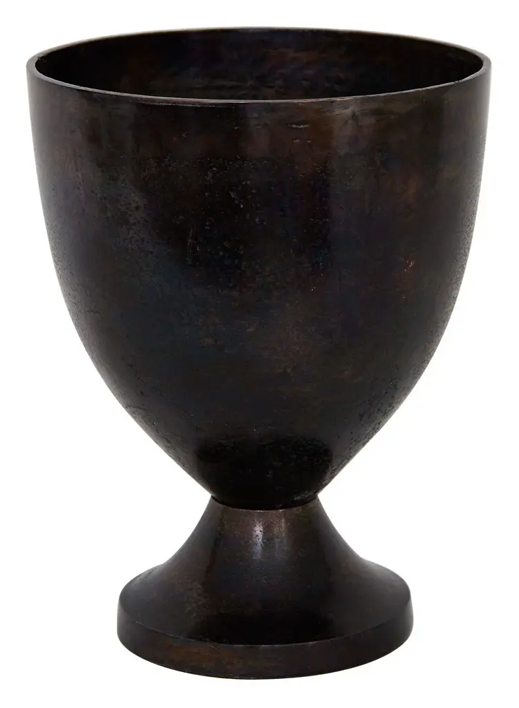 Give a delicate orchid a boost in height and style or add some elegance to a leafy sanseveria with our metal Hampstead Urn. Its traditional shape will nicely compliment any indoor plant. With no drainage hole, this footed vessel is perfect for concealing your houseplant's unsightly grower's pot without the worry of leaking water. •metal •watertight; pair with liner to avoid rusting Dimensions •9.75" diameter x 12.75"H•footprint: 6.5" diameter