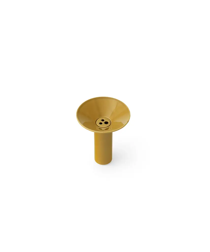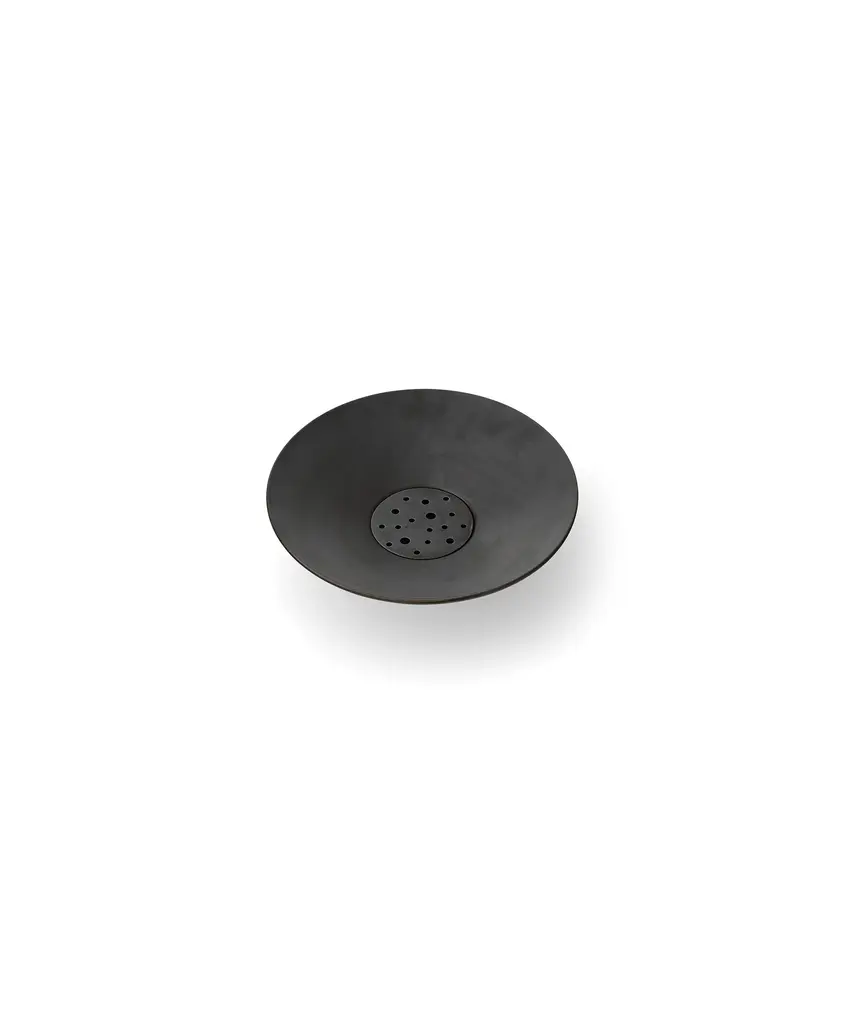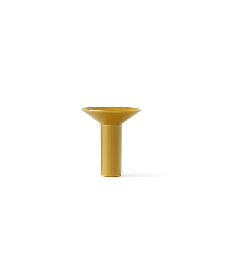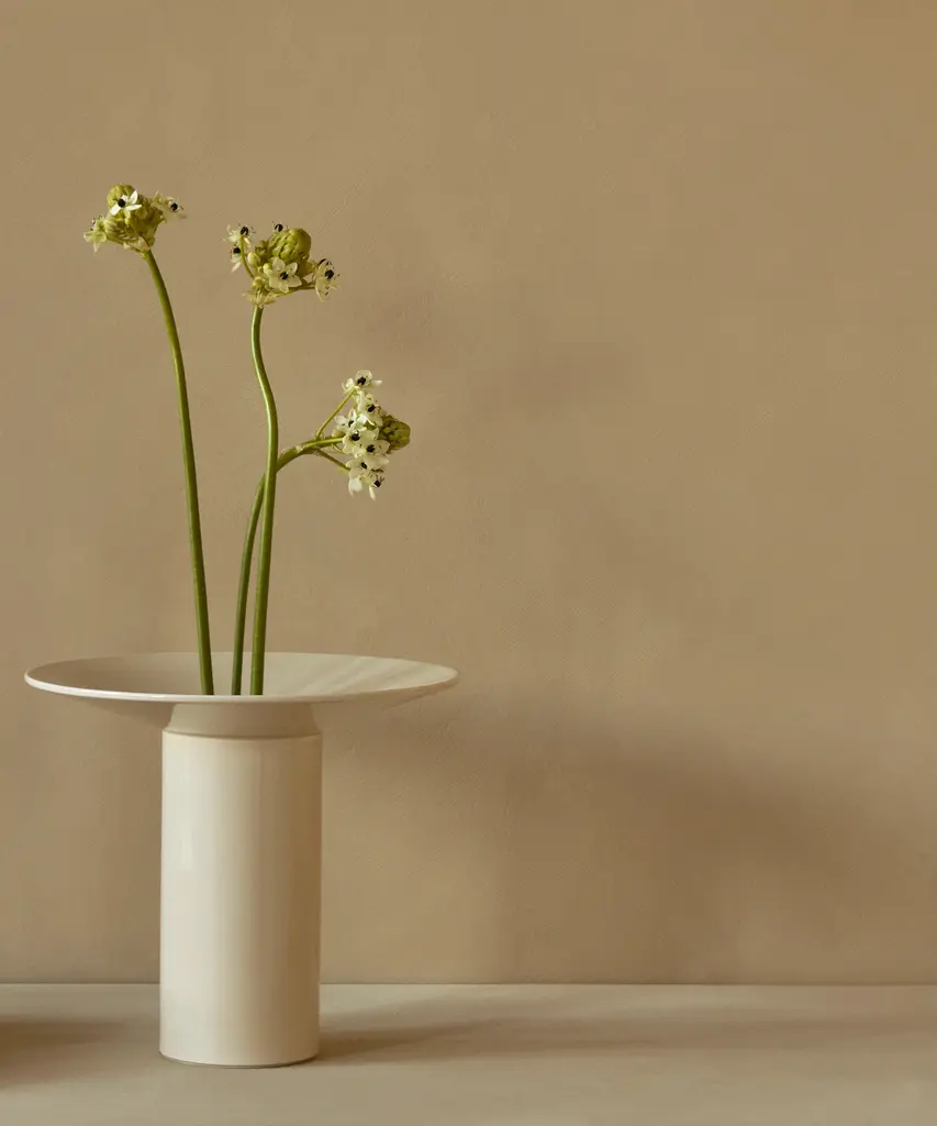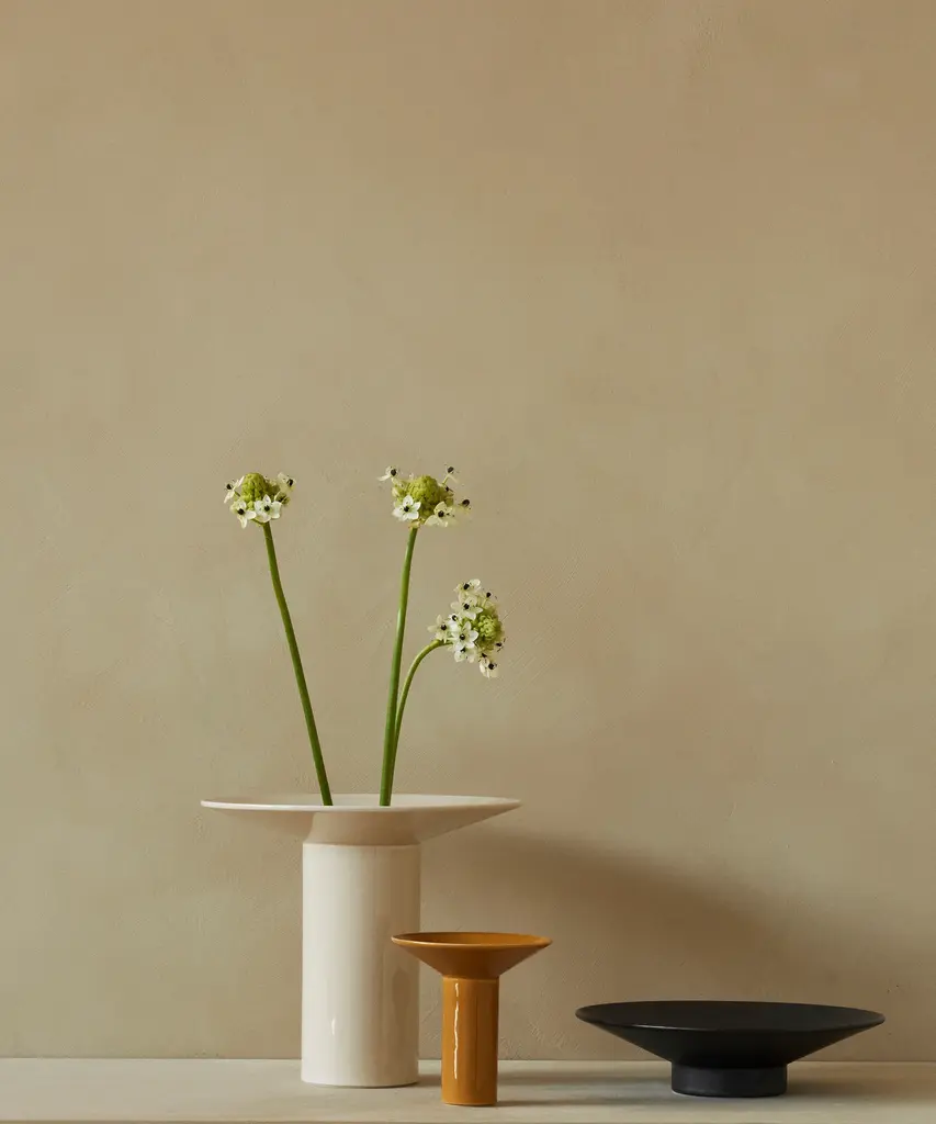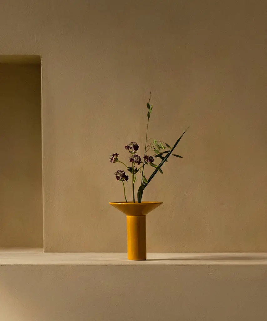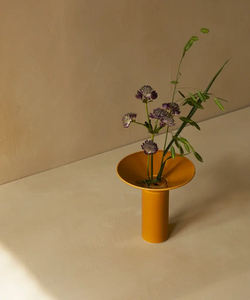 The Hana Vase marries the ancient practice of ikebana with a modern and multifunctional approach to decorative floral displays. Offered in three analogous forms, each stoneware vase has its own unique color and finish. A removable ceramic flower frog–or kenzan–sits within the vase and holds stems and branches in place both horizontally and vertically to create fail-safe displays based on ikebana’s principles of balance, harmony, and movement. For more conventional flower arrangements, the kenzan can be removed. Here, the vase’s concave lip provides functional support for upright blooms. Designed in Copenhagen by Krøyer-Sætter-Lassen, Audo Copenhagen.