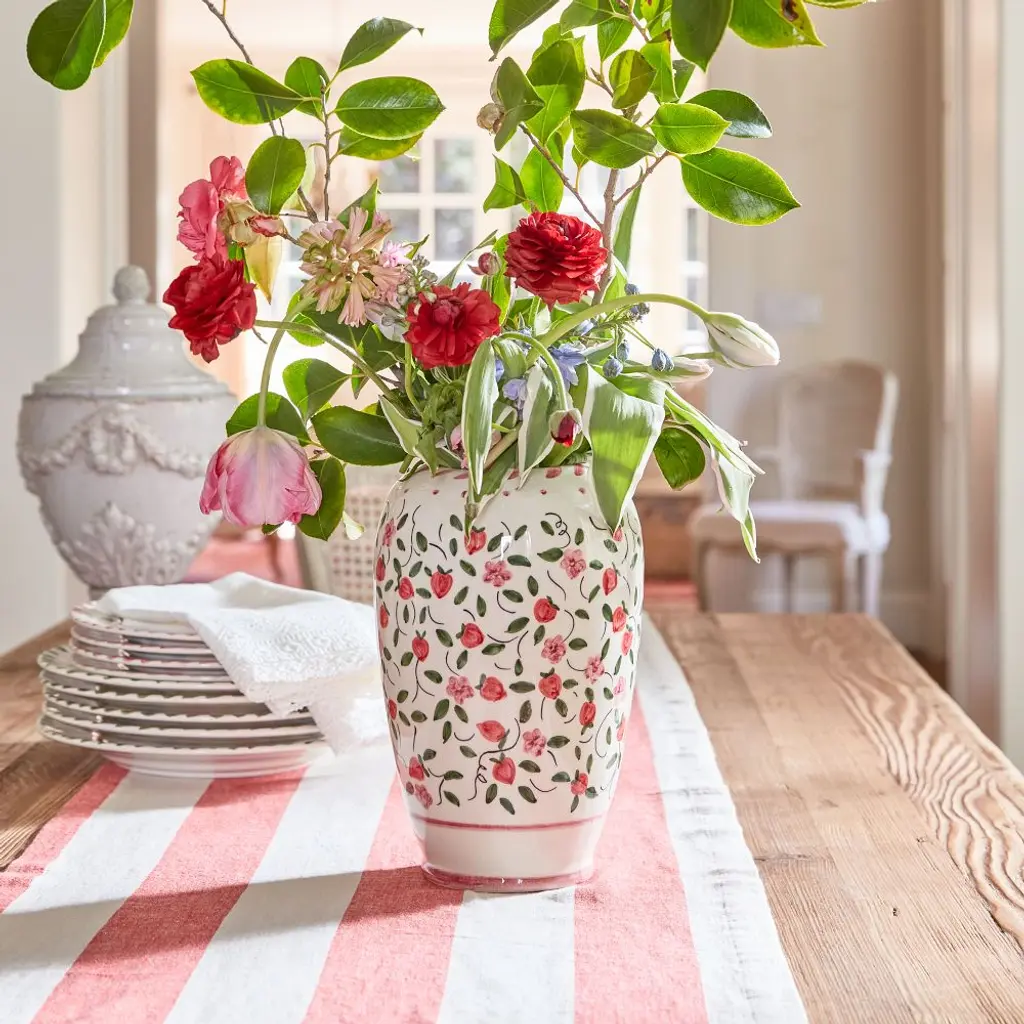 An artful object. Hand-painted in Portugal with a charming pattern of florals and fruits, this vase is one of a kind. Fill it with seasonal blooms for a chic centerpiece.