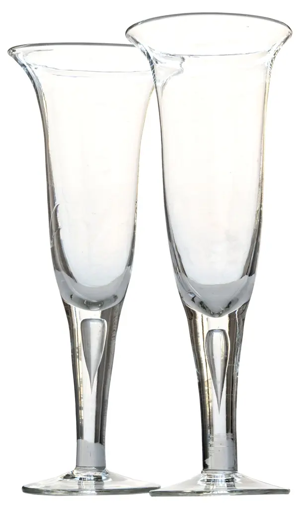 Pair of vintage handblown glass trumpet vases. Due to the handmade nature, there are slight irregularities in the shape. Can be used as champagne glass for a full bottle! Price reduced.