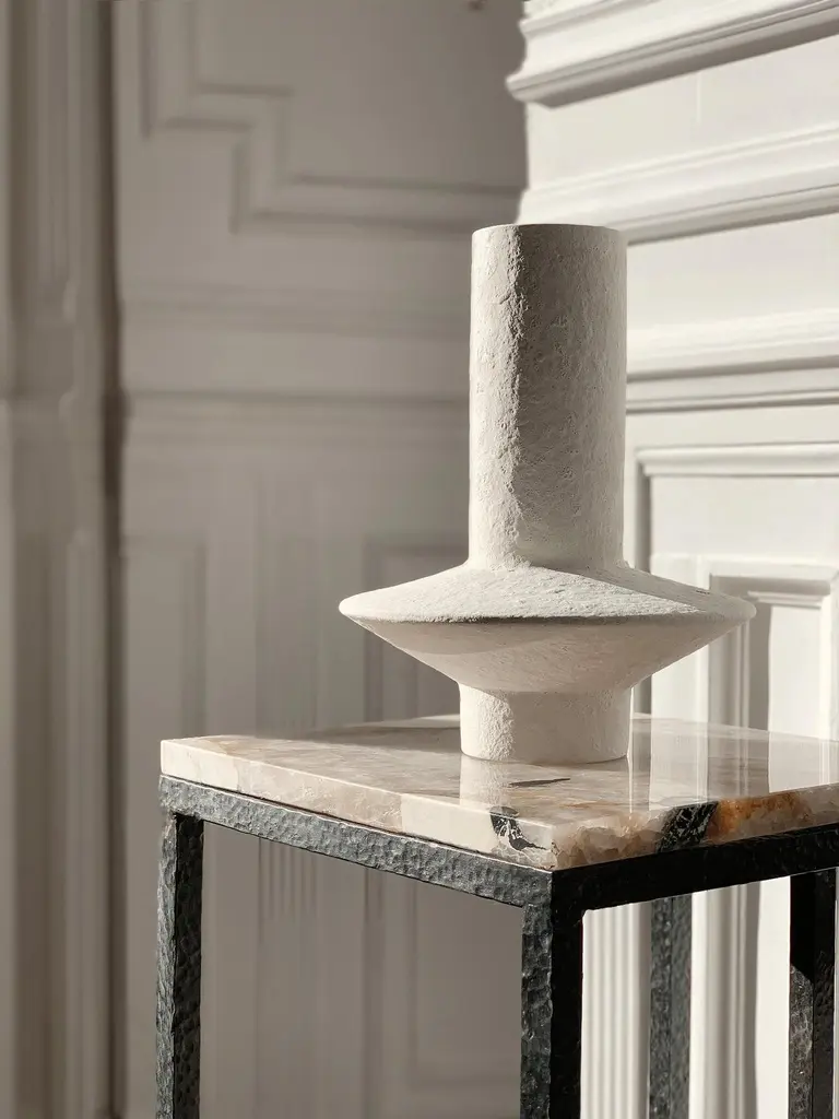 Handcrafted vase 072 by LovebuchDimensions: Ø 28 x H 34 cmMaterials: Sandstone, porcelain, handcrafted piece.Katia works with wood and clay, these raw, powerfully expressive materials are shaped to create a poetry of objects that inhabit our daily lives. Sculptural ceramics are also functional, they are made of stoneware modeled and turned in an artisanal way. Cooking them at 1250 ° C gives them resistance and permanence that has become rare.In the Lovebuch series (2015-2019) extracts from trees chosen from the Jurassian forest are cut, dried and polished at length. Their primitive, massive and organic presence is adorned with delicate paintings around a heart that has grown over time.