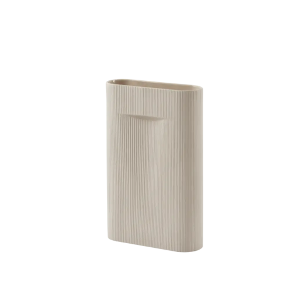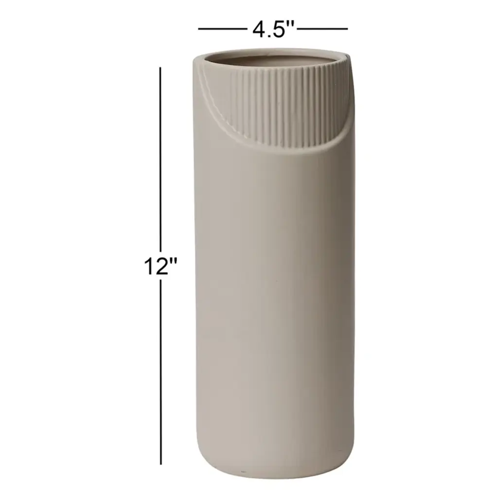 A semicircular segment of sculptural ribbing is given dramatic emphasis by this vase’s simple lines + neutral glaze. Handcrafted from sturdy ceramic, its asymmetrical design creates a fresh look from every angle – a lovely counterpoint to colorful blooms + a compelling object on its own terms.