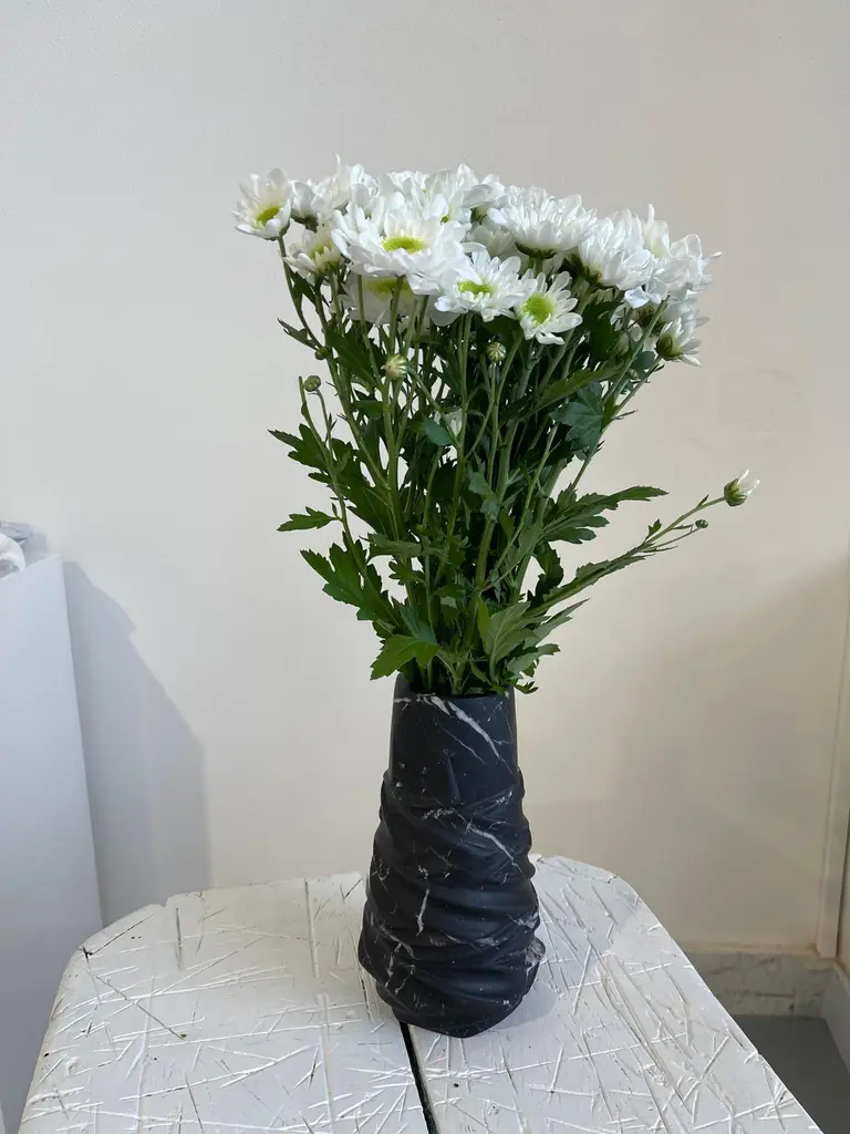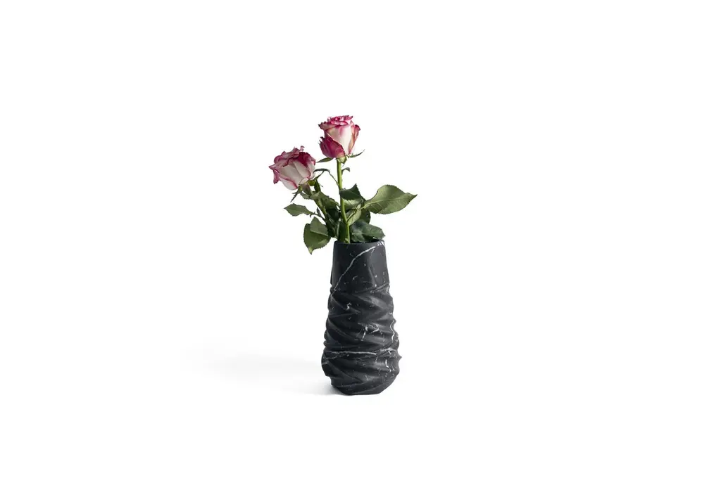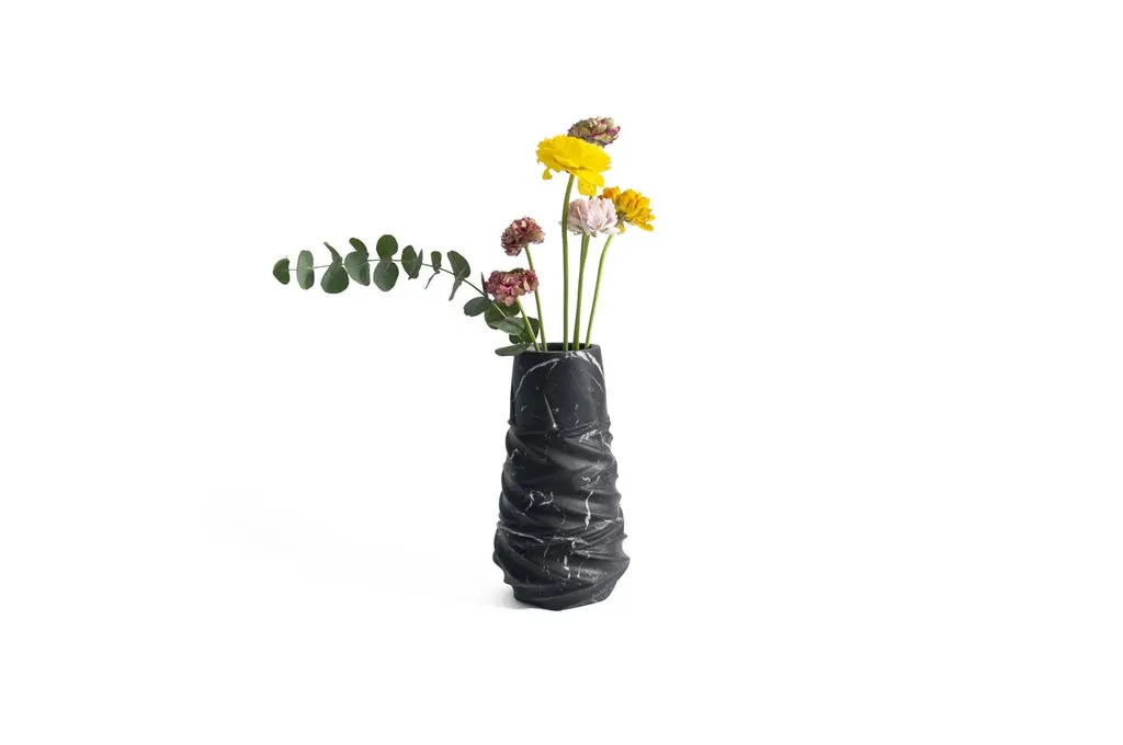 Rock vase in black Marquina marble. -Jacopo Simonetti Design for FiammettaV-Each piece is in a way unique (every marble block is different in veins and shades) and handmade by Italian artisans specialized over generations in processing marble. Slight variations in shape, color and size are to be considered a guarantee of an handmade creation. Important: Do not use lemon or vinegar on it, clean only with water and natural soap (like Marseilles soap), do not put in dishwasher. This object gives a distinct touch to your house and it is suitable for flowers or herbs container.