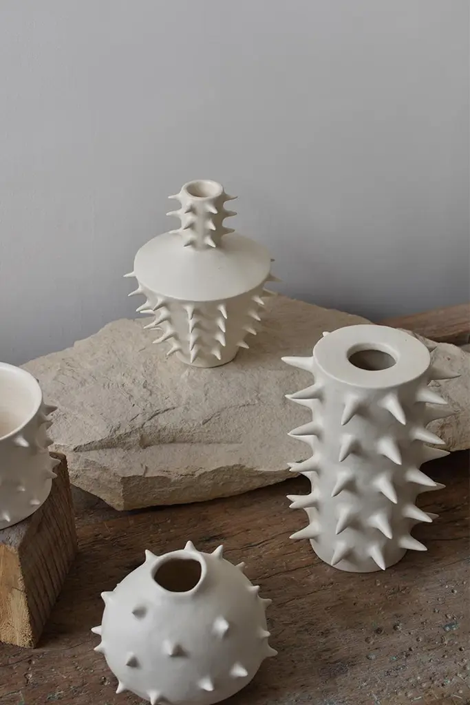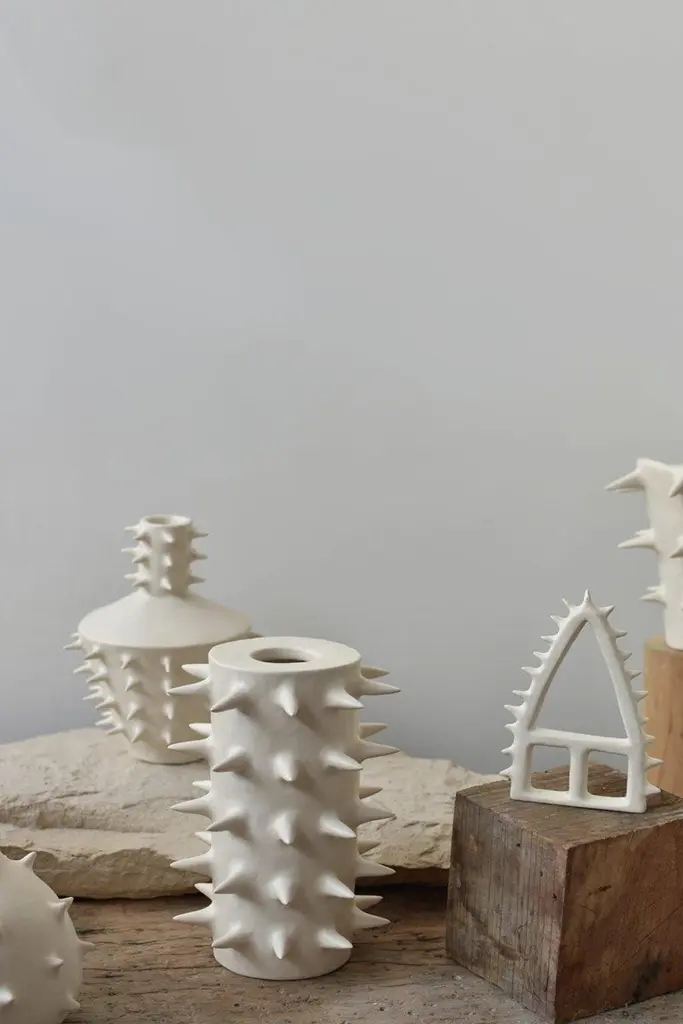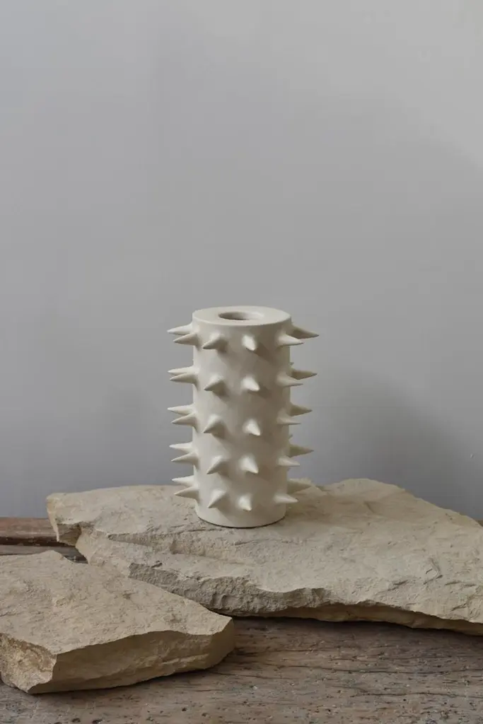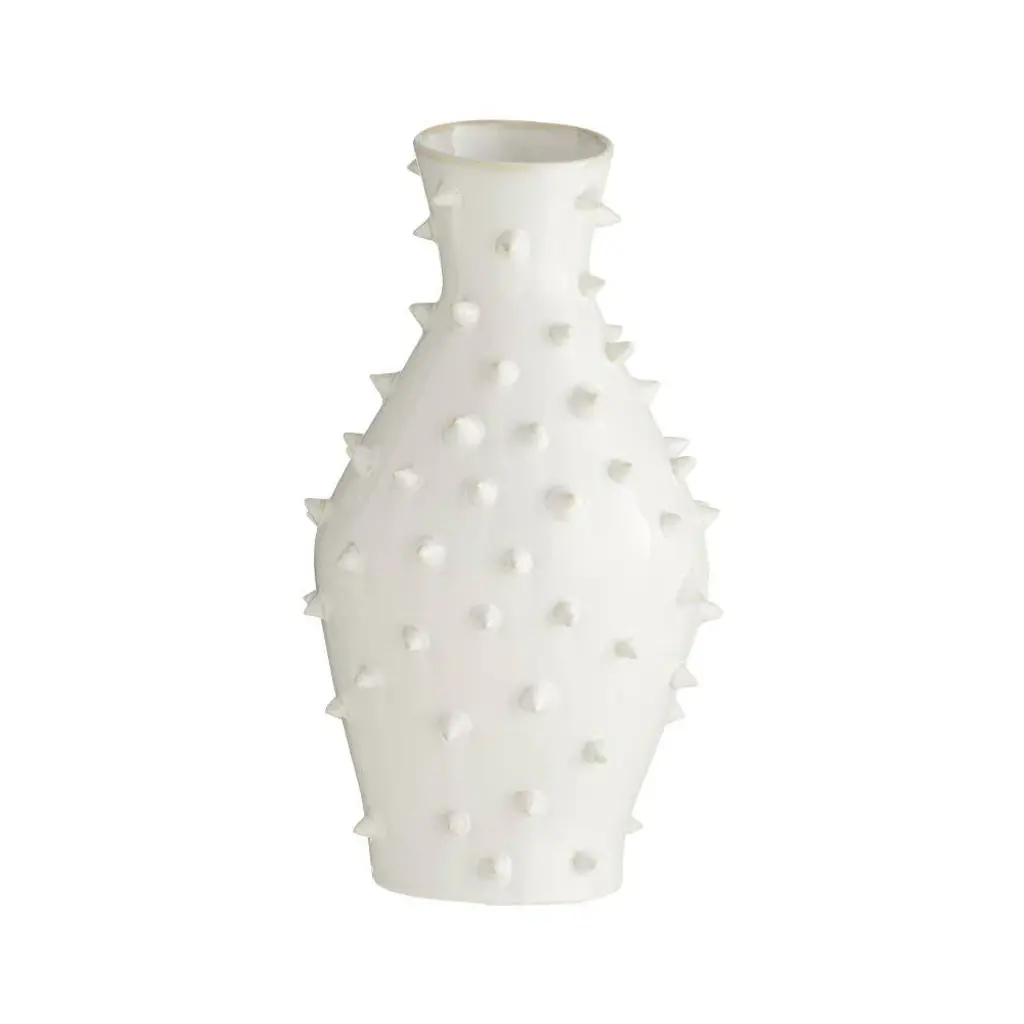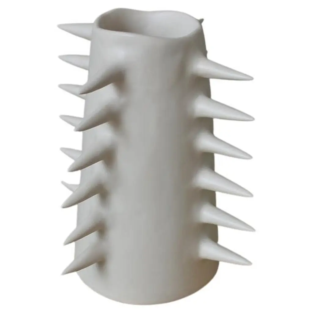 Beautiful tall white ceramic vase with spikes, perfect for showcasing your cherished blooms. Providing a unique perspective from every angle, this handmade pottery vase blurs the line between functionality and ornament. Use it either as a fully functional flower vase or as a decorative sculpture to elevate your home's ambiance.Carefully crafted, each vase is thrown and trimmed on the wheel, and every outer spike is individually attached by hand. Finished with a hand-applied matte hazelnut glaze.The nature of the technique used means that no two pieces are alike, making each item unique and one-of-a-kind. A sculpture in itself, this white ceramic vase makes a great gift for any art lover.✺ Dimensions26cm. (H) and 20cm. (W) / 10.23" (H) and 7.87" (W)✺ Custom sizeThe vase size is totally customizable. Just share the measurements you'd like, and we'll create it accordingly.✺ Handmade and one-of-a-kindBecause of the handmade nature of this product, each tall white vase is unique and may have some slight variation in size and form from piece to piece. Handmade in Buenos Aires, Argentina