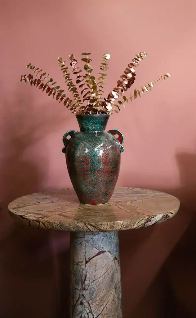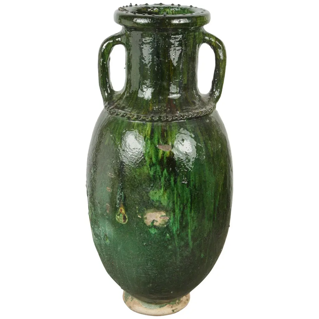 Our contemporary Tamegroute vase, handcrafted and waterproof, is perfect for any floral arrangement or as a standalone piece of decor. Its unique firing process not only ensures it holds water but also contributes to its distinctive character. The clay’s natural granularity, enriched with rock and sand, bestows each vase with its own set of imperfections, making every piece truly one-of-a-kind. Influenced by various factors like kiln placement and glaze mix, no two vases are the same. Authentic and hand-formed, these vases embrace their natural flaws and variations, which are a testament to their artisanal origin and the legacy of craftsmanship passed down through generations. ● Size: 10" x 15" H Opening 5" ● Handmade in Morocco ● Material: Clay