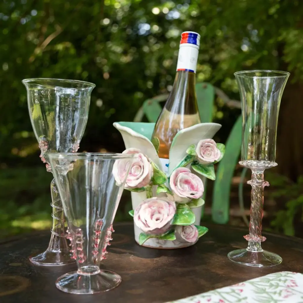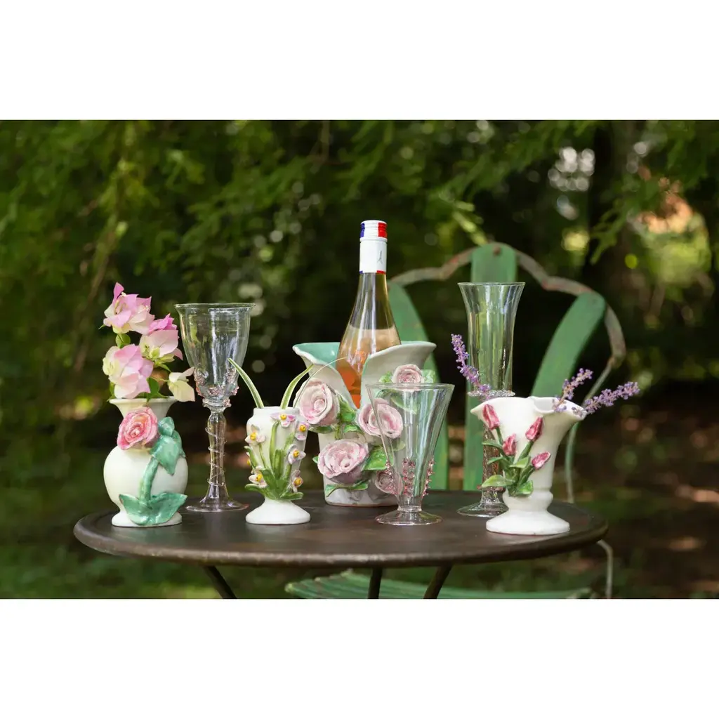 With vintage appeal, this charming vase is adorned with pink roses applied to a split opening vase, revealing a coordinating leaf green interior. Beautiful + functional, this vase doubles as a wine chiller.