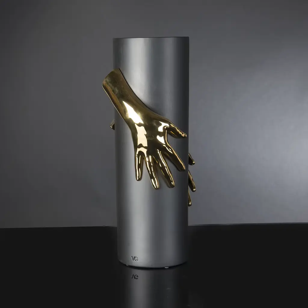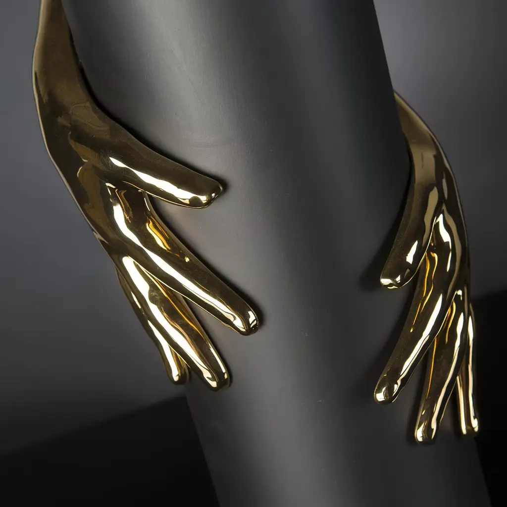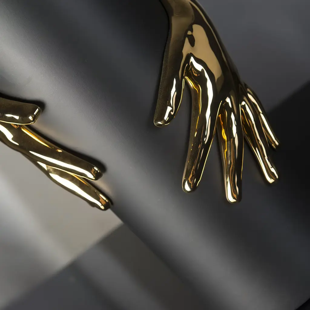 A tribute to Italian art and craftsmanship, this striking vase exudes refined sophistication. Handcrafted of matte black-lacquered ceramic, the cylindrical silhouette of the vase is enriched with a magnificent low relief of two hands almost touching each other, superbly fashioned of 24k gold.