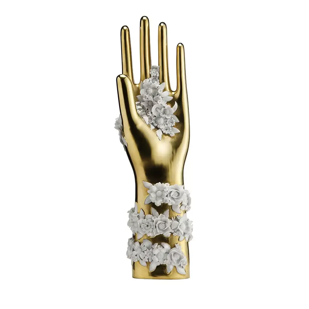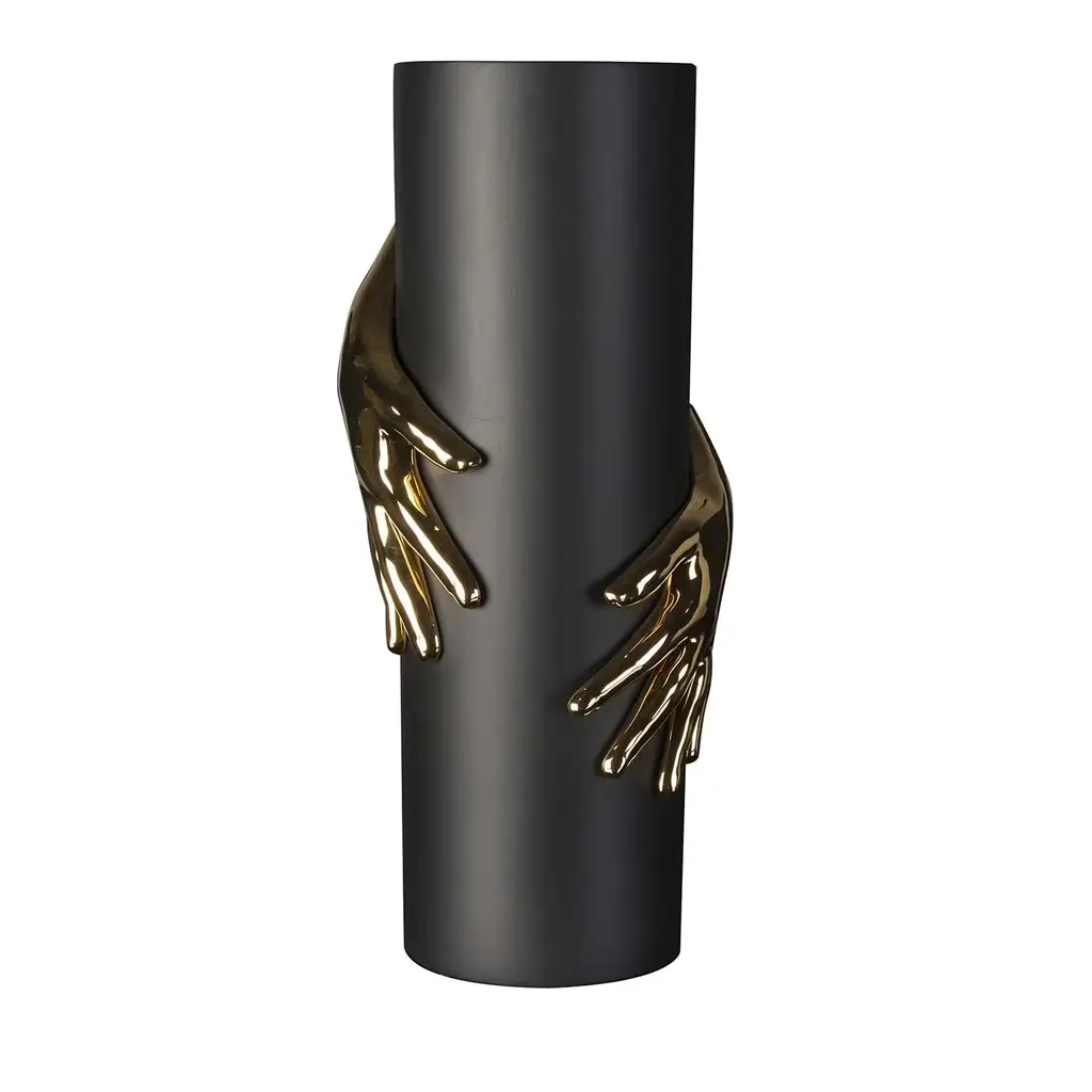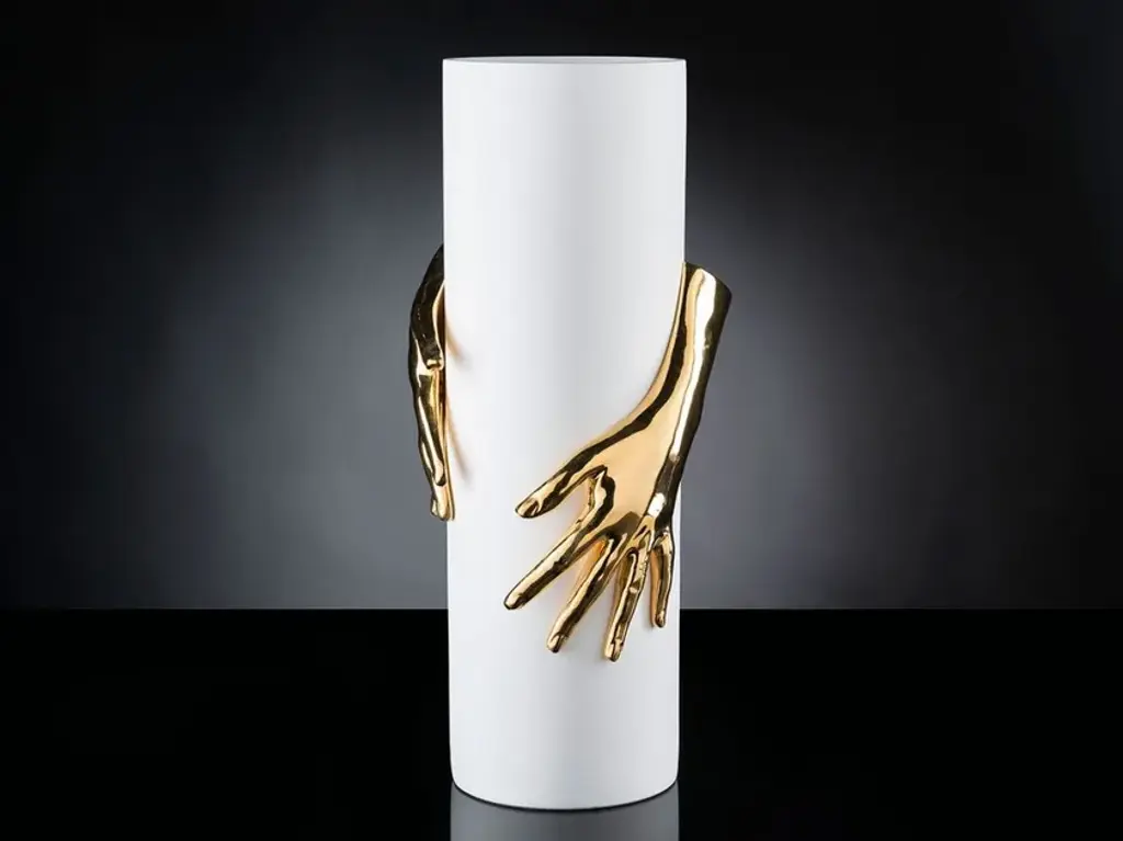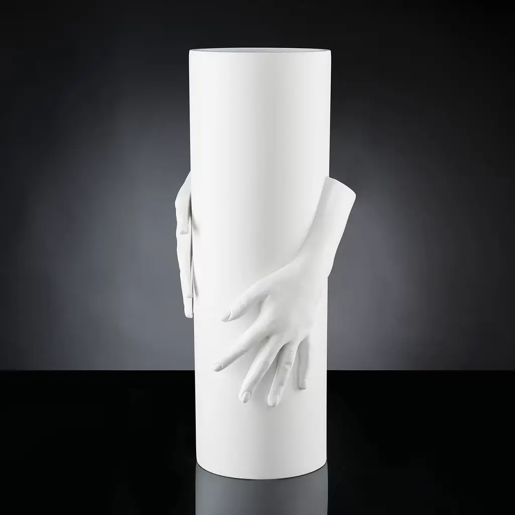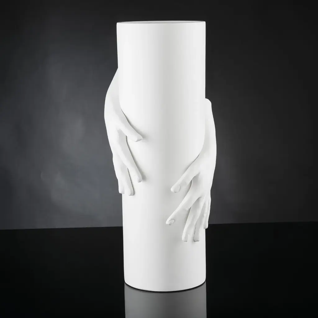 When art and design meet, a sculptural piece of functional decor is created. This magnificent vase, superbly handcrafted of white ceramic, boasts a masterful low relief of two hands attempting to touch each other, elegantly embracing the cylindrical silhouette of the vase.