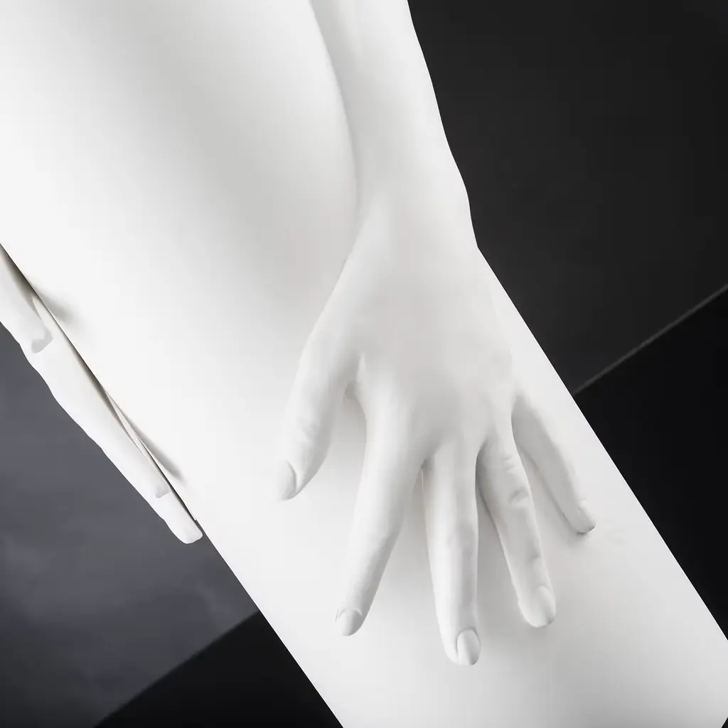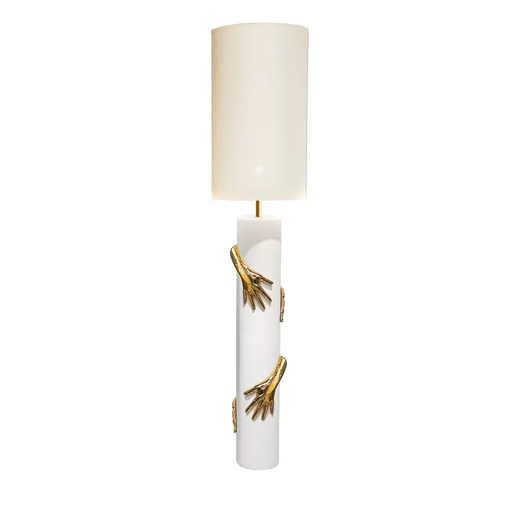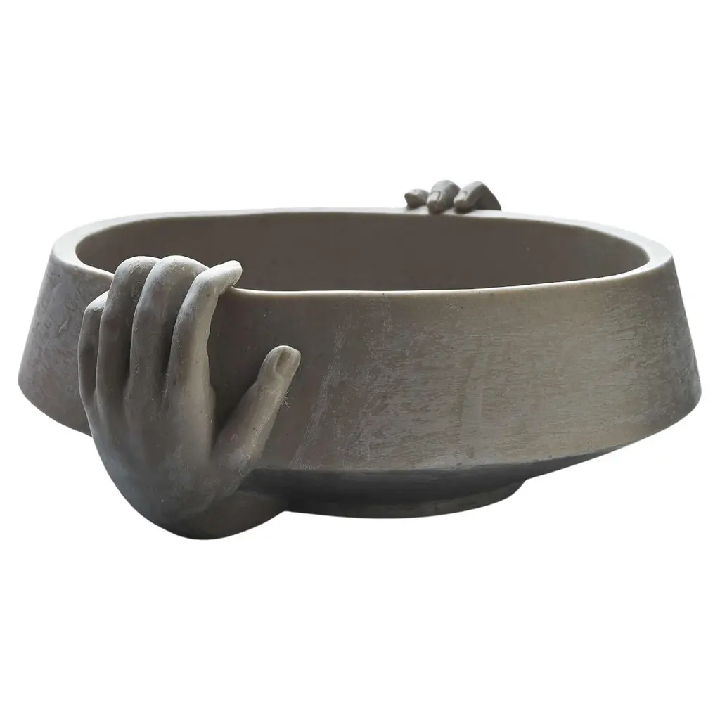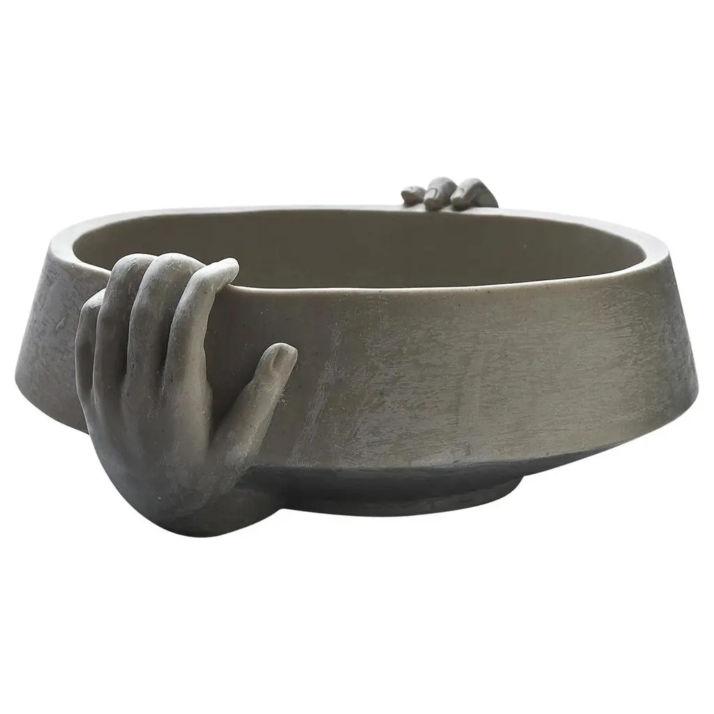 When art and design meet, a sculptural piece of functional decor is created. This magnificent vase, superbly handcrafted of white ceramic, boasts a masterful low relief of two hands attempting to touch each other, elegantly embracing the cylindrical silhouette of the vase.