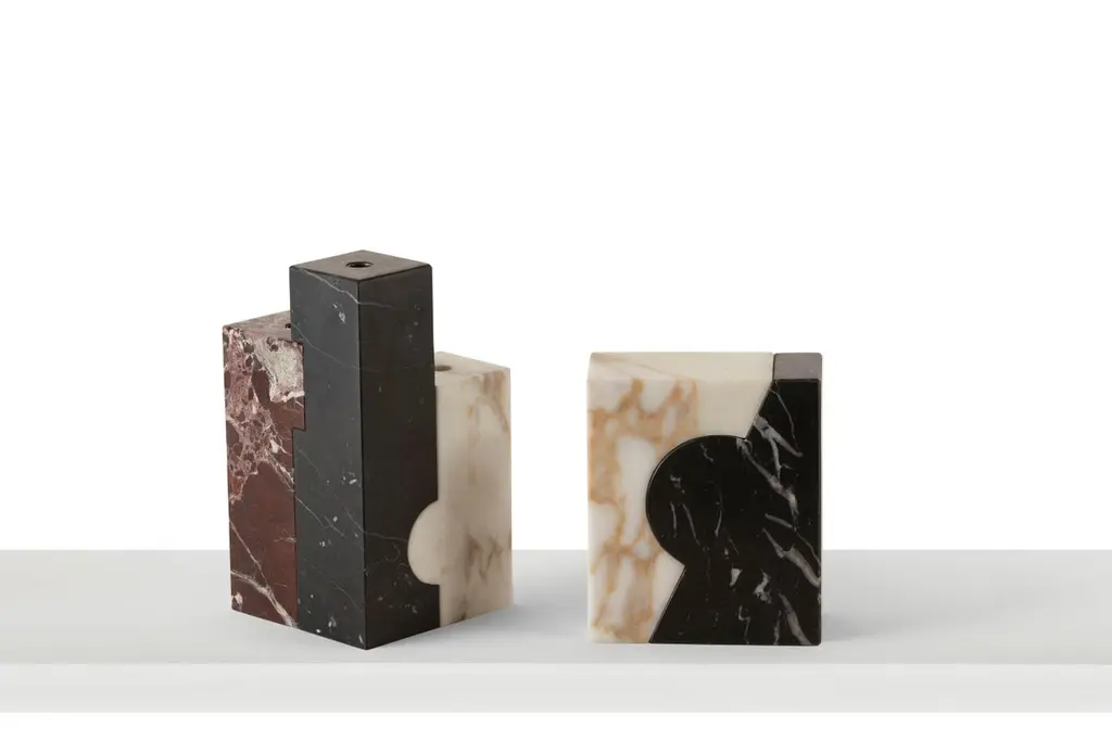 Series of marble vases and bookends in the variants: lepanto red, alpi green and marquinia black.Both bookends and vases feature a complementary structure that intersects, acquiring a monolithic form when joined and at the same time can be broken down with a small gesture.The jars have a removable pyrex glass tube inside.