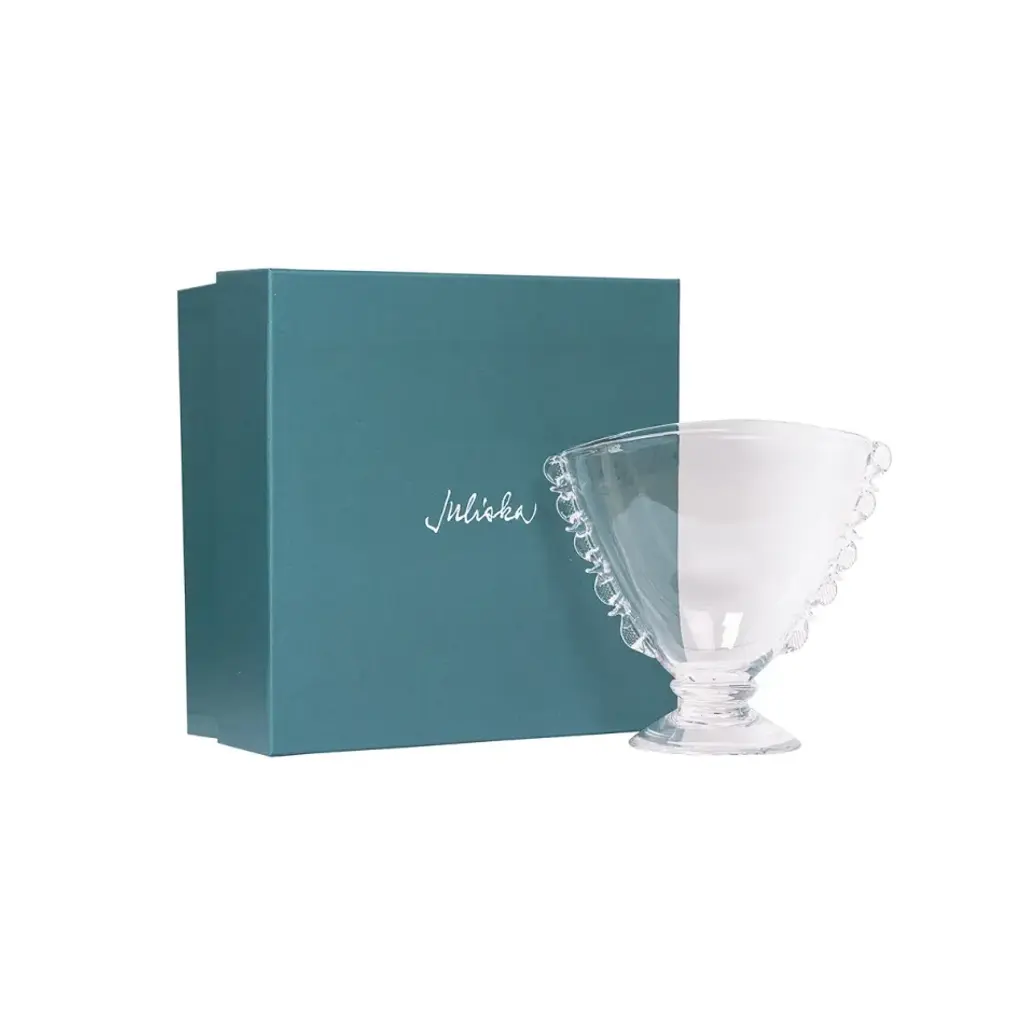 Lady Harriet is no shrinking violet, nor is she a wallflower. Her feminine fan-shaped silhouette sits upon a pedestal (where she rightly belongs) and is boldly bedecked with an eye-catching ruffle. Moderately sized, this 9” vessel is ideal for displaying blushing blooms from your garden to wildflowers gathered on a spring day. Based in Connecticut, Juliska is committed to bringing elegant European design into our modern homes. Since its founding in 2001, when David and Capucine Gooding began by working with artisans outside of Prague to reproduce antique Bohemian glass pieces, every piece from Juliska has shared a rich heritage spanning six centuries of European design. Juliska's creations are timeless, romantic and effortlessly chic.