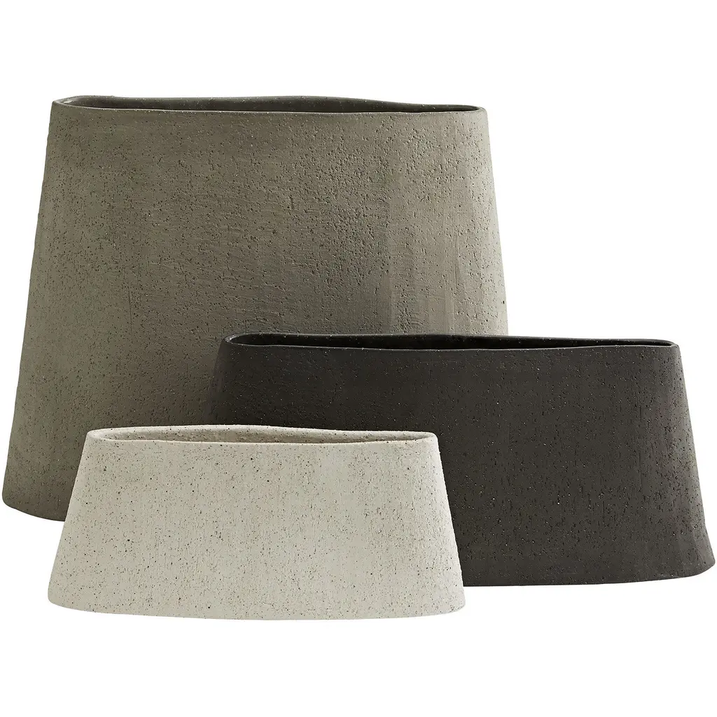 This set of three ceramic vases is an artistic expression of natural materials. Artisans incorporate sand into the ceramic to create the incredibly textured faade of each piece, which is finished in either ivory, gray or charcoal. The slender profiles and varied scale are ideal for a mantle or bookcase. Finish will vary.
