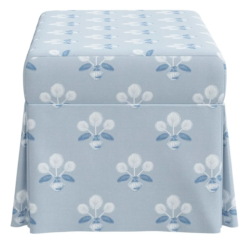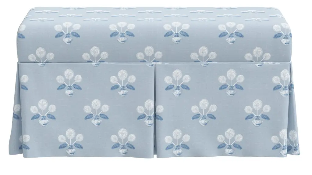 Exclusive to One Kings Lane: A perfect marriage of style and function, this bench has a tailored skirt and upholstery in a painterly floral print. The comfortably padded, lift-top seat lifts open to reveal always-welcome storage space.