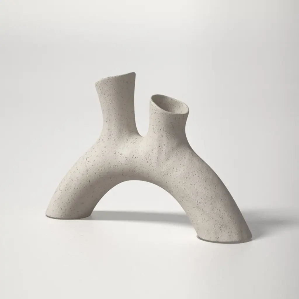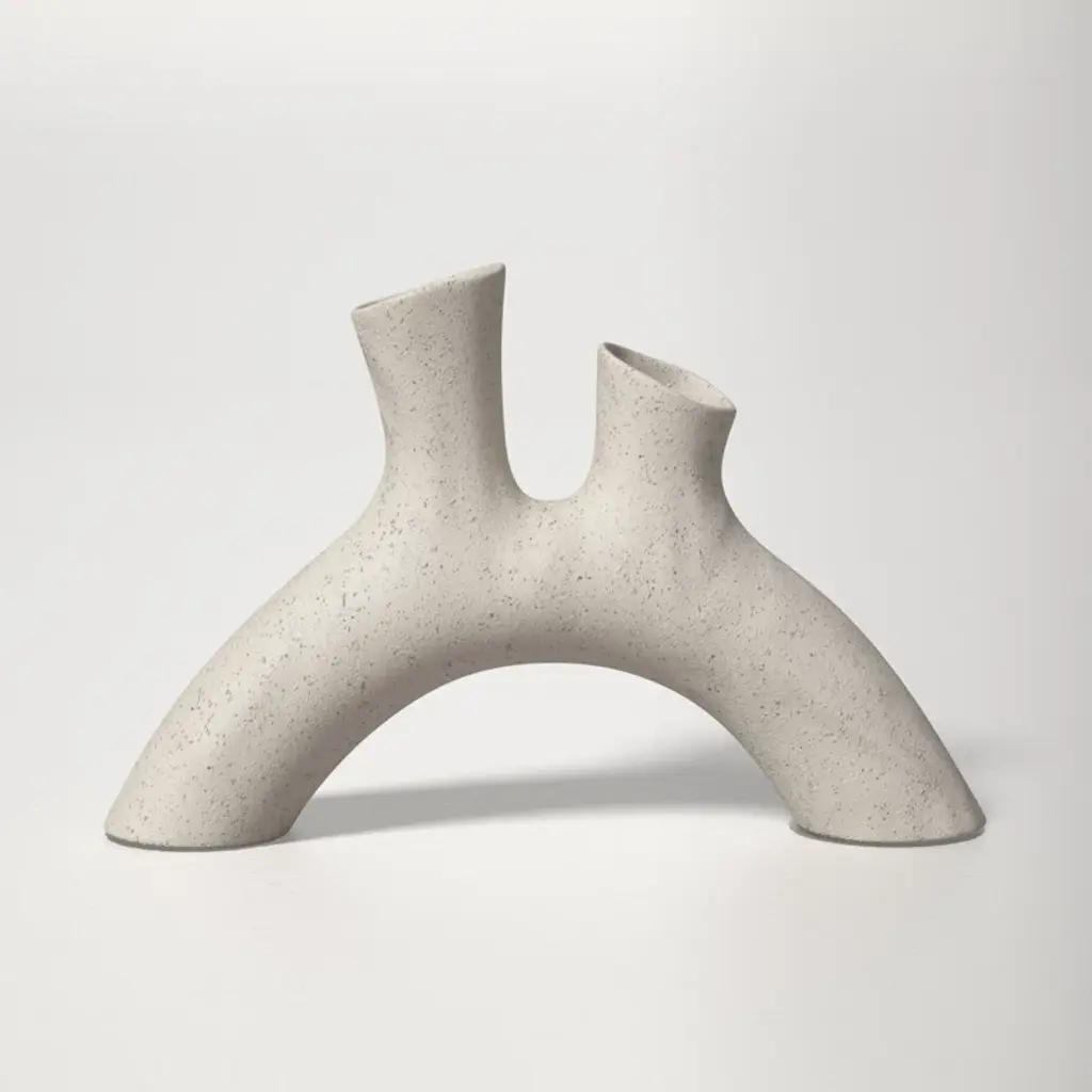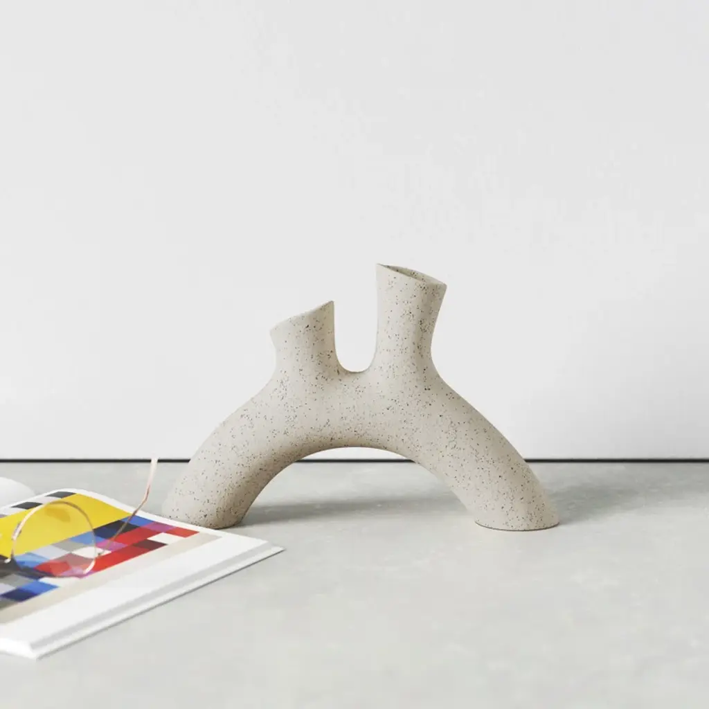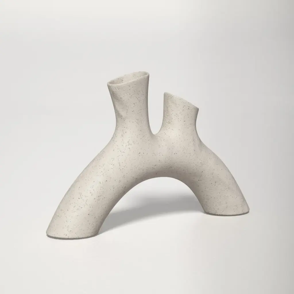 The ceramic Helga Vase is subtle but show-stopping, whether used as a bud vase or simply as a decorative sculpture piece. Its artful shape adds a playful flair to the shelf and its sandy texture with a matte white finish complements any decor.