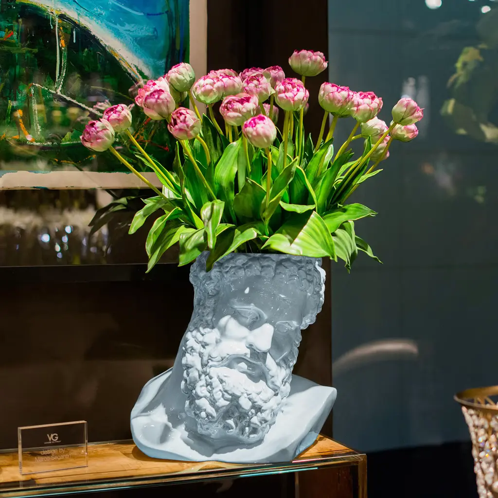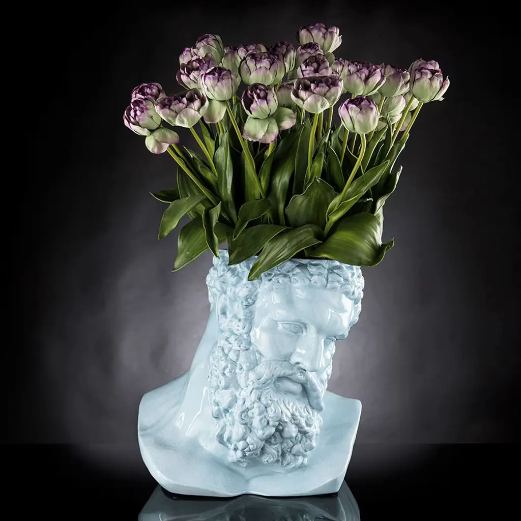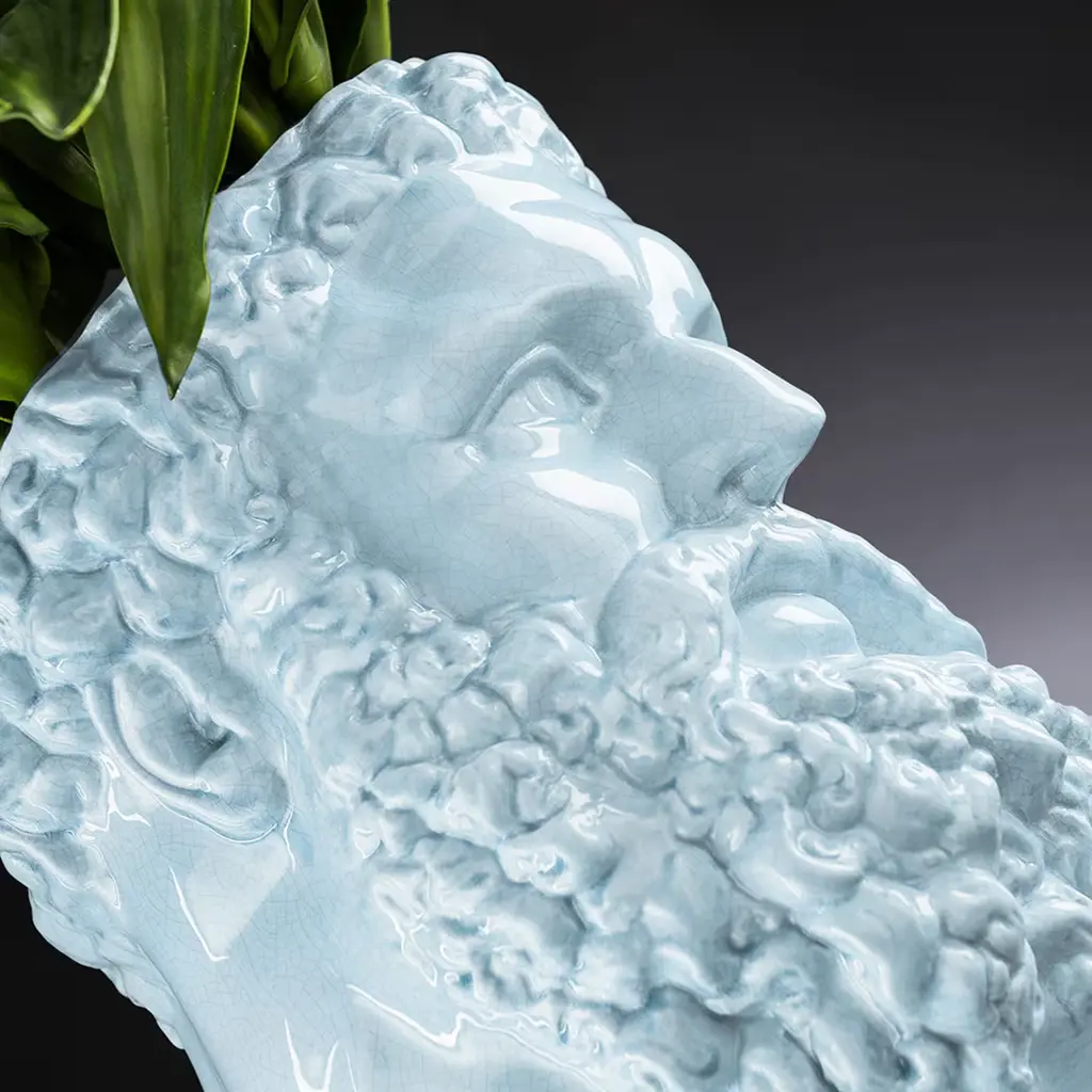 The Hercules Purist Blue Vase boasts a striking fusion of classical Italian art and modern styling, offering an intricate depiction of the the famous Greek hero. Beautifully hand-crafted by expert artisans from ceramic, this decorative piece is defined by a pale blue finish, adding a pop of color to any interior space.