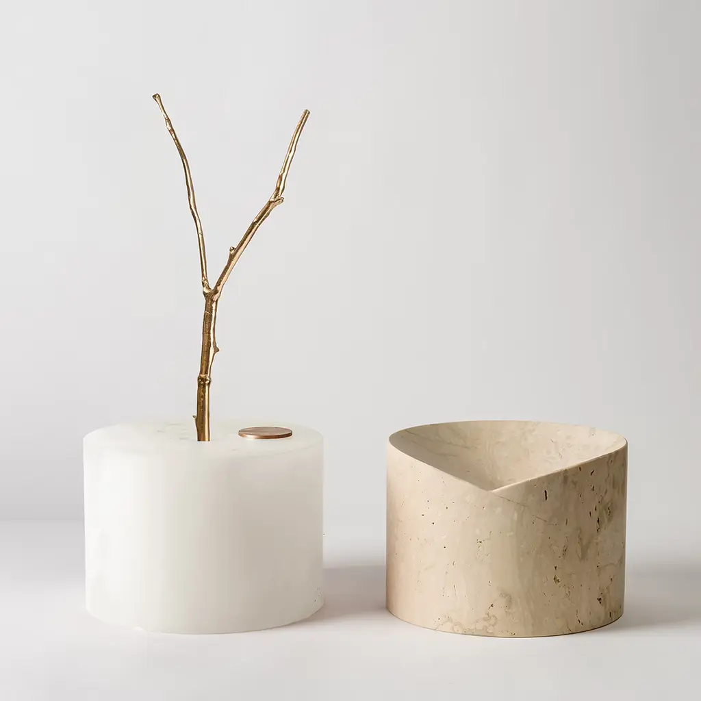 Alimonti Milano's Marmoreals Collection, crafted by Gennaro Avallone, unites the extraordinary potential of marble with the innovative vision of the artist. Focused on refined textures and artisanal experimentation, this limited edition sculpture series elegantly blends Anthracite, Pink Onyx, and Ostuni White. These pieces, harmonizing opposites, exist in single hues or contrasting combinations of natural stones and bronze casting, paying homage to the material.