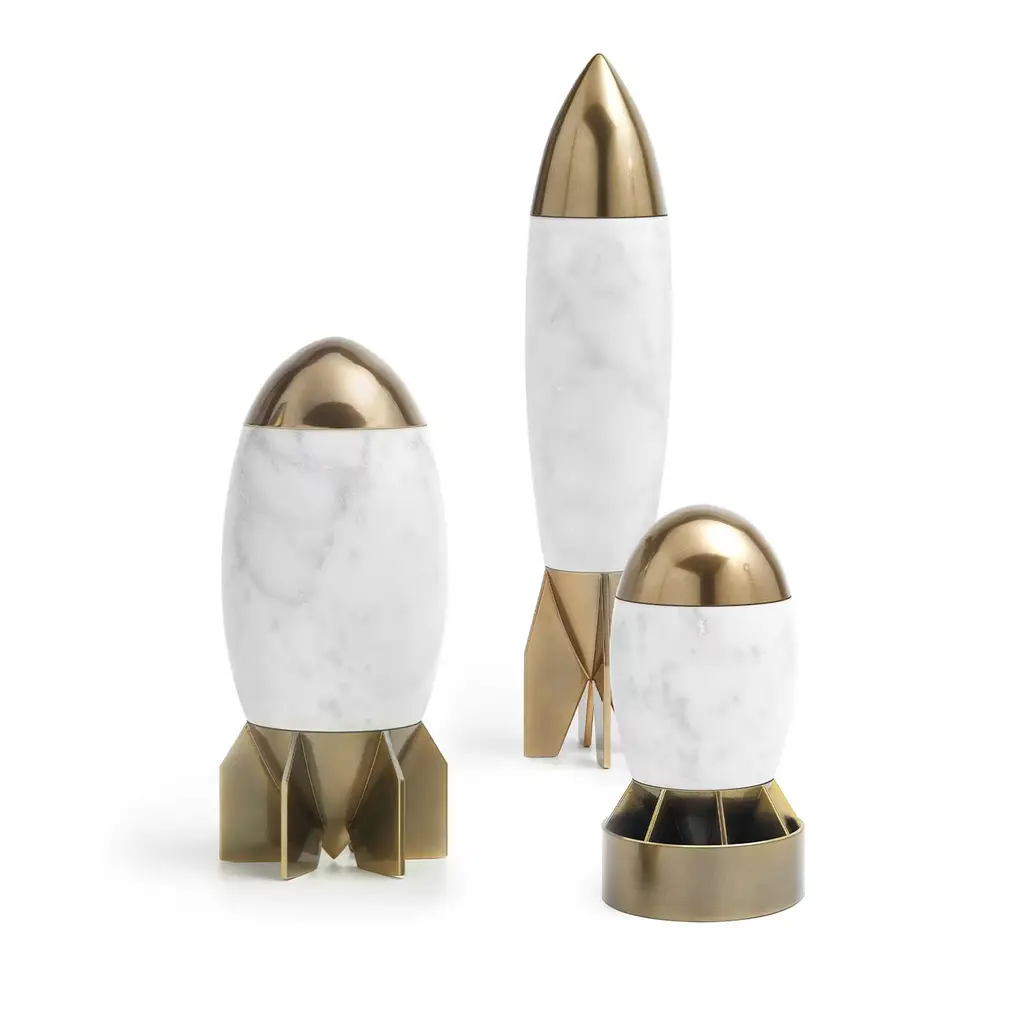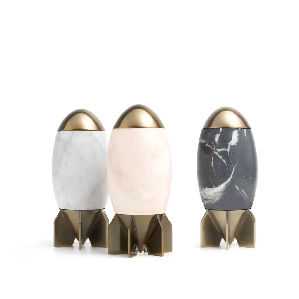 "Herma small container comes with the idea of overcoming the horrifying reality of war through irony. The rocket thus becomes a humorous, yet functional, home accessory. An object that exorcizes fear, proposing a new vision of reality. When opened, the vase reveals a surprise and the bang effect of a bomb causes an explosion of joy and pleasure..." Sex toy, suitable as a vase too, with base and cap in 3D printed ABS with dark bronze finishing. Container body and inner dildo in matt Carrara marble. Variations Available: Sex toy, suitable as a vase too, with base and cap in 3D printed ABS with dark bronze finishing. Container body and inner dildo in matt marbles to choose from: Nero Marquina, Carrara and Pink Portugal.