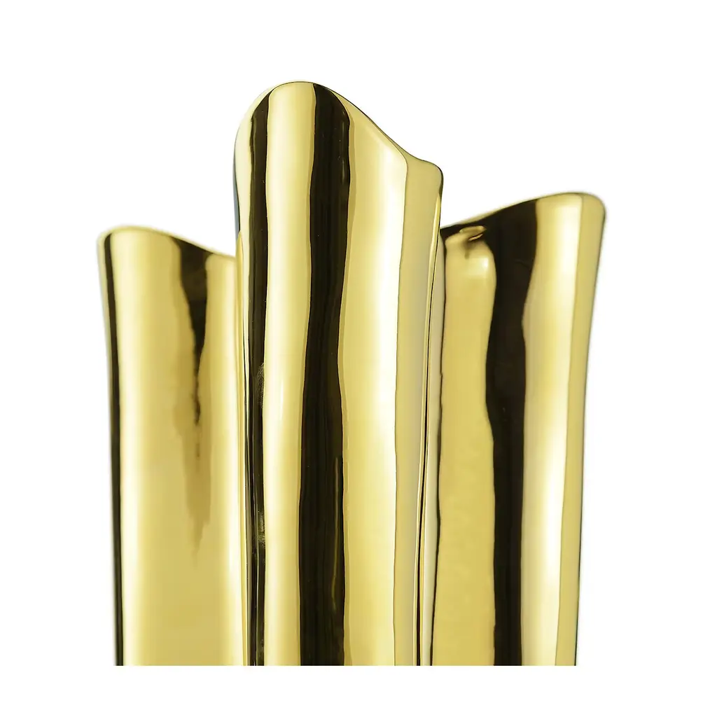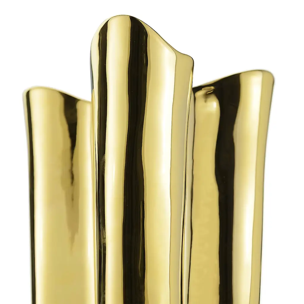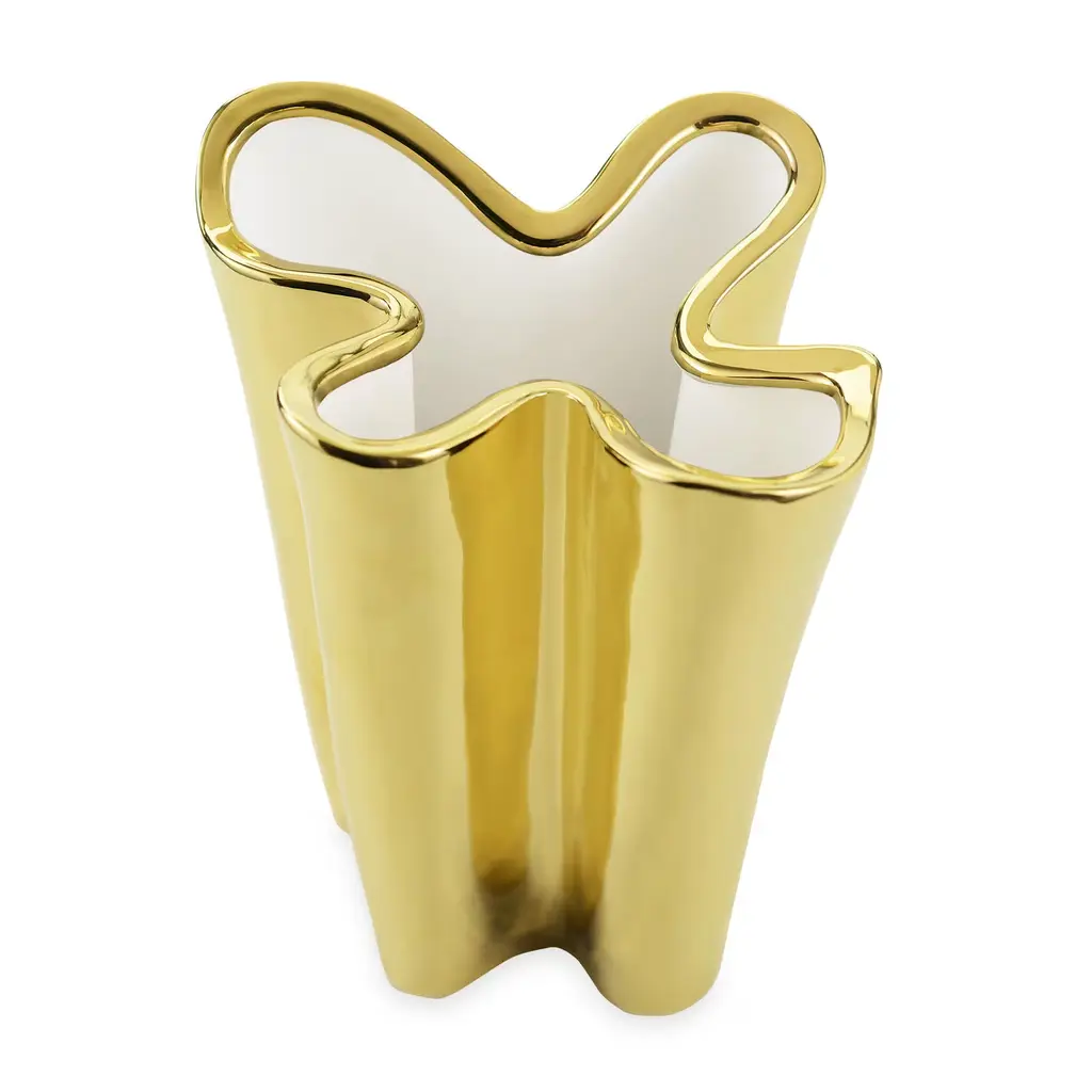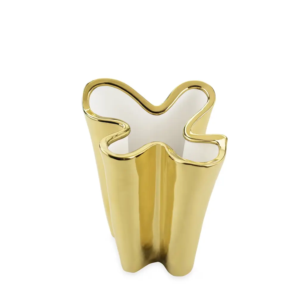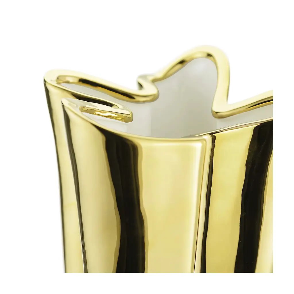 This striking vase will make a statement in any decor, particularly if contemporary, thanks to its innovative silhouette and the striking glossy gold color of its external finish, which complements the white opaque hue of the interior. Either displayed alone as unique sculpture, or used as a vase, this piece will decorate a living room, an entryway, and a modern powder room. It was entirely made of ceramics and is available in other finishes. Please ask the concierge for details.