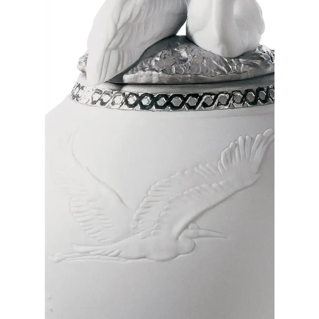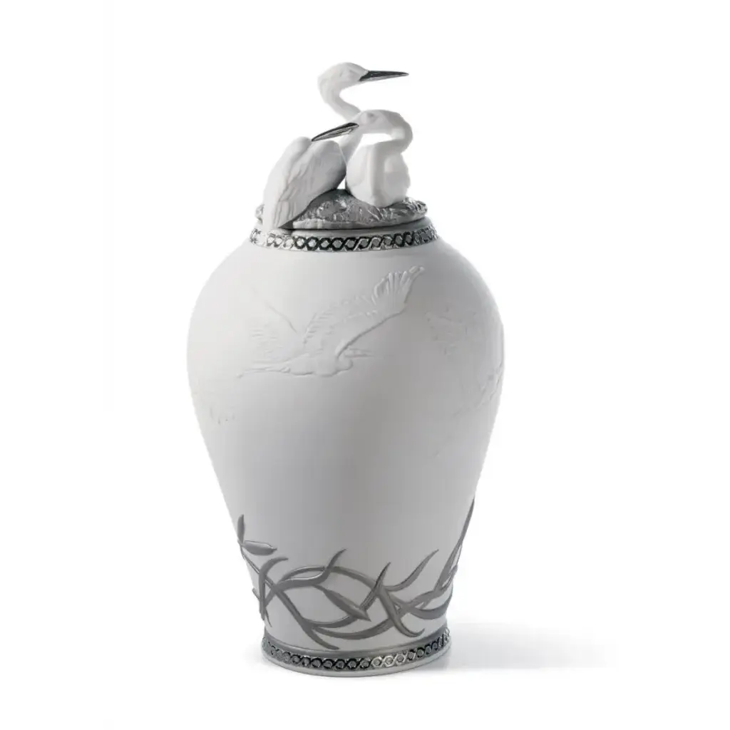 Matte white porcelain Tibor with royal herons decorated with silver luster with touches of glitter and matte. An iconic Spanish brand, Lladro is a world leader in the creation of porcelain art. Started by brothers Juan, Jose and Vicente Lladro in 1953, the ceramic figurines were initially inspired by the works of great European manufacturers like Meissen and Sevres. Over time, a unique style was forged, consisting of elongated lines, a revolutionary single-firing method, and soft pastel tones.