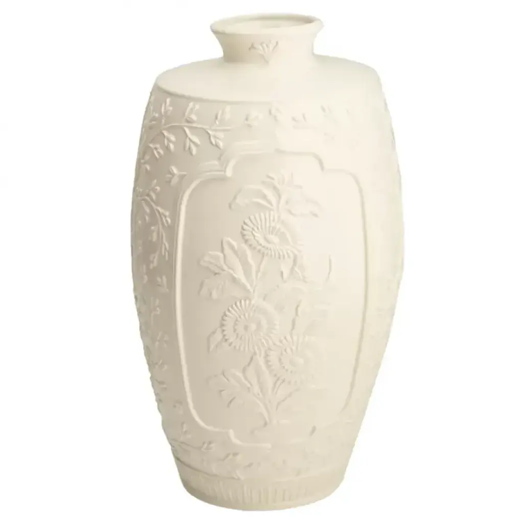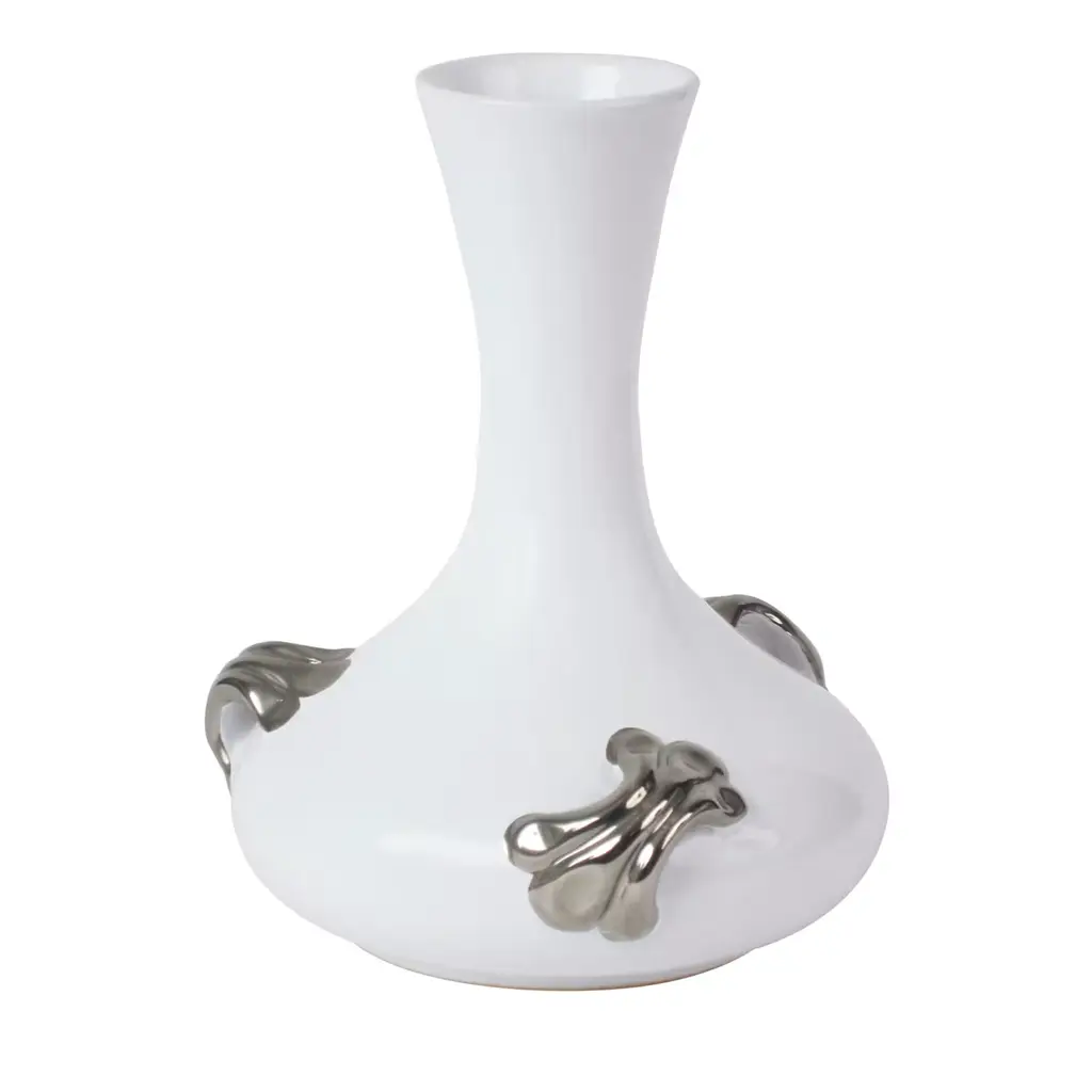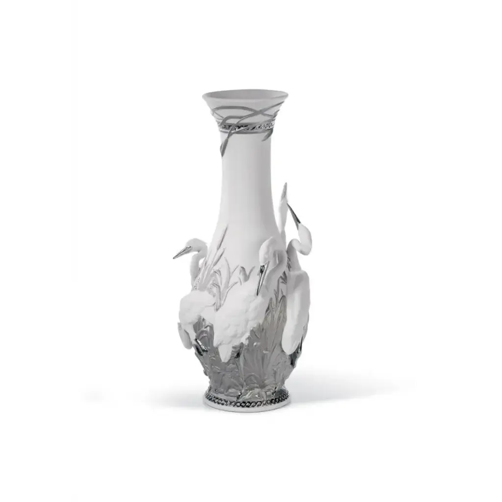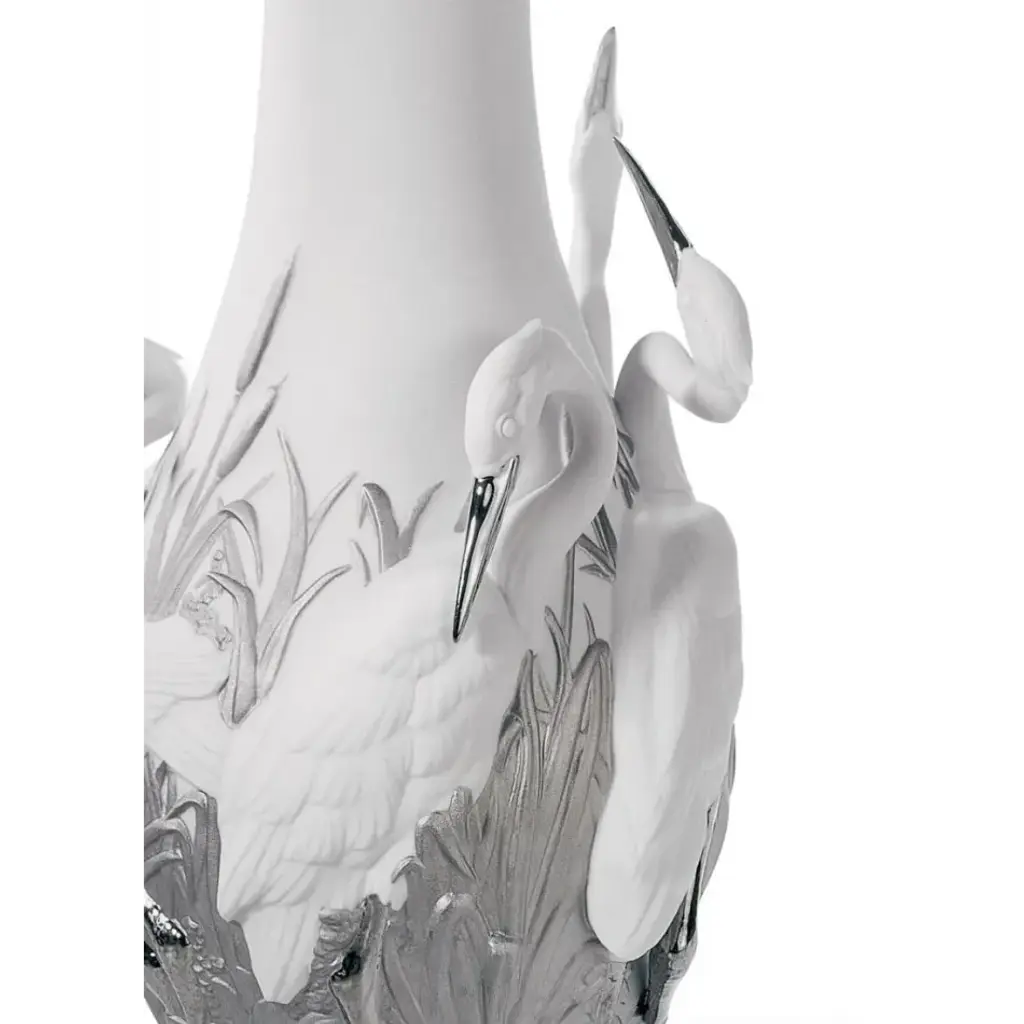 White porcelain vase with matte white porcelain and herons decorated with glossy and matte silver luster for home decoration. An iconic Spanish brand, Lladro is a world leader in the creation of porcelain art. Started by brothers Juan, Jose and Vicente Lladro in 1953, the ceramic figurines were initially inspired by the works of great European manufacturers like Meissen and Sevres. Over time, a unique style was forged, consisting of elongated lines, a revolutionary single-firing method, and soft pastel tones.