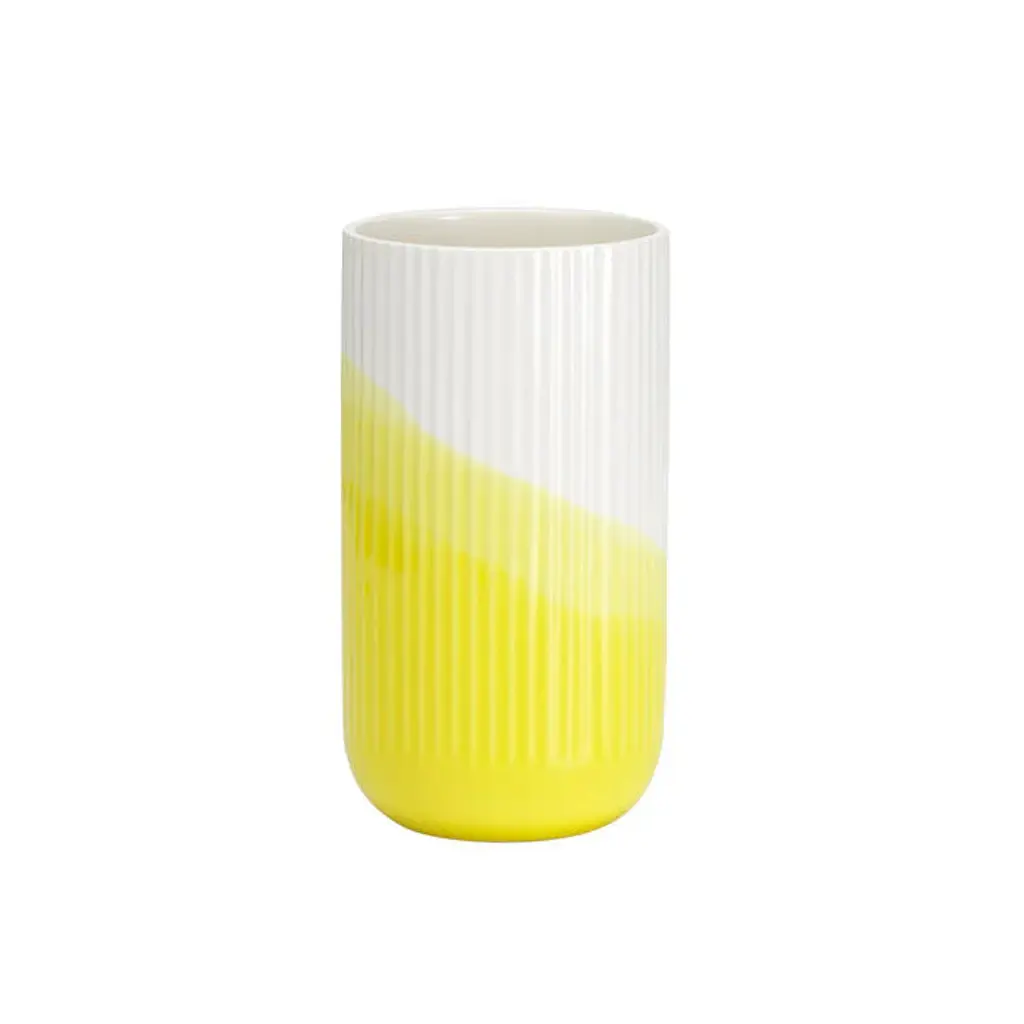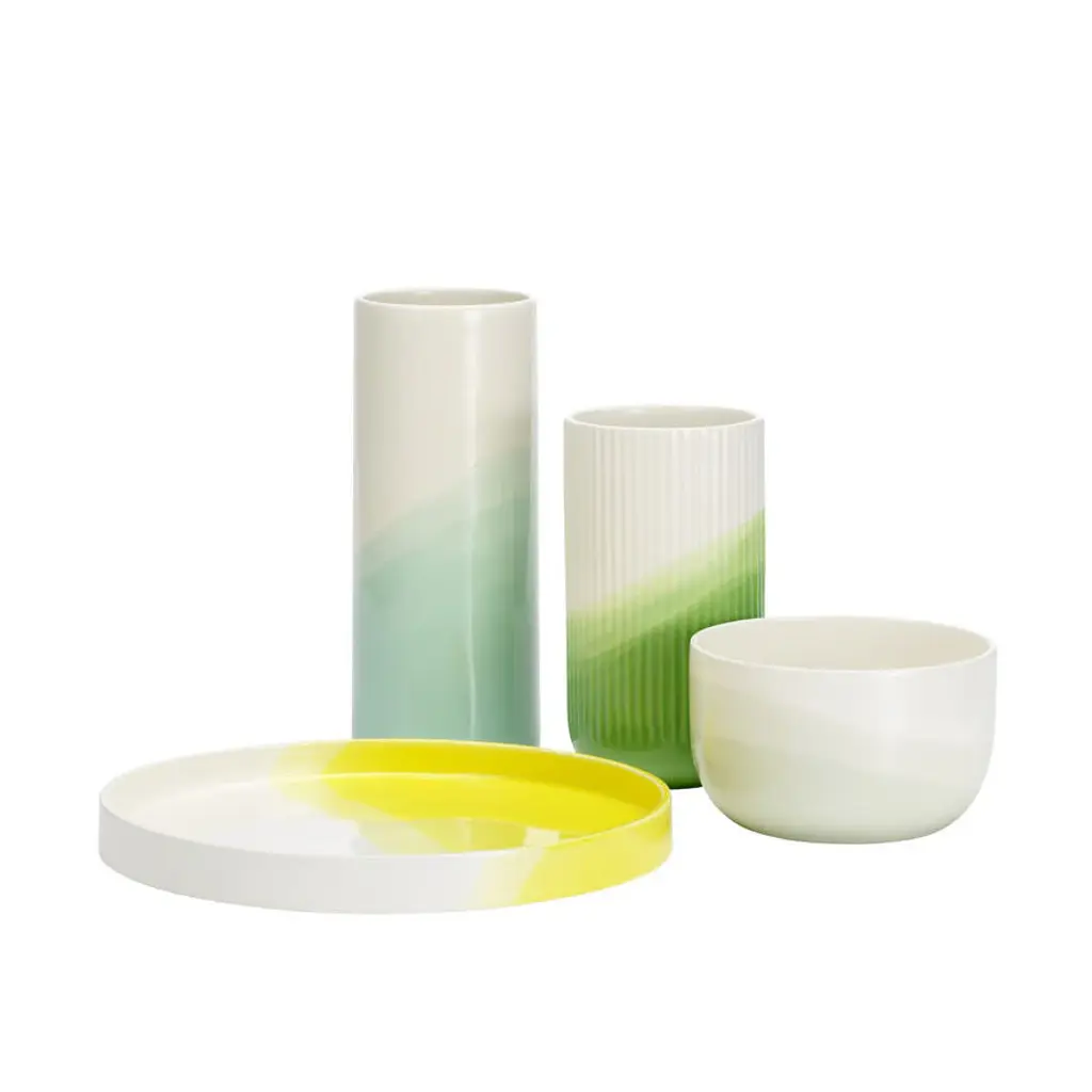 The Herringbone Vessels are created by repeatedly immersing ceramic bowls and vases in a coloured glaze. This process yields a pattern with an intrinsic logic, determined by the dipping angle as well as the shape and weight of the piece. As the dyeing process is performed entirely by hand, each bowl and vase in the Herringbone Collection is a unique object.