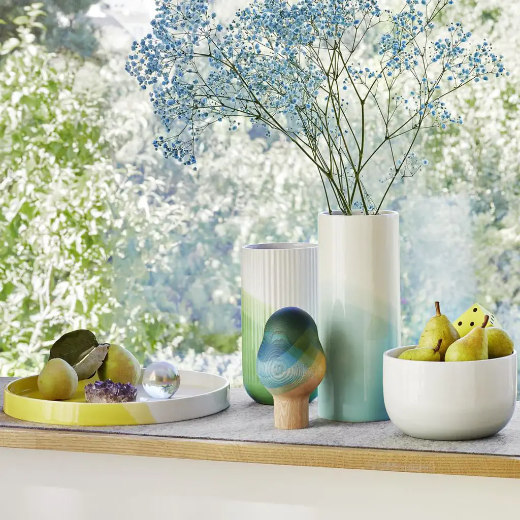 The Herringbone Vessels are created by repeatedly immersing ceramic bowls and vases in a coloured glaze. This process yields a pattern with an intrinsic logic, determined by the dipping angle as well as the shape and weight of the piece. As the dyeing process is performed entirely by hand, each bowl and vase in the Herringbone Collection is a unique object.