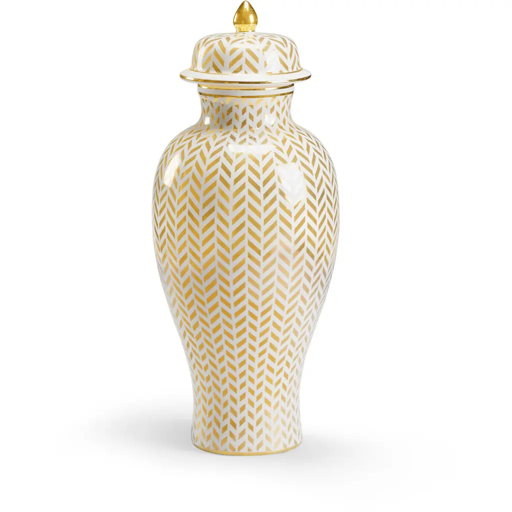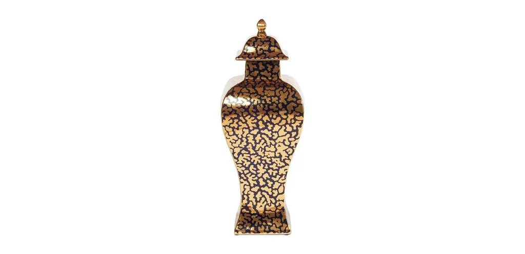 Porcelain. Cream Glaze/Metallic Gold. Cream Glazed Ceramic With Metallic Gold Design And Details. 9W X 9D X 20.25H