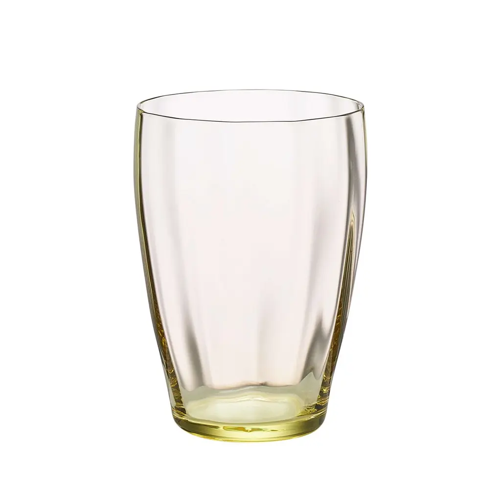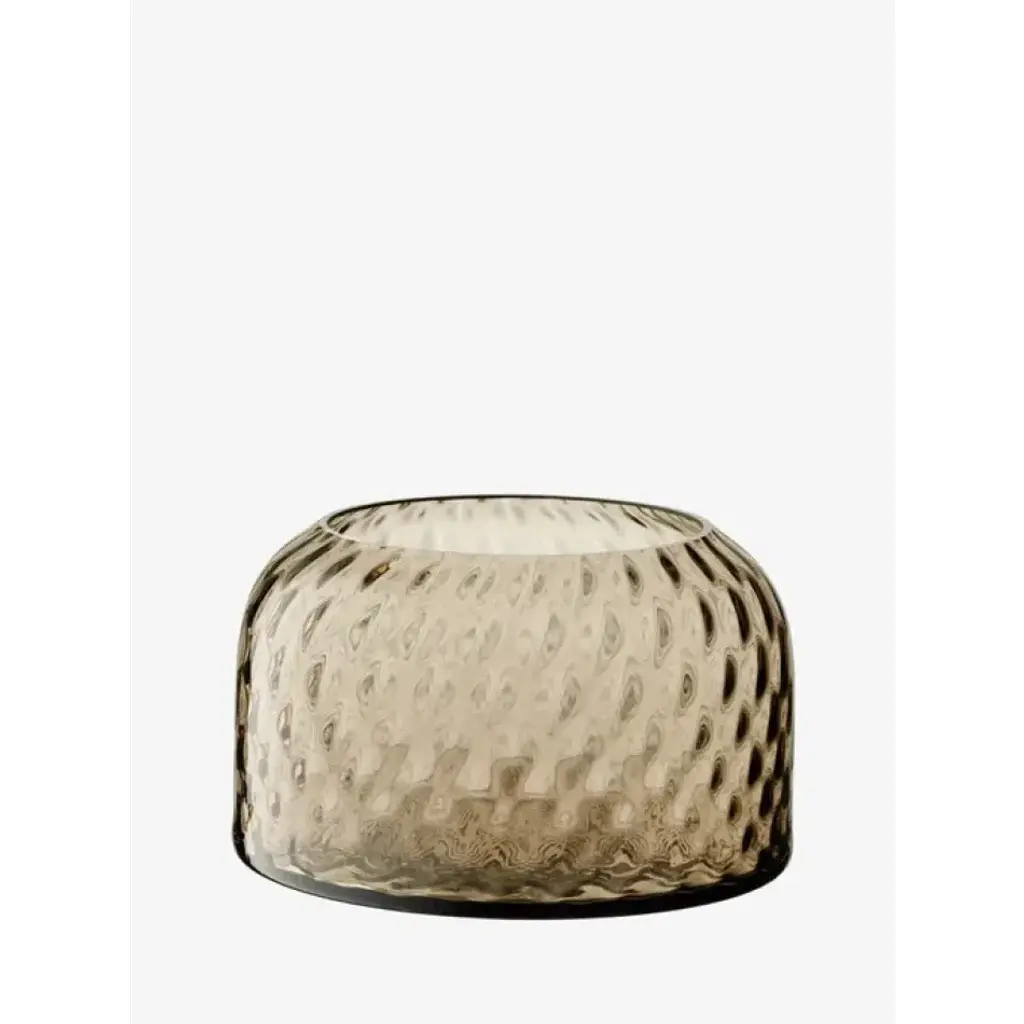 This semitransparent vase has ridges that beautifully filter light through it. Three subtle yet unique colors are designed to complement well-designed palettes.