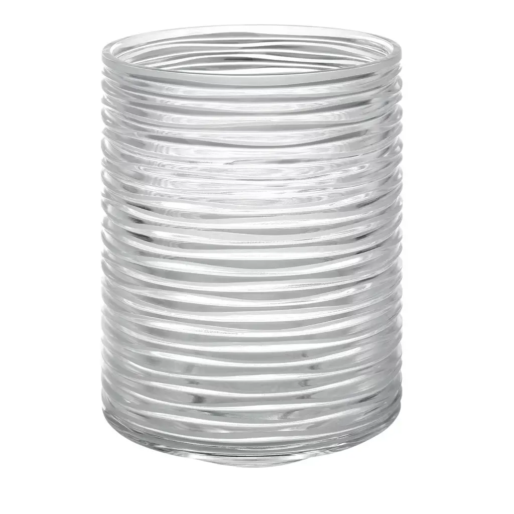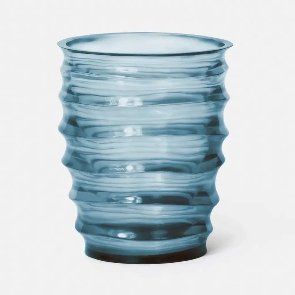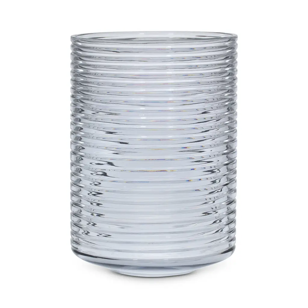 This semitransparent vase has ridges that beautifully filter light through it. Three subtle yet unique colors are designed to complement well-designed palettes.