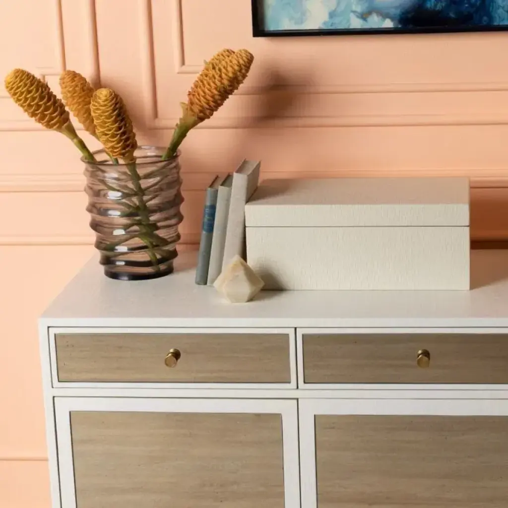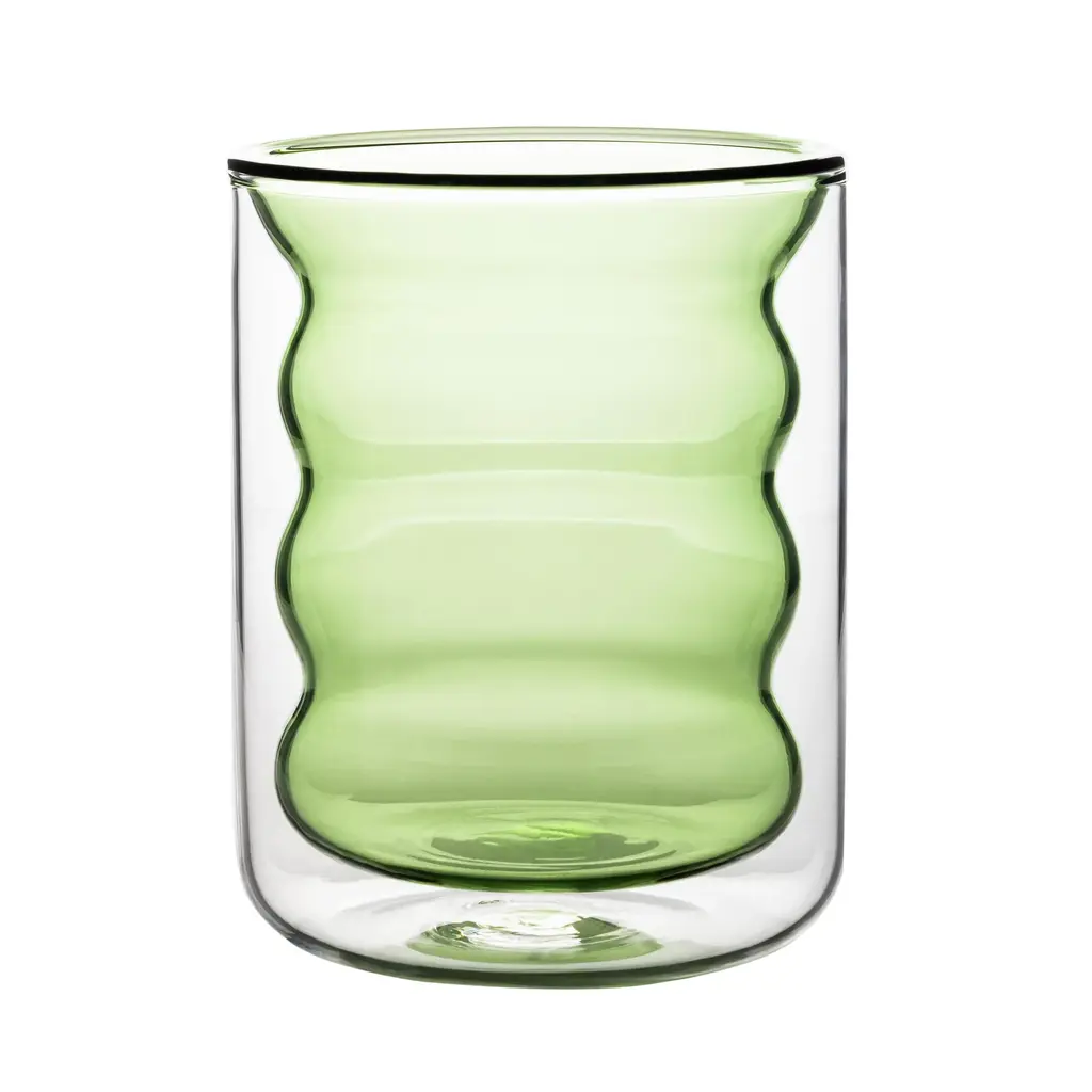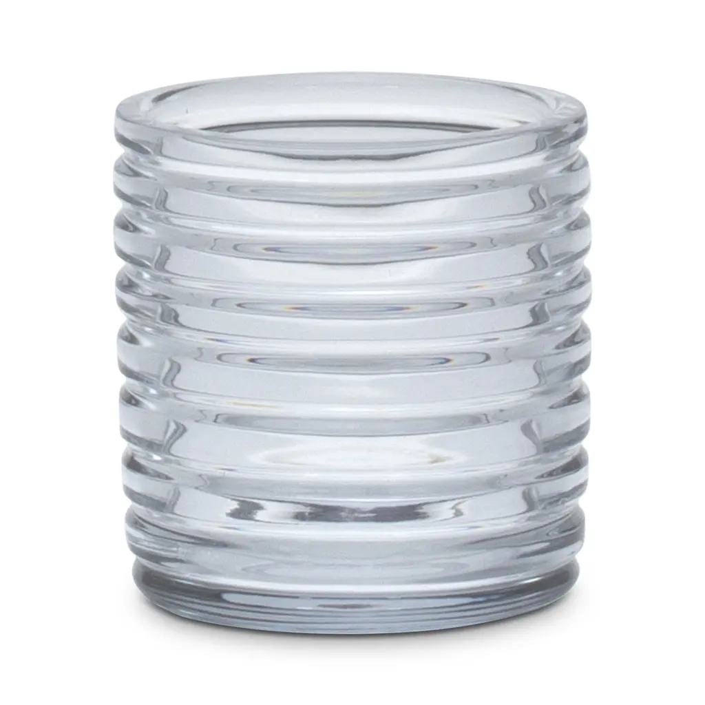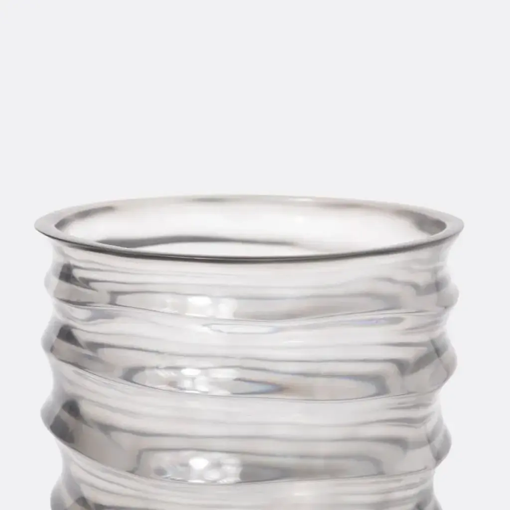 This semitransparent vase has ridges that beautifully filter light through it. Three subtle yet unique colors are designed to complement well-designed palettes.