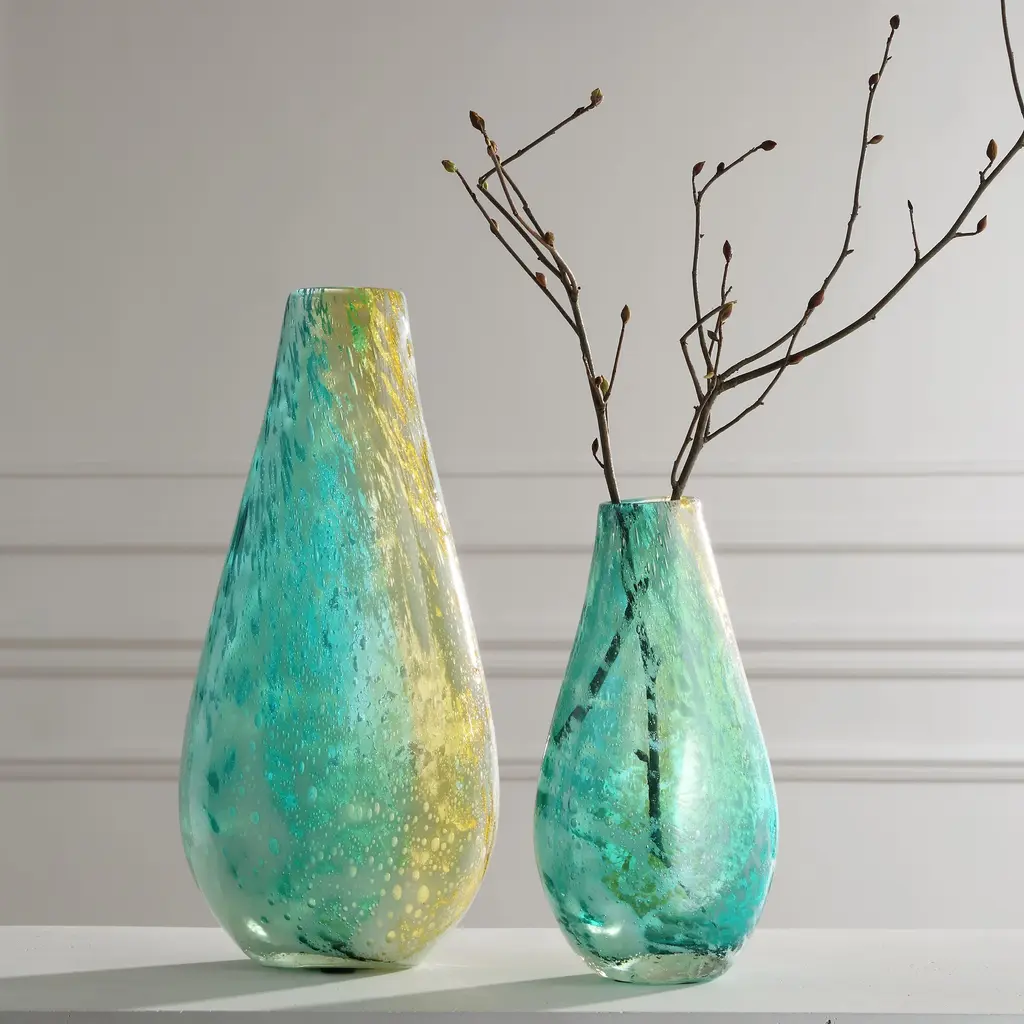 Capture The Serene Beauty Of The Ocean In Your Home With Our Exquisite Teal, Amber, And Gold Bubble Glass Vases. Each Vase Captures The Essence Of Tranquil Waters And Glistening Sands. Perfect For Adding A Touch Of Coastal Charm To Any Space, These Vases Effortlessly Blend Elegance With Natural Inspiration. Sizes S-4x10x5, L- 4x14x7