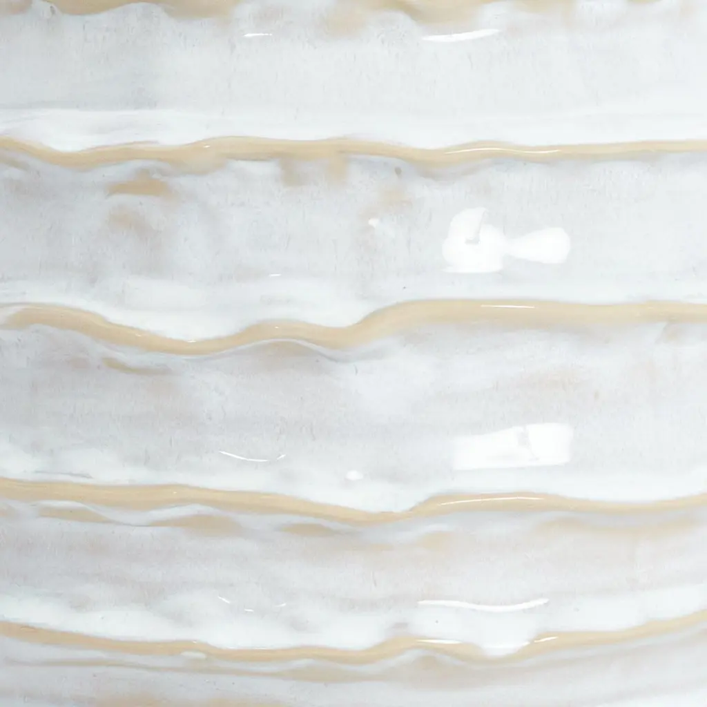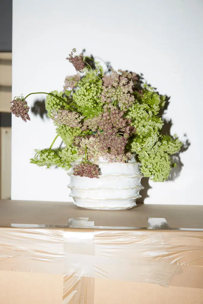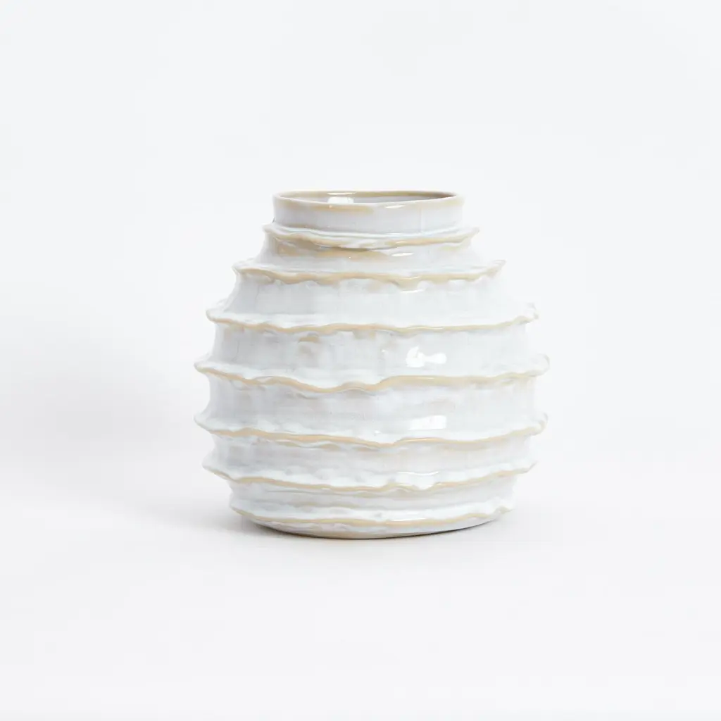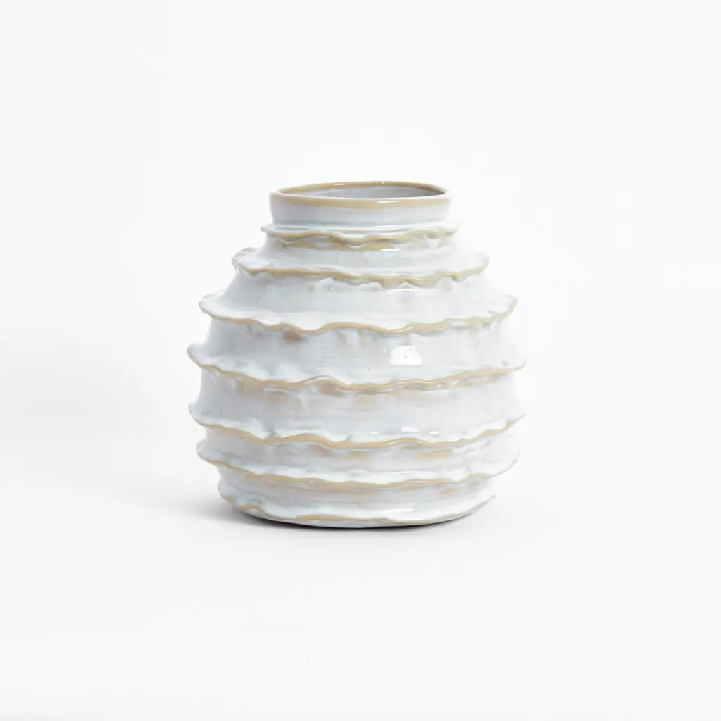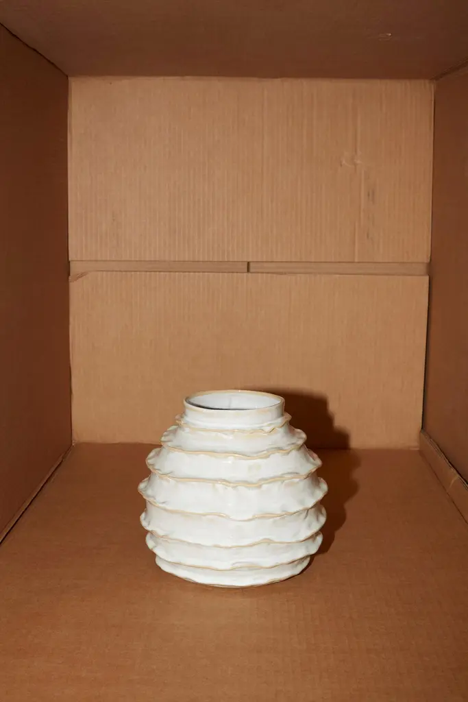 Holiday vase in shiny white.Designed by Project 213A in 2021 handmade stoneware.The oval vase, ruffled on the edges brings about contrast of lightness. This hand made and embellished vase is finished with a contemporary shiny white glaze which appears in some places milky translucent revealing the base colour. Available in two colour options: Shiny White and Dusty BlackColour: shiny whiteHeight: 24 cmWidth: 25 cmVolume: ca 5,5 l Waterproof