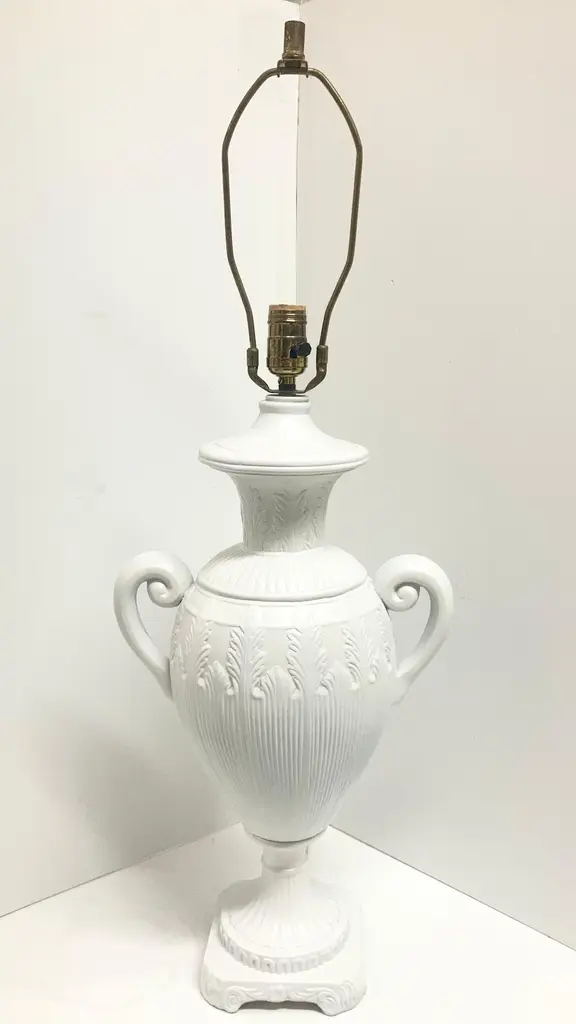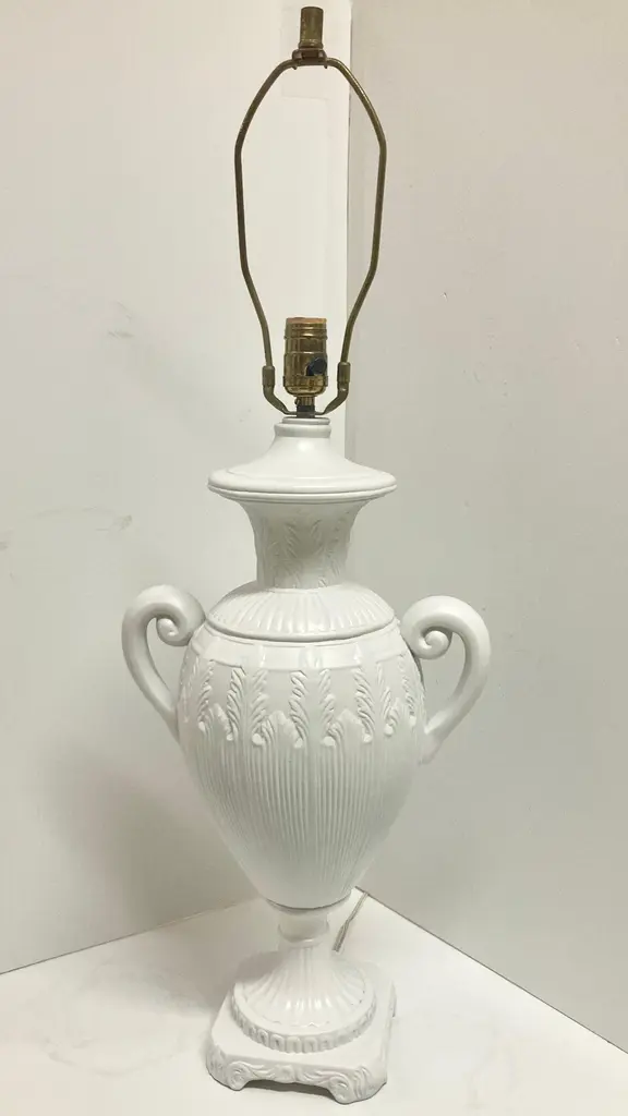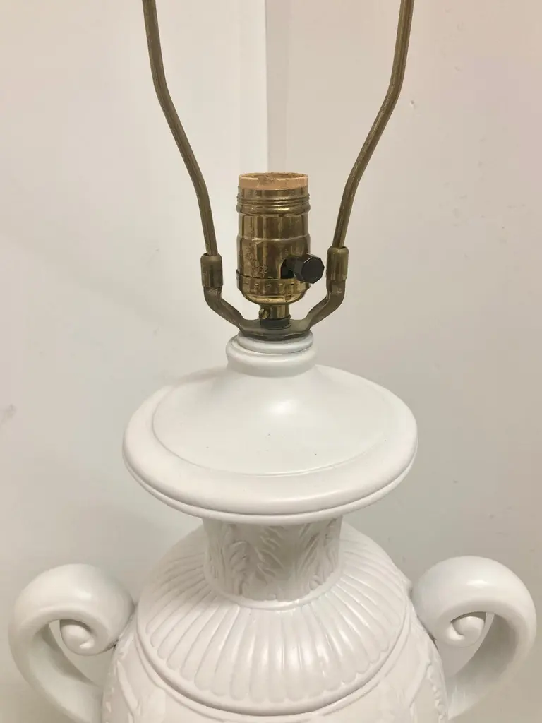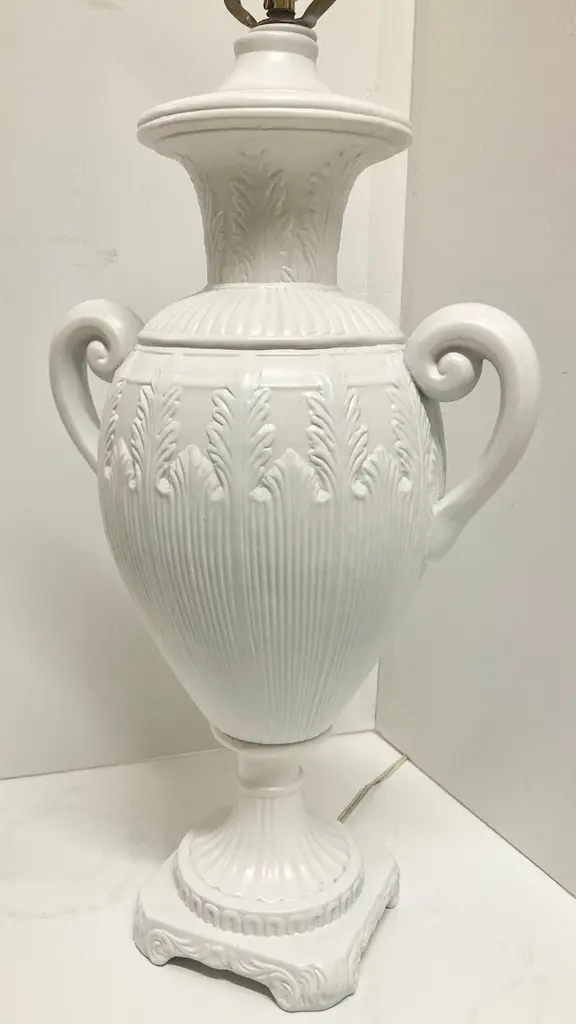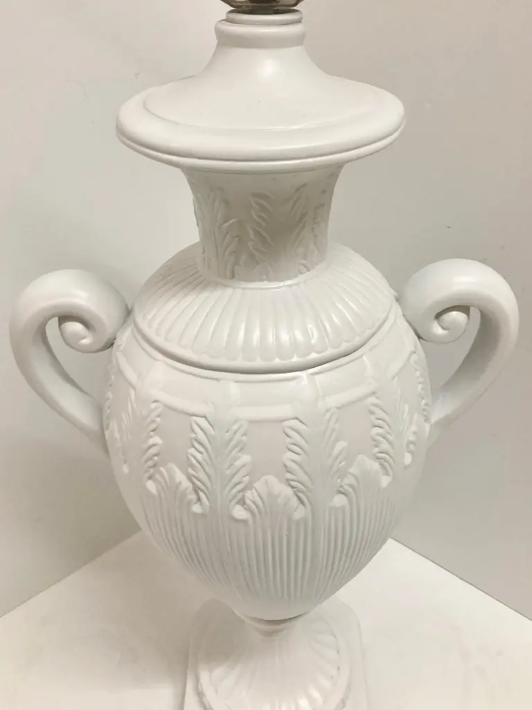 Gorgeous Hollywood Regency ceramic urn table lamp in fresh white lacquered finish. Wonderful neoclassical design. Add some architecture to your home or project. Just add your favorite shade style. We have 2 available, so buy both and have a fabulous pair.